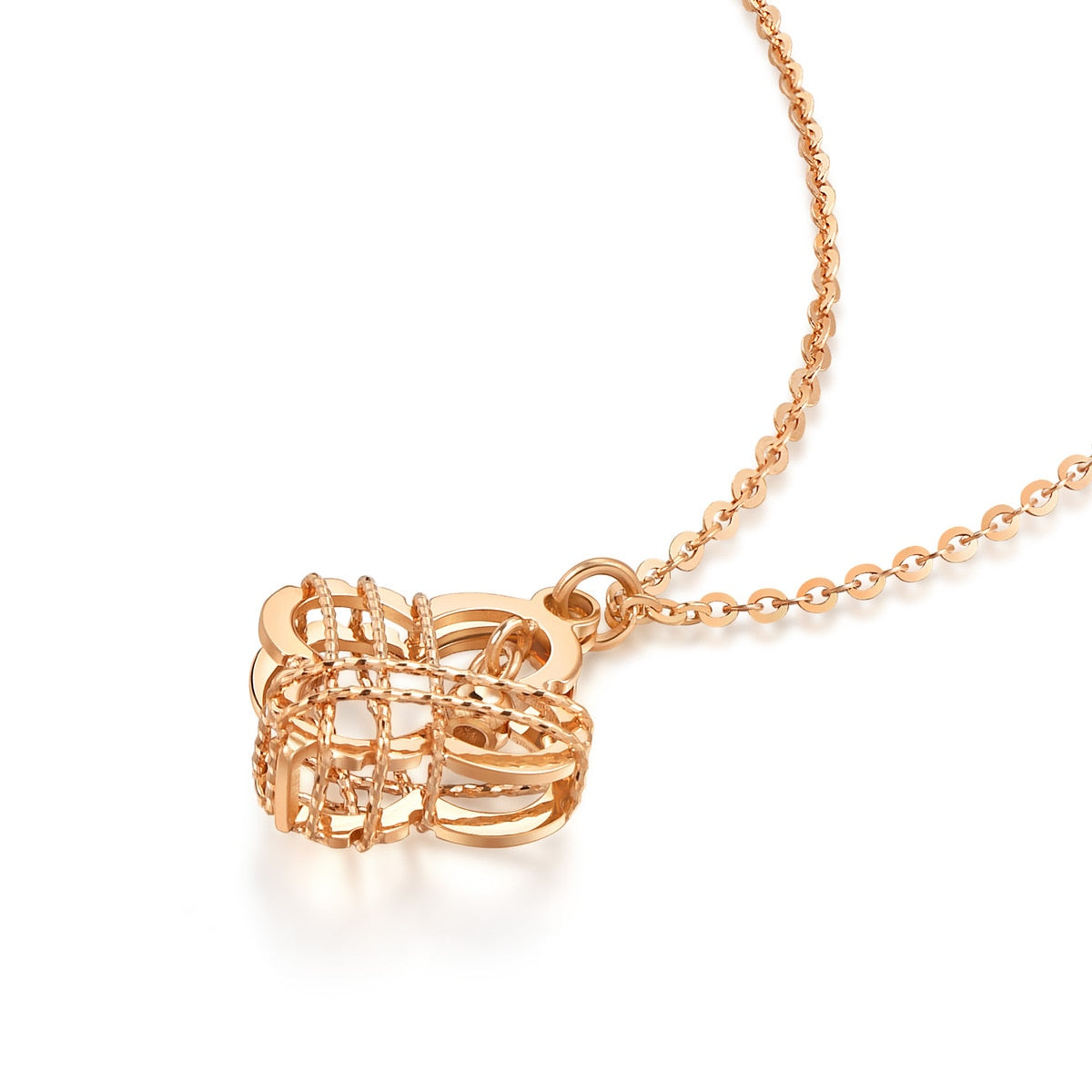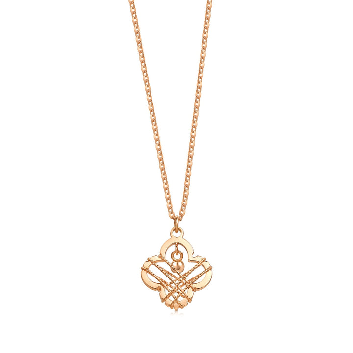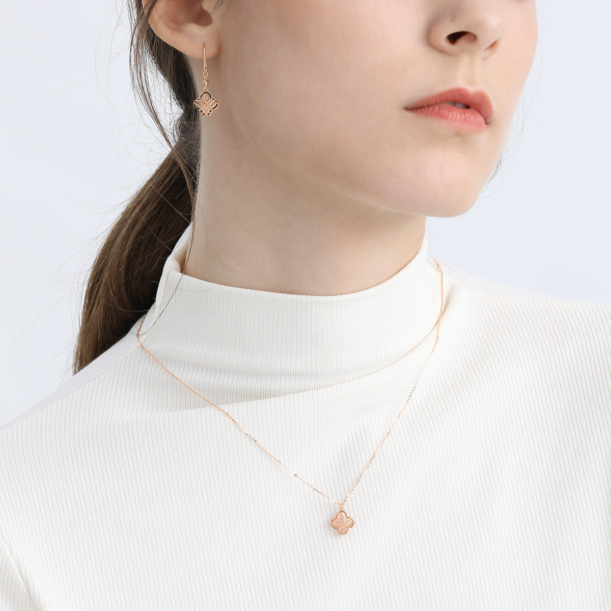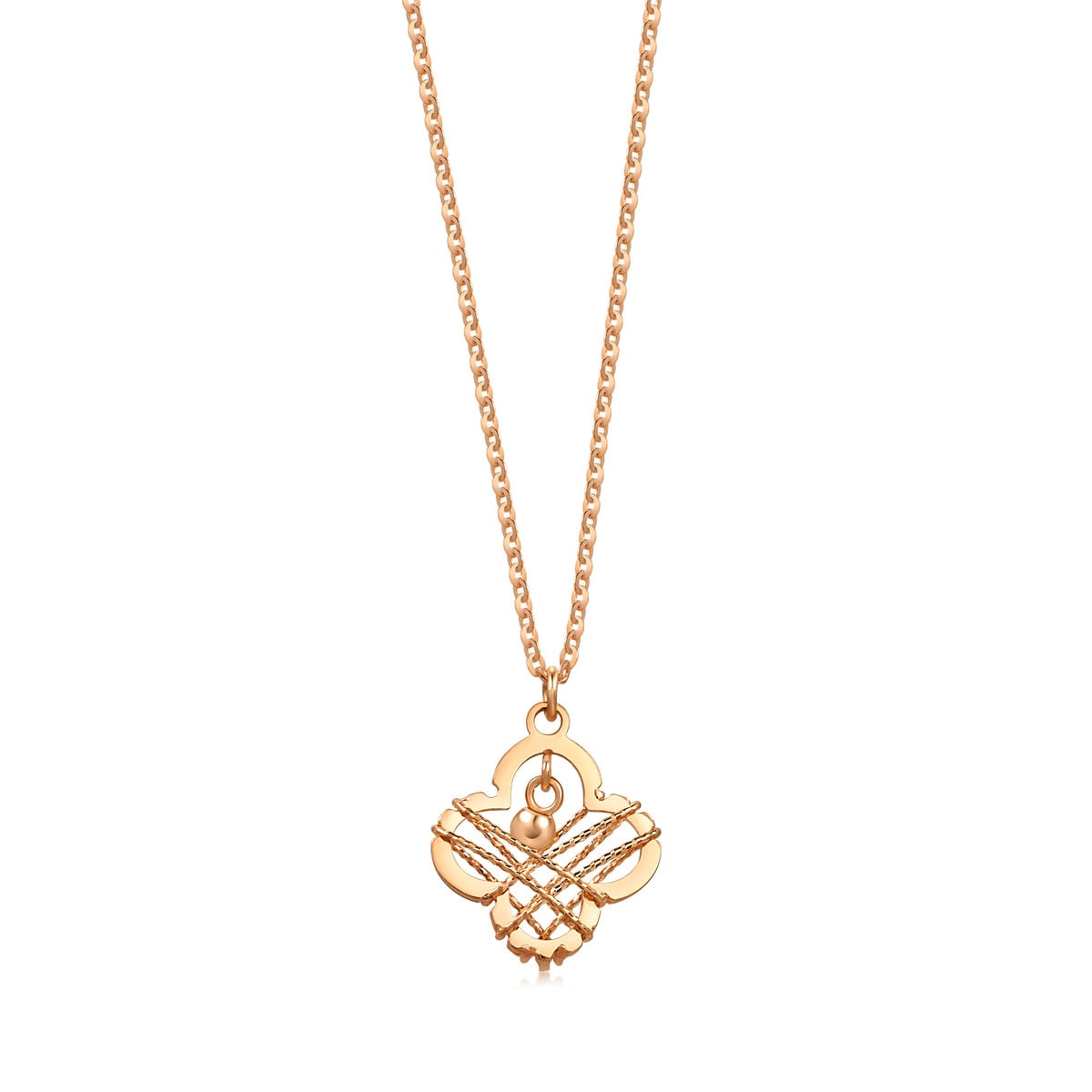 This 18K Rose Gold Necklace by Chow Sang Sang is inspired by the four-leaf clover, a symbol of luck. The hollow-carved design is formed by engraved lines, and a tiny bead swings gracefully at the center, adding a touch of sophistication to any look.