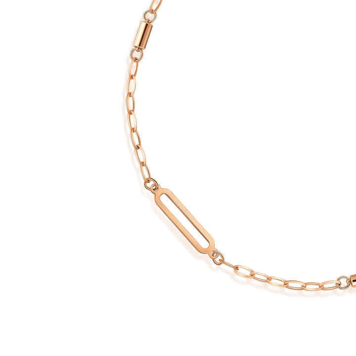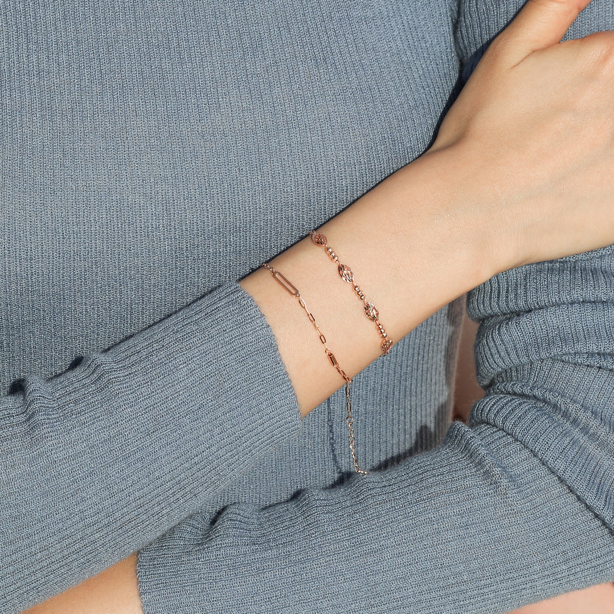 This 18K Rose Gold Bracelet by Chow Sang Sang showcases a minimalist and graceful style with a perfect match of hollow-carved rectangles and a delicate cable chain. Ideal for adding subtle sophistication to any outfit.