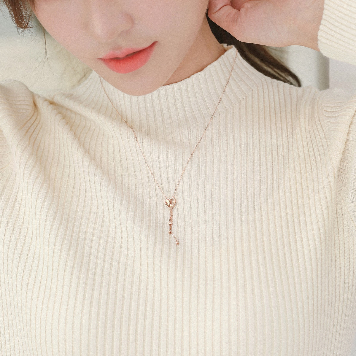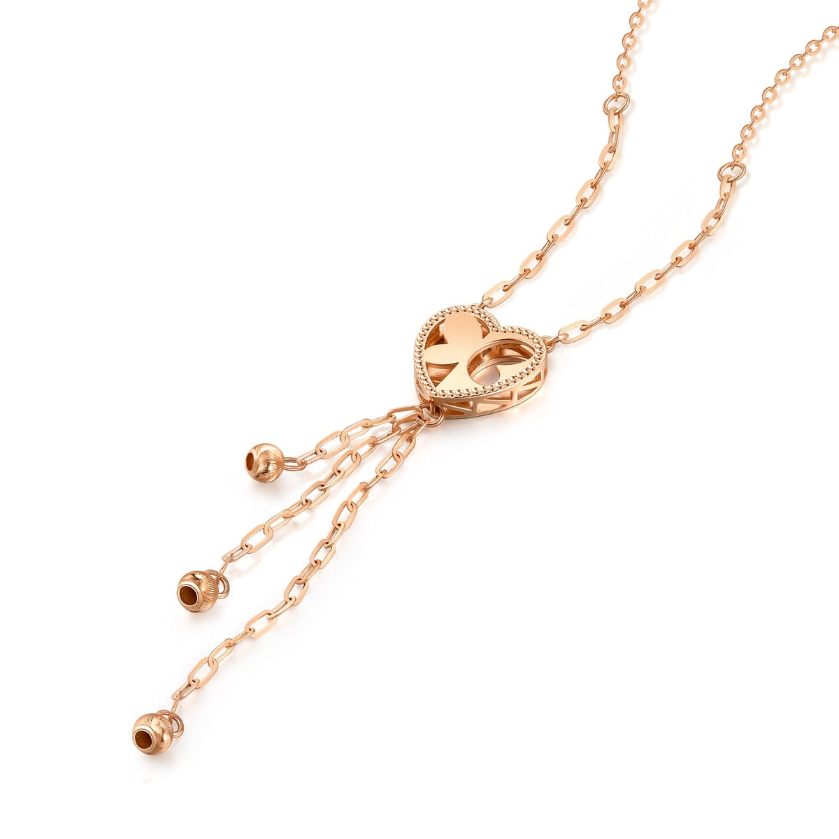 This 18K Rose Gold Necklace by Chow Sang Sang is sweet and romantic, featuring a heart shape outlined with engraved beads and embellished with a centered butterfly. The hollow-crafted wing design adds a delicate touch, while the three long cable chain jackets, tipped with tiny engraved beads, enhance the elegance.
