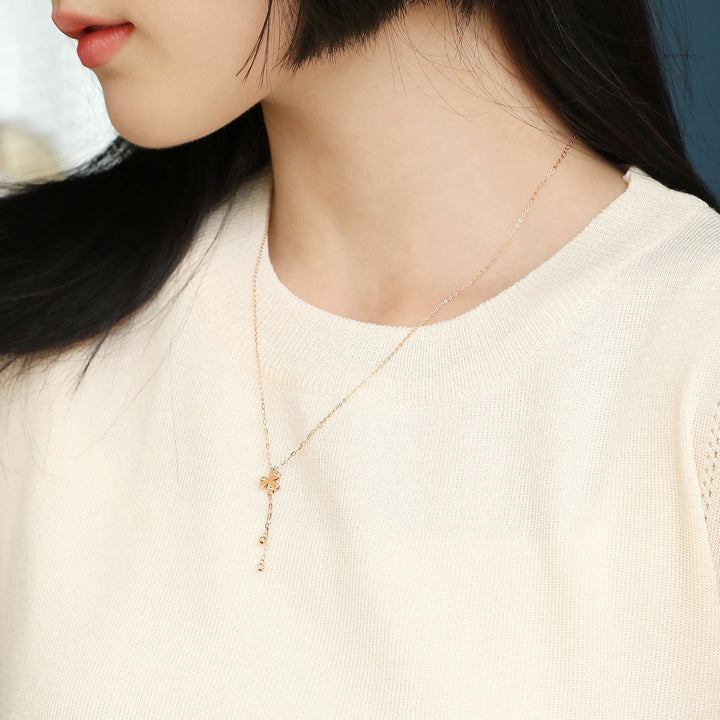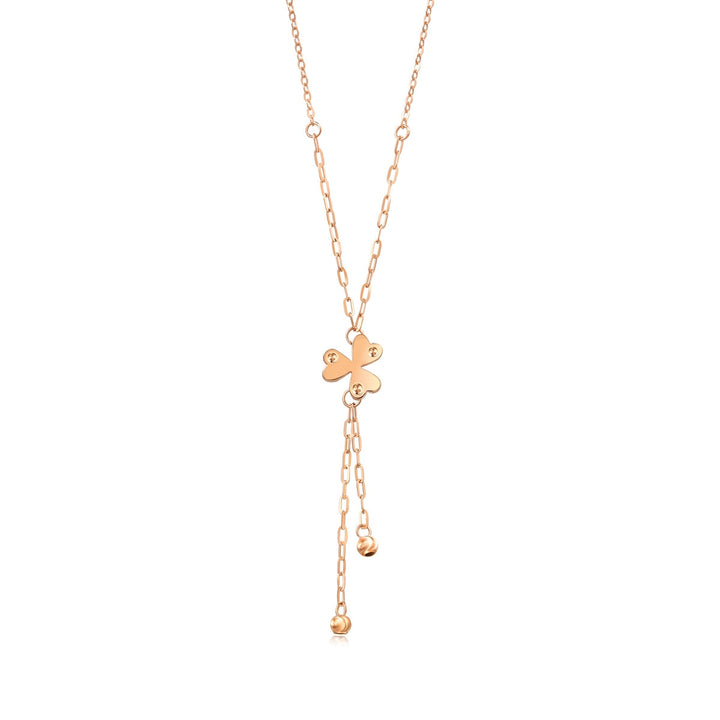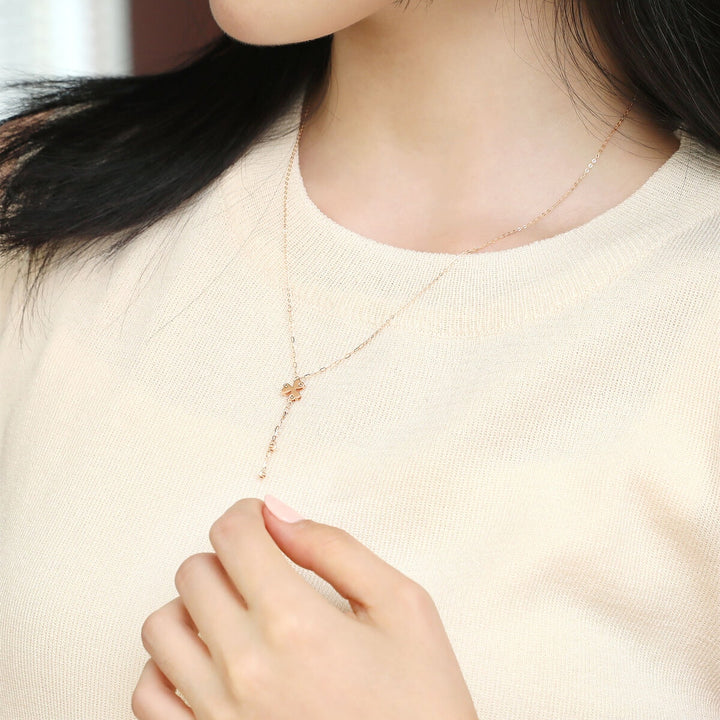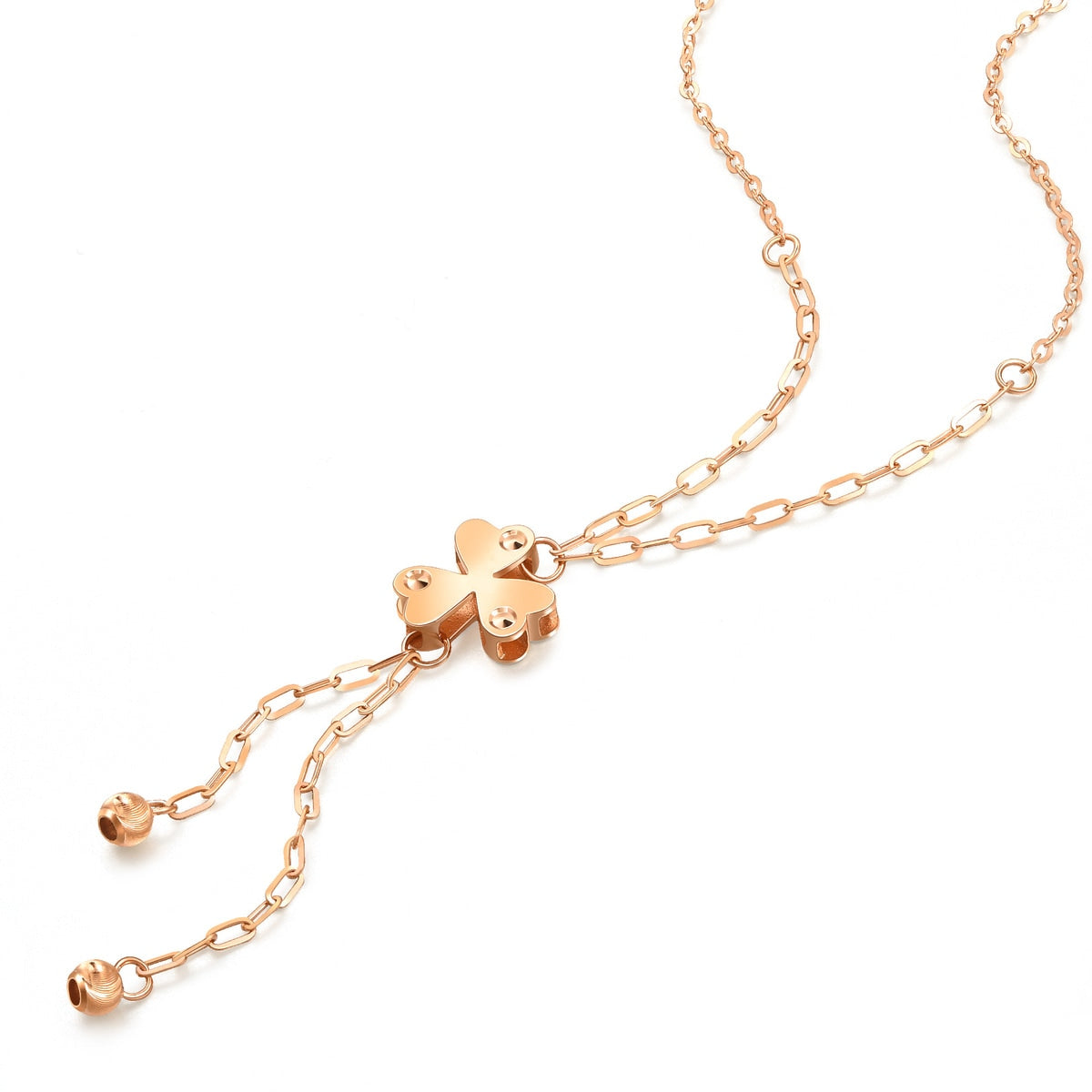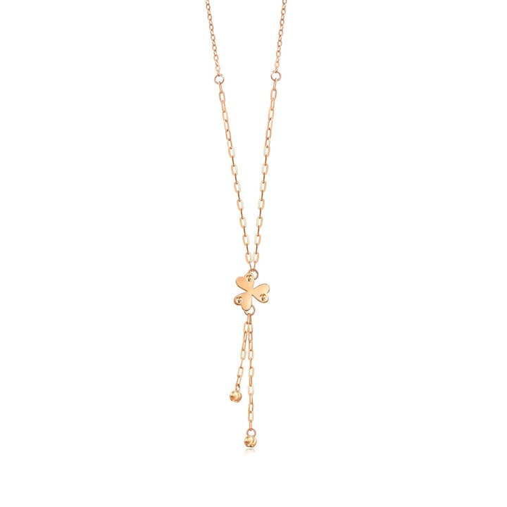 This 18K Rose Gold Necklace by Chow Sang Sang features a delightfully romantic three-leaf clover design. Each leaf is adorned with engraved beads, and the uneven lengths of the three long cable chains, tipped with tiny engraved beads, add a playful charm to this piece.