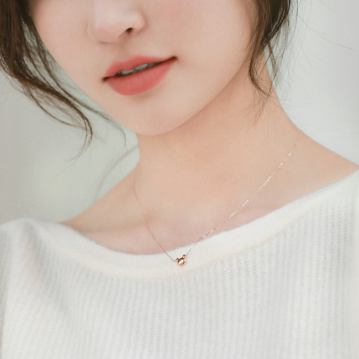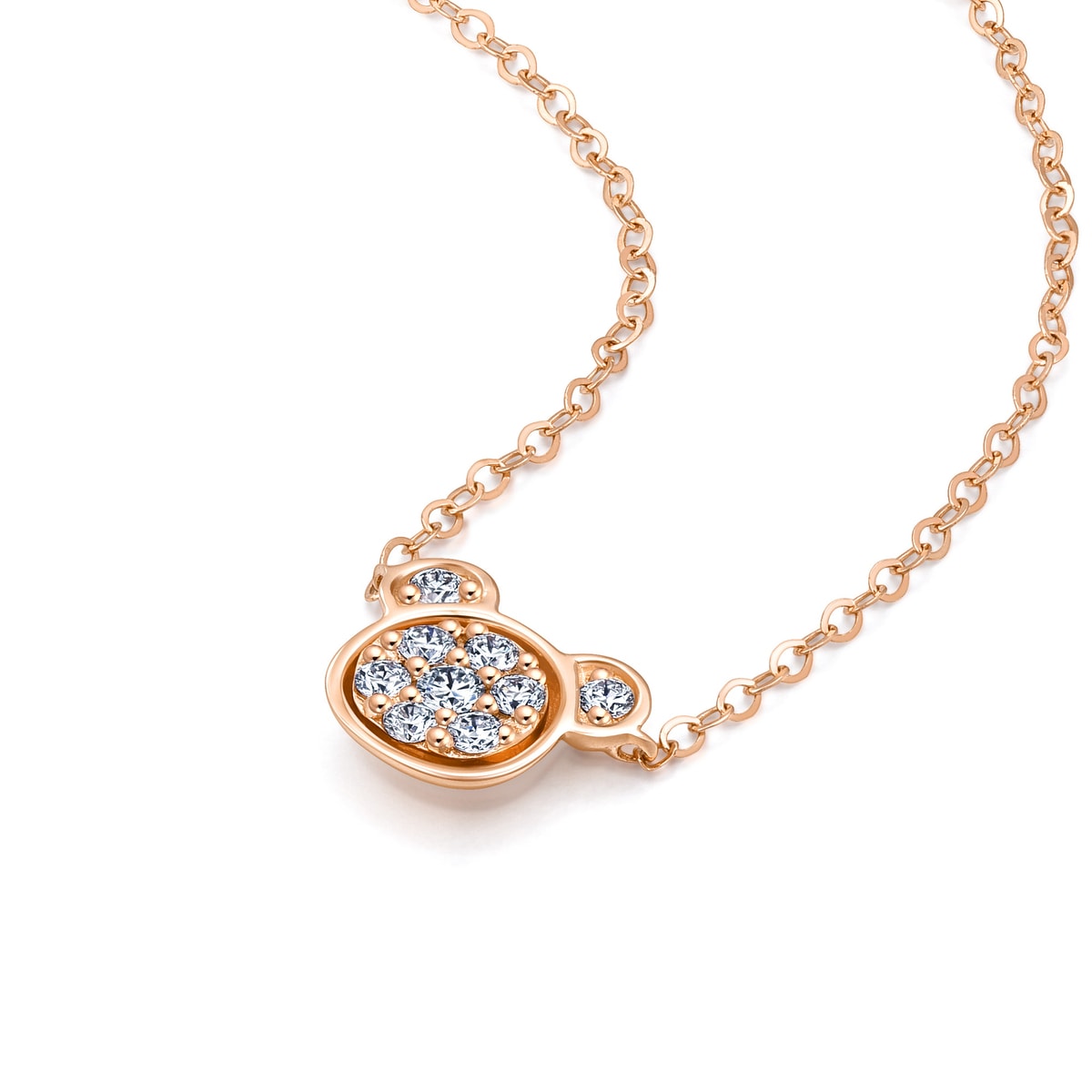 This 18K Rose Gold Diamond Necklace by Chow Sang Sang features an adorable bear motif, traced with fine brilliant diamonds. The lovely design adds a playful yet elegant touch to any outfit.