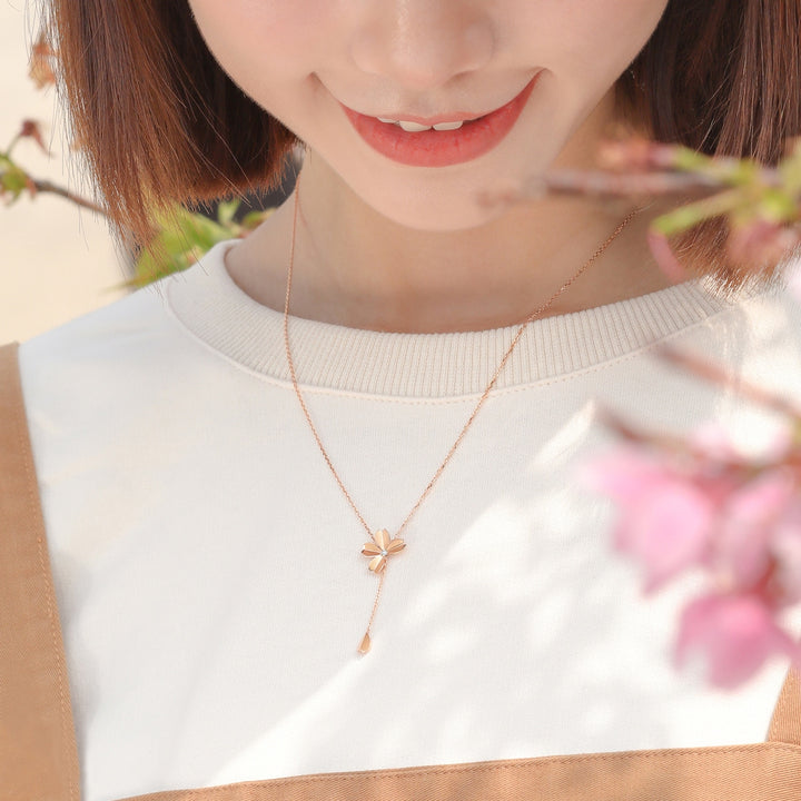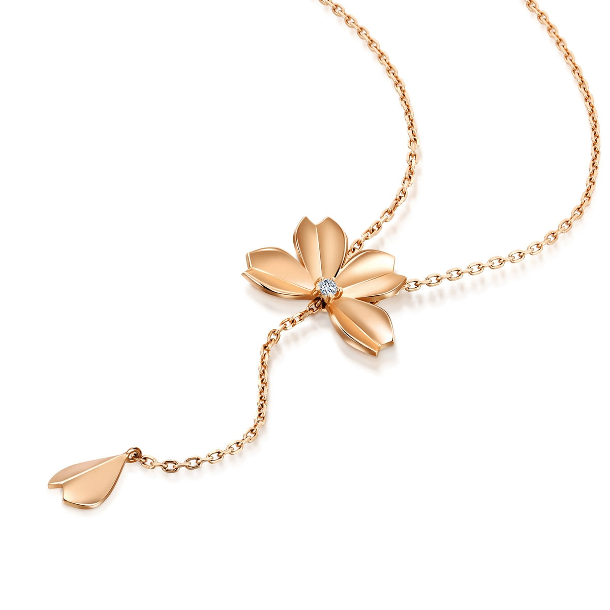 This 'Ryokou' 18K Rose Gold Diamond Necklace by Chow Sang Sang reinterprets the beauty of pure love with its Sakura design. The small round diamonds are delicately set on the stamen, and the three-dimensional origami-style petals add a graceful touch. The long chain is adjustable, allowing the necklace to portray the serene image of floating Sakura in Spring.