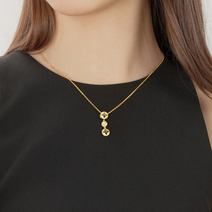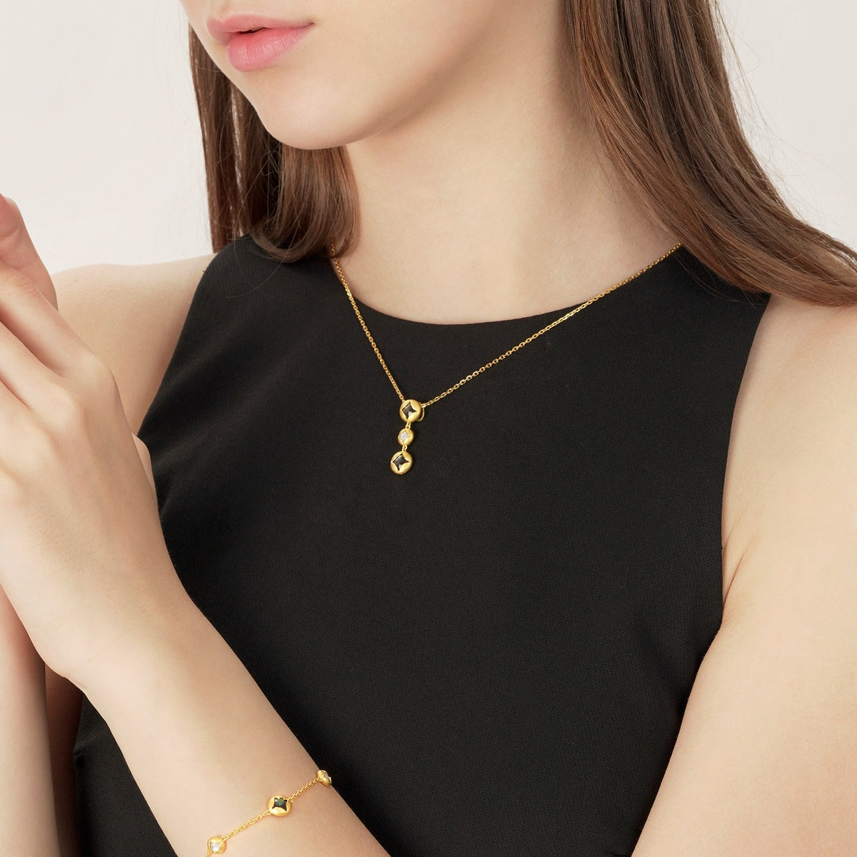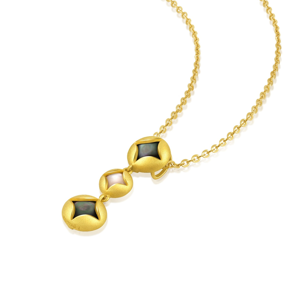 This 'Daily Bliss' 999.9 Gold Pendant by Chow Sang Sang is inspired by the Chinese antique coin and features a semi three-dimensional design with a combination of black and white mother of pearl. Signifying good wealth, this stylish pendant is suitable for daily wear.