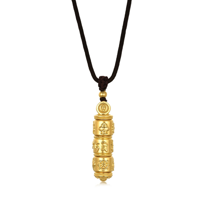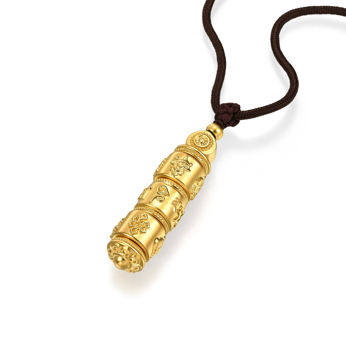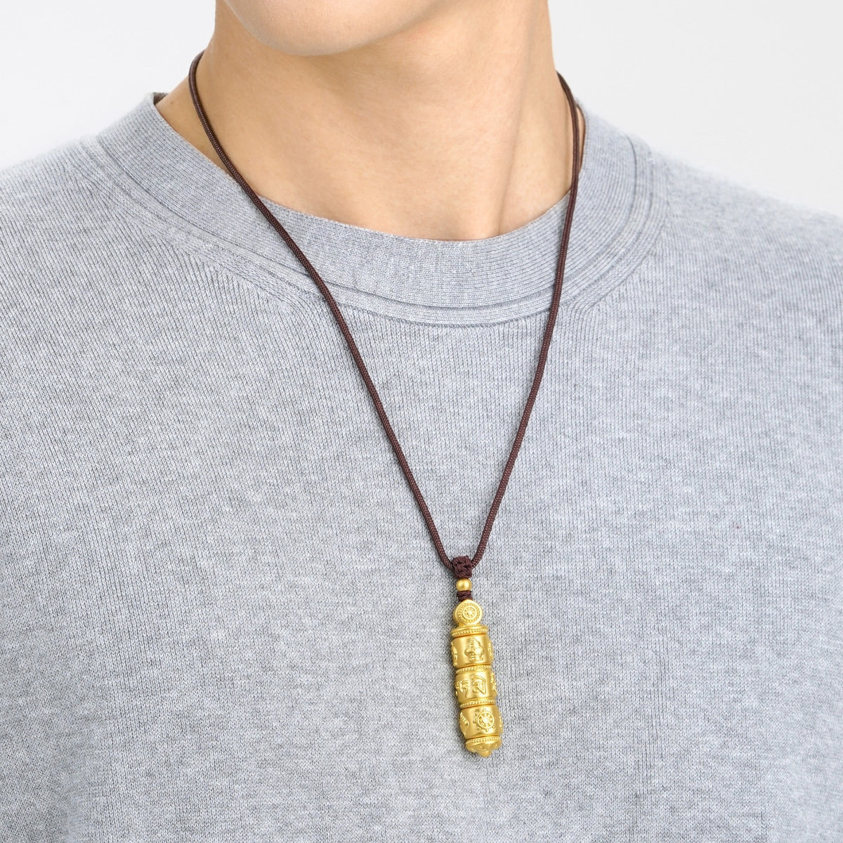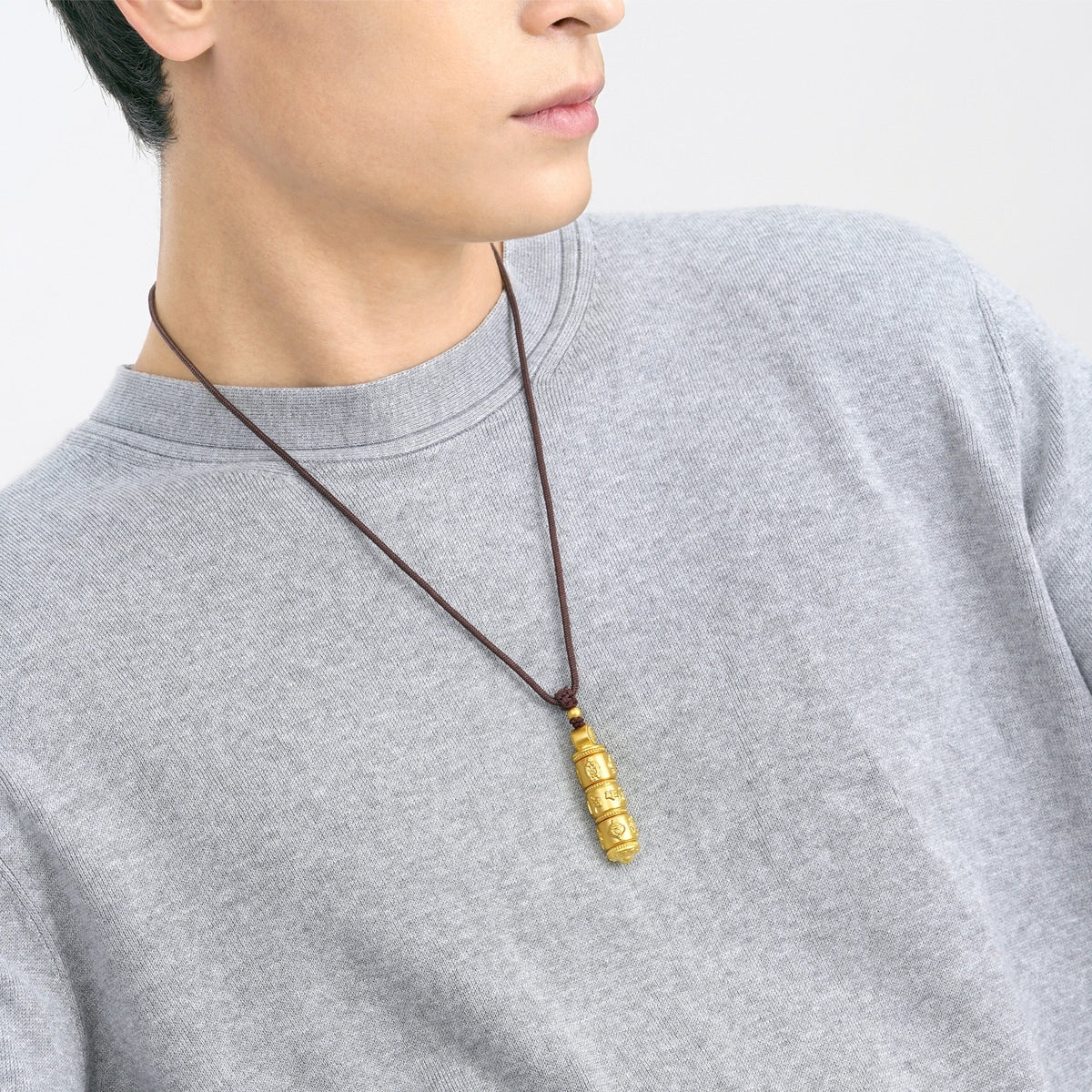 This 'Om Mani Padme Hum' 999 Gold Necklace by Chow Sang Sang takes its design cues from the Tibetan Buddhist prayer wheel. The three-dimensional design features spinnable wheels engraved with the six-character mantra and the “eight mascots,” representing peace and luck.