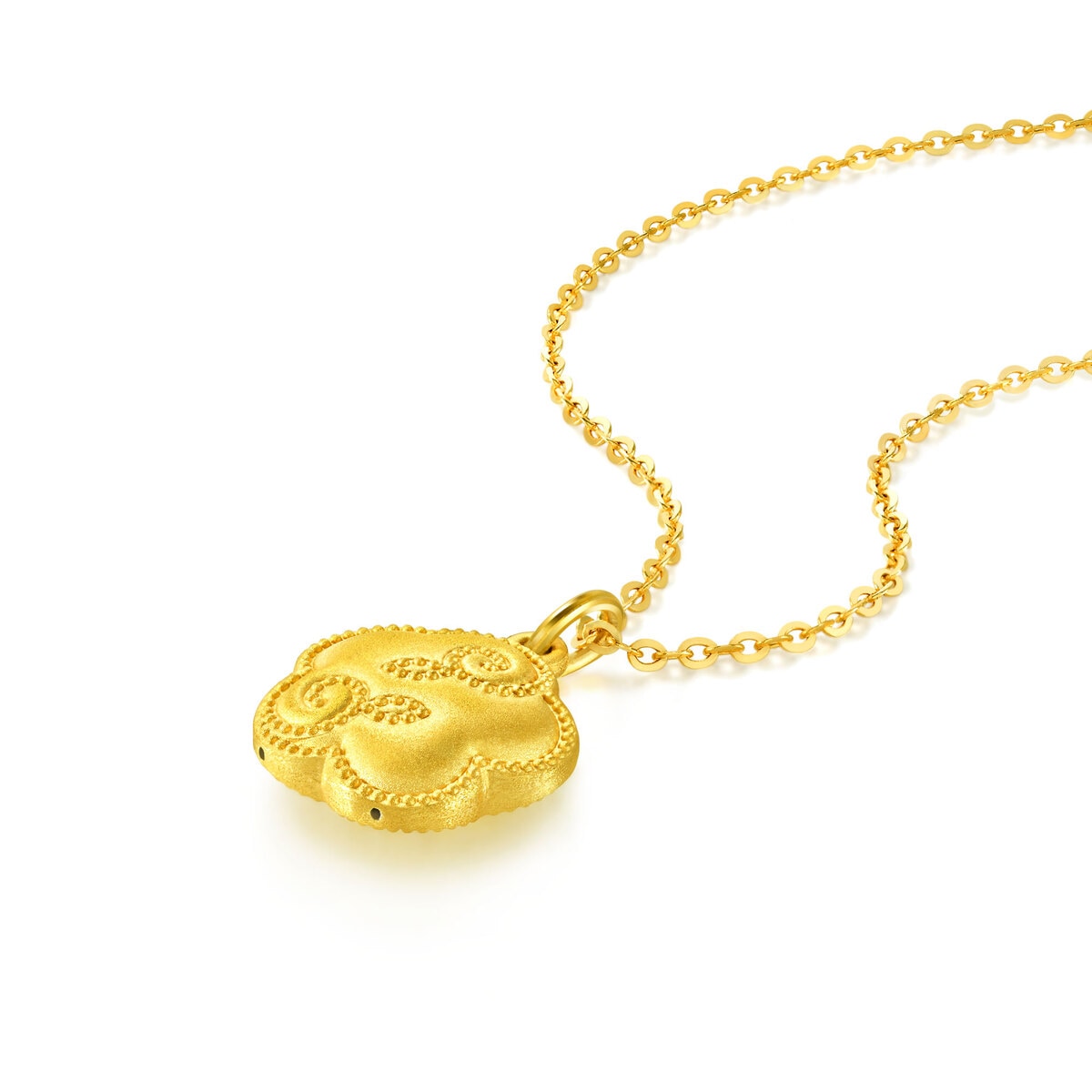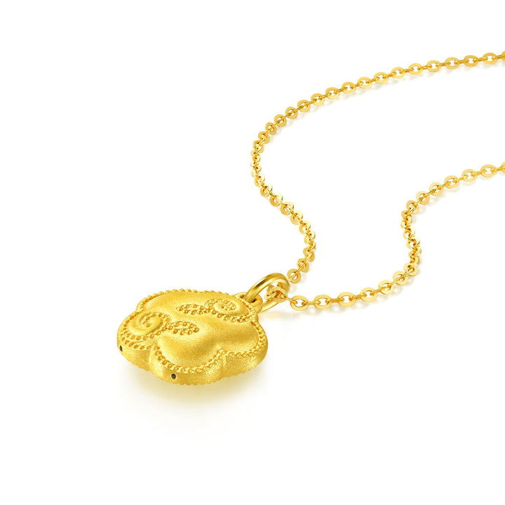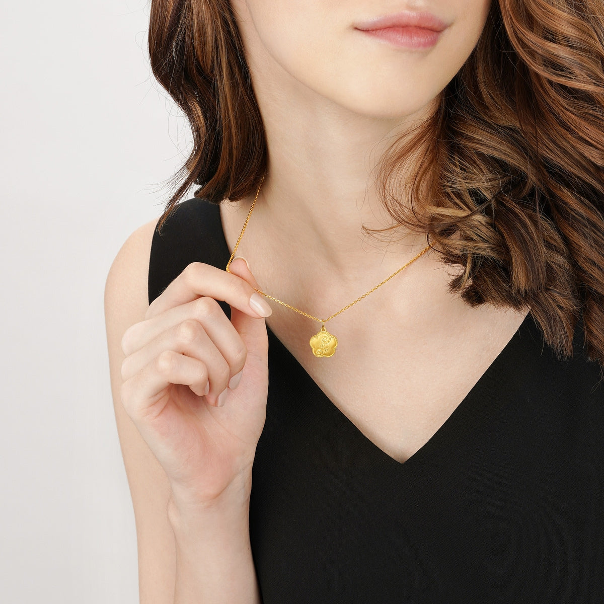 This 'Daily Bliss' 999.9 Gold Pendant by Chow Sang Sang features plum blossoms, symbolizing happiness, joy, longevity, success, and peace. The gold pendant is adorned with small beads along the border, creating a plumped and three-dimensional effect for a stylish look.