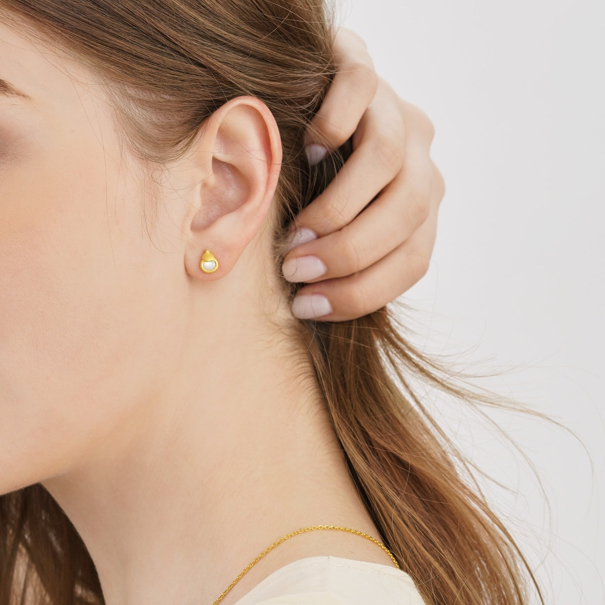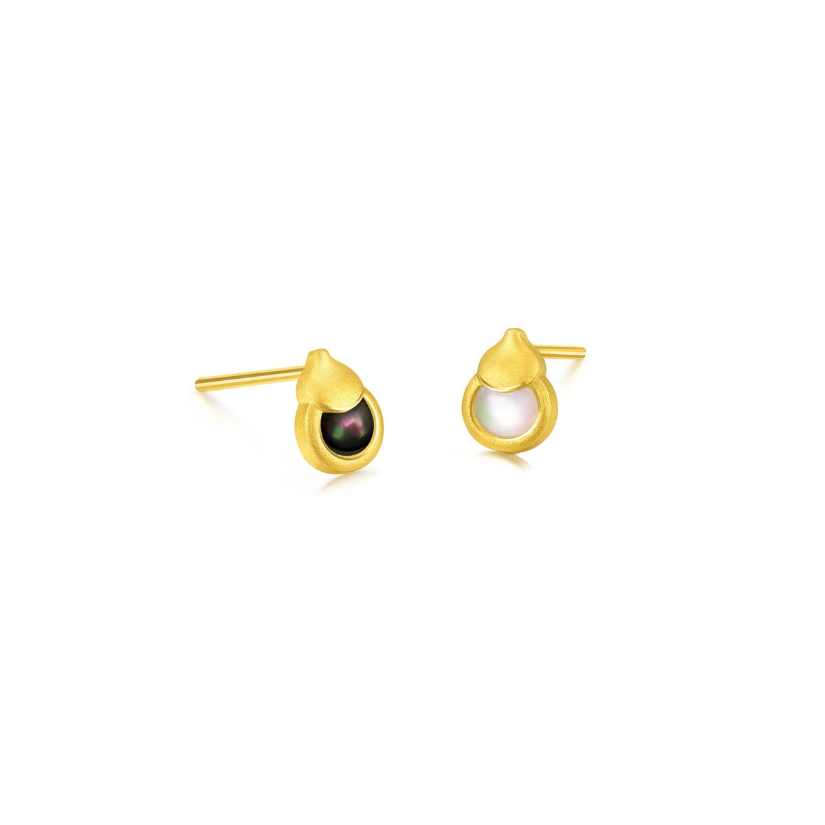 These 'Daily Bliss' 999.9 Gold Earrings by Chow Sang Sang feature gourds, which symbolize prosperity, good fortune, and blessings for health. Adorned with white and black mother of pearl, these earrings offer a stylish contrast and an elegant design.