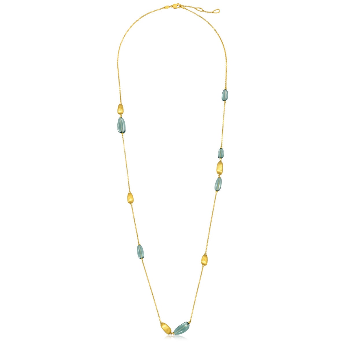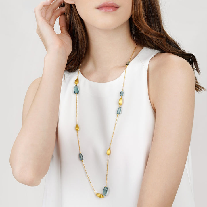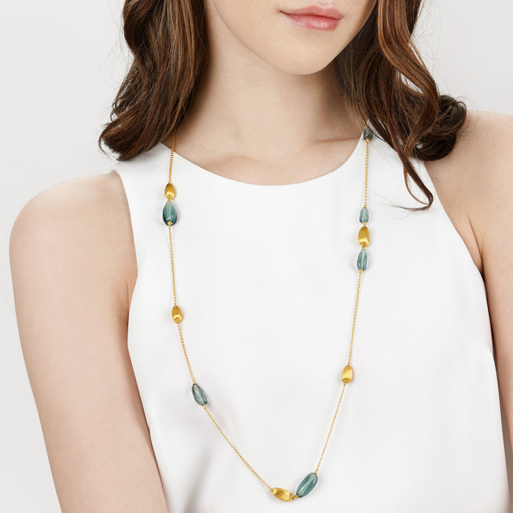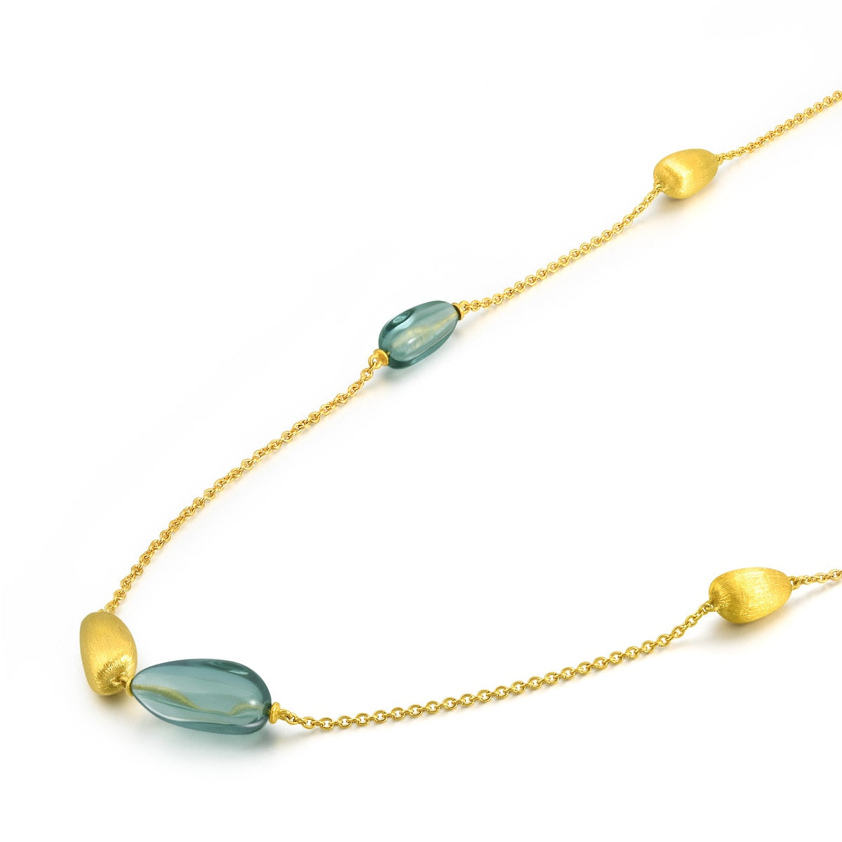 This '999 Gold Necklace' by Chow Sang Sang features an unsymmetrical design with gold and Murano glass decorations in various sizes, offering a spontaneous and stylish look. The vibrant contrast between the mint-colored Murano glass and the sleek gold creates a striking effect, making this necklace a perfect addition to the modern woman’s wardrobe. Each charm is uniquely handcrafted, adding a touch of individuality to the piece.