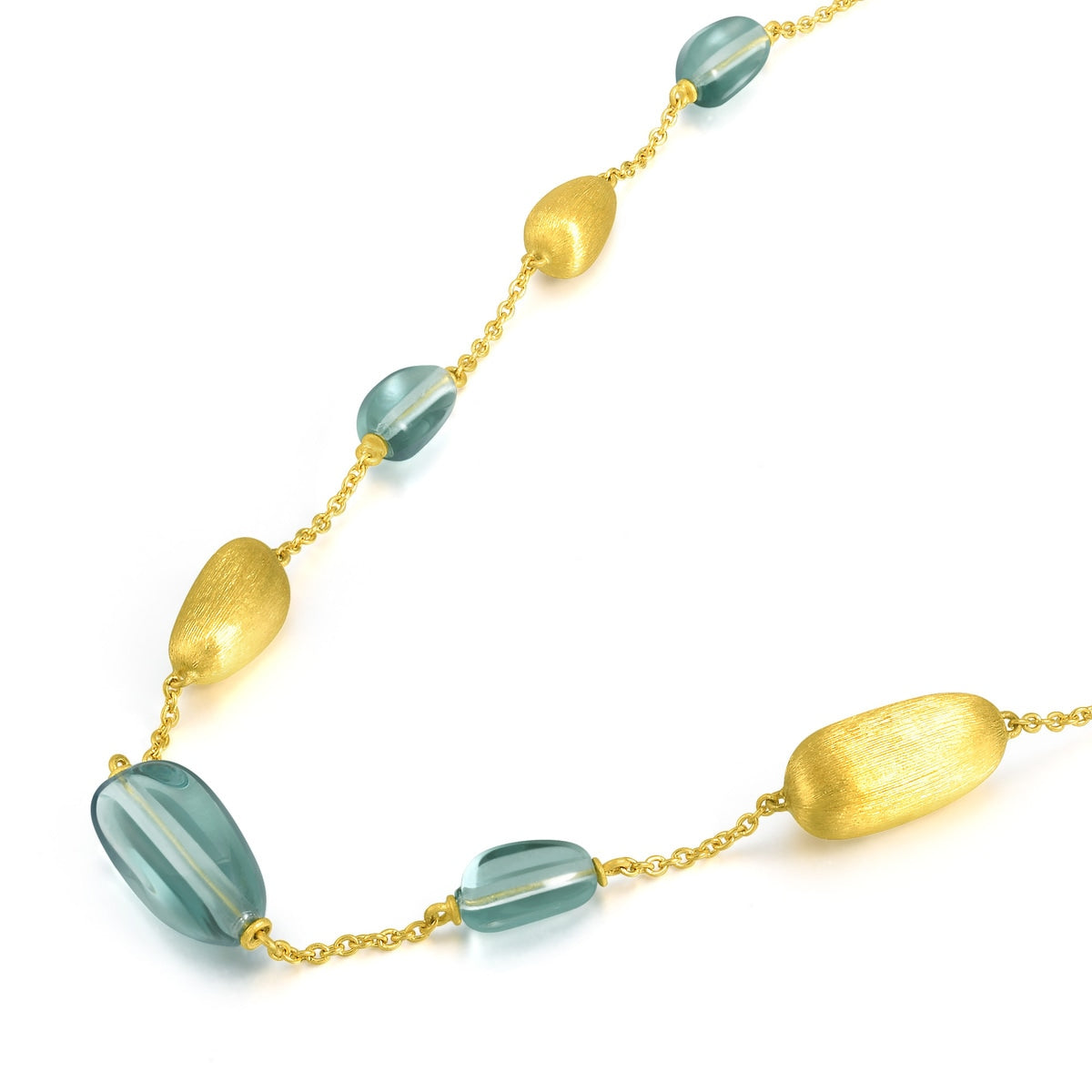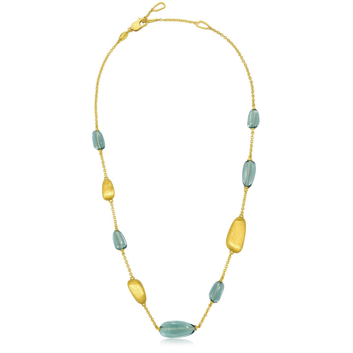 This '999 Gold Necklace' by Chow Sang Sang highlights an unsymmetrical design with gold and Murano glass decorations of different sizes and spontaneous styles. The charming contrast between the mint-colored Murano glass and gold makes it a versatile accessory for everyday fashion. Each handcrafted charm brings a unique, personalized touch to the necklace.