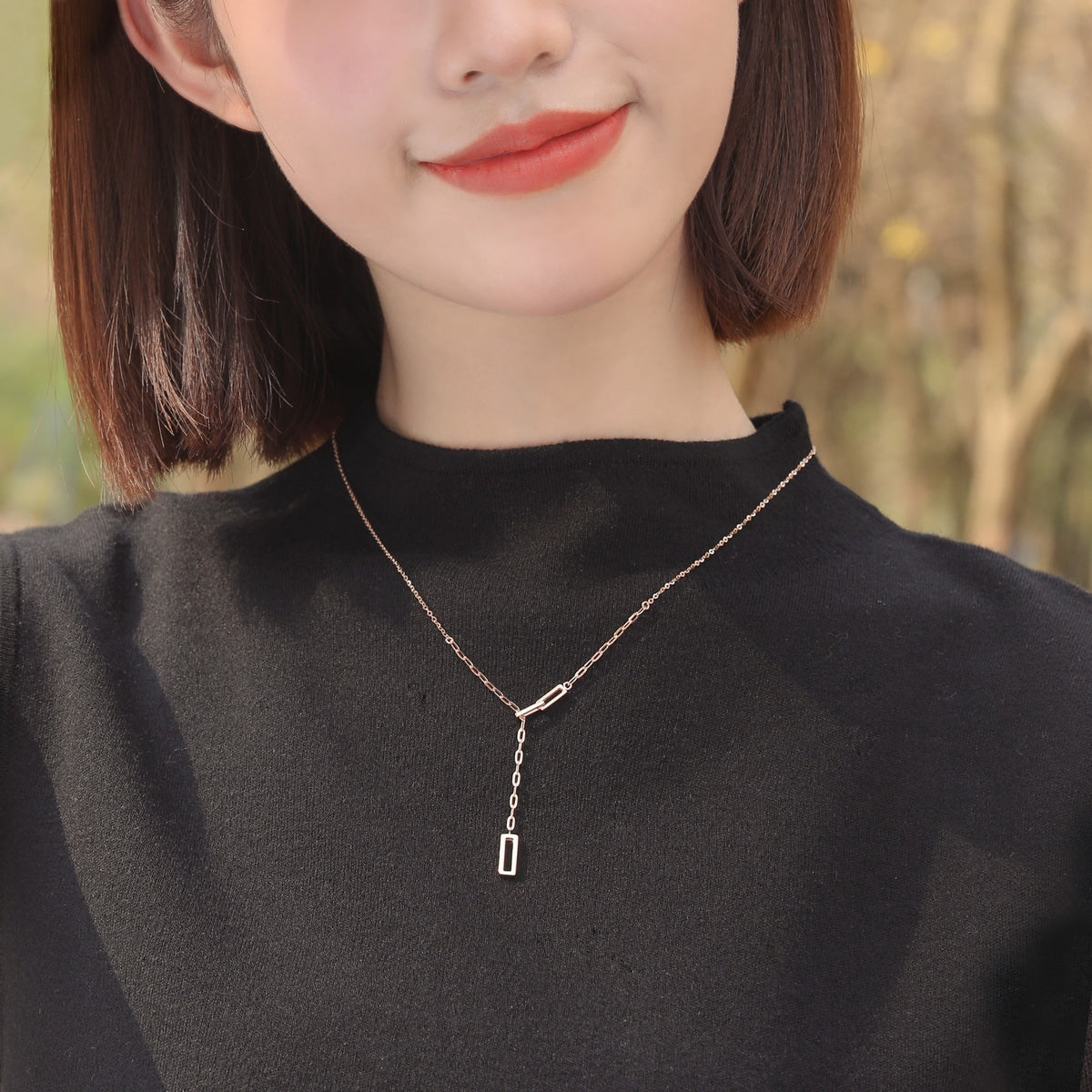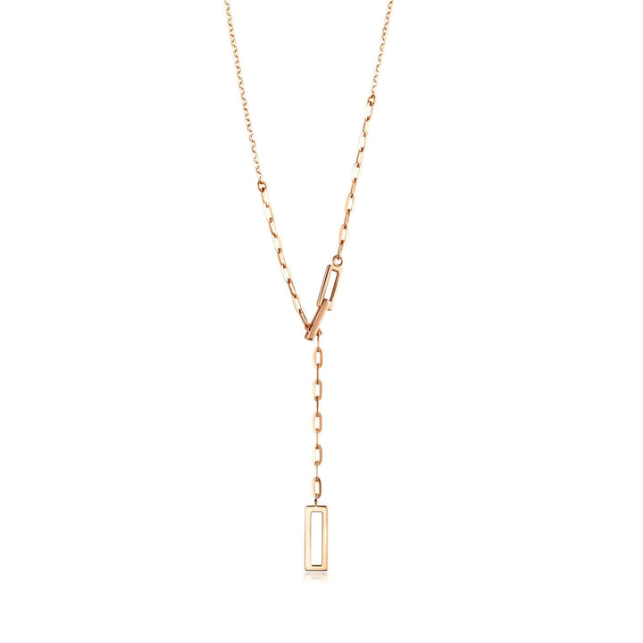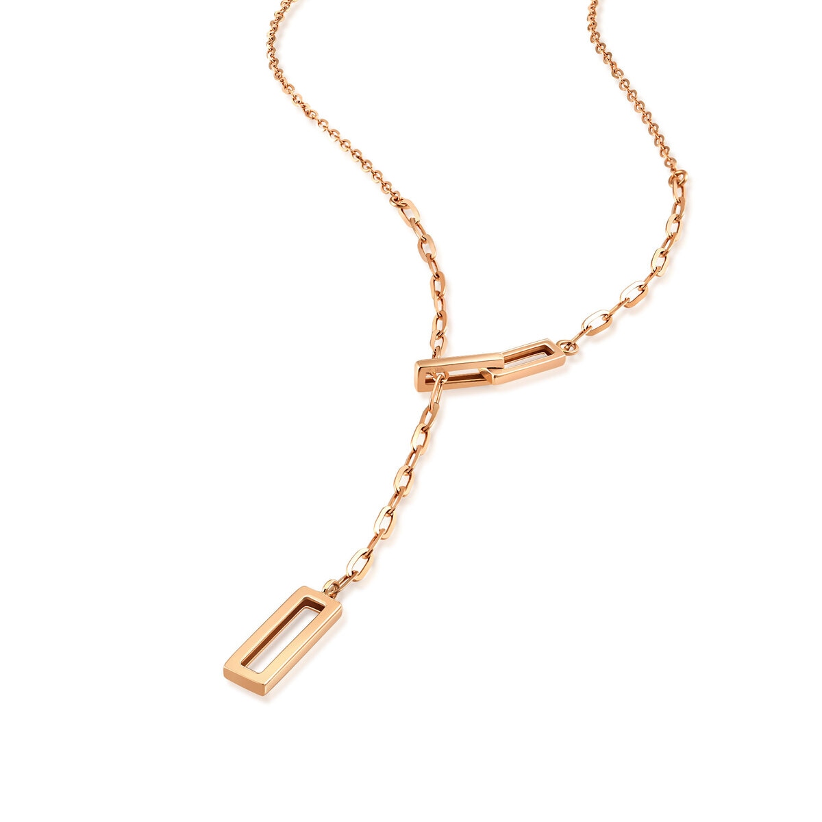 This 18K Rose Gold Necklace by Chow Sang Sang features interwinding rectangles, embodying a stylish and contemporary design. Its simplicity makes it an ideal accessory for the modern woman, adding a touch of elegance to any outfit.