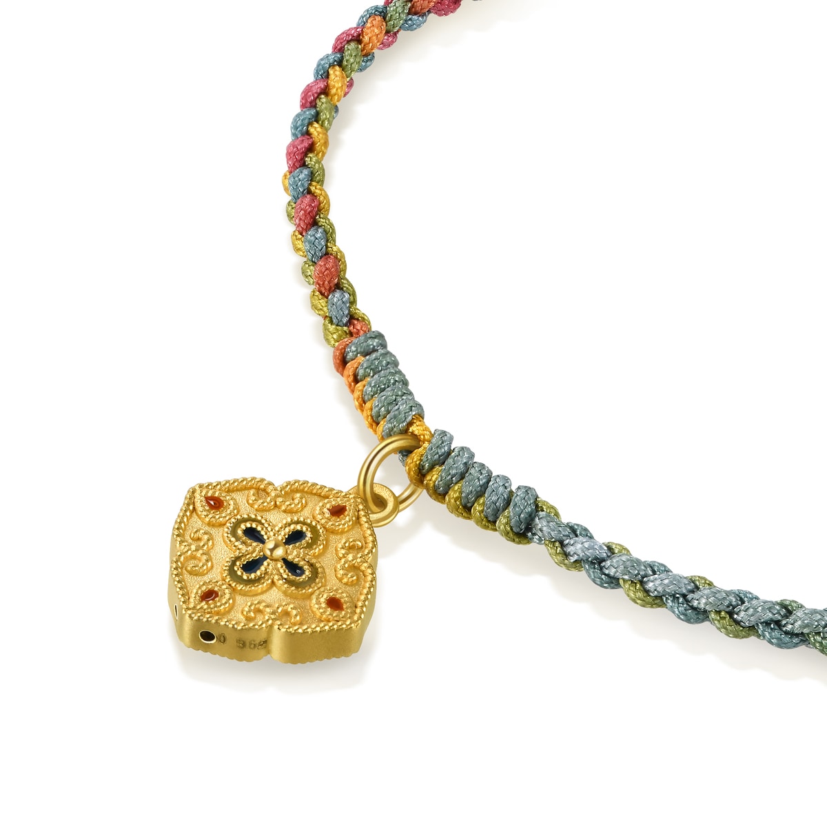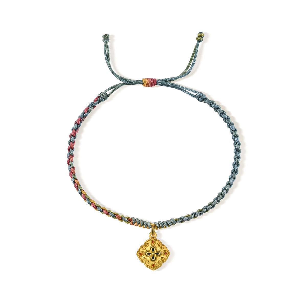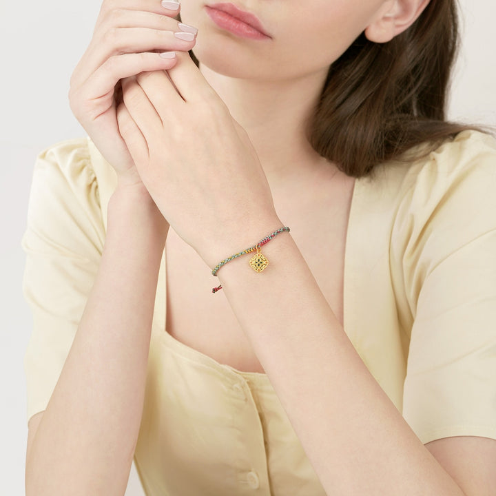 This 'Daily Bliss' 999 Gold Bracelet by Chow Sang Sang is inspired by a blend of Chinese tradition and modern fashion. The Sifang Chinese Ruyi lock is enhanced with a low-temperature enamel coating and delicate bead-set edges, creating a colorful charm and refined layering. Matched with an adjustable five-colored string, it embodies auspicious meanings and brings good luck to the wearer.