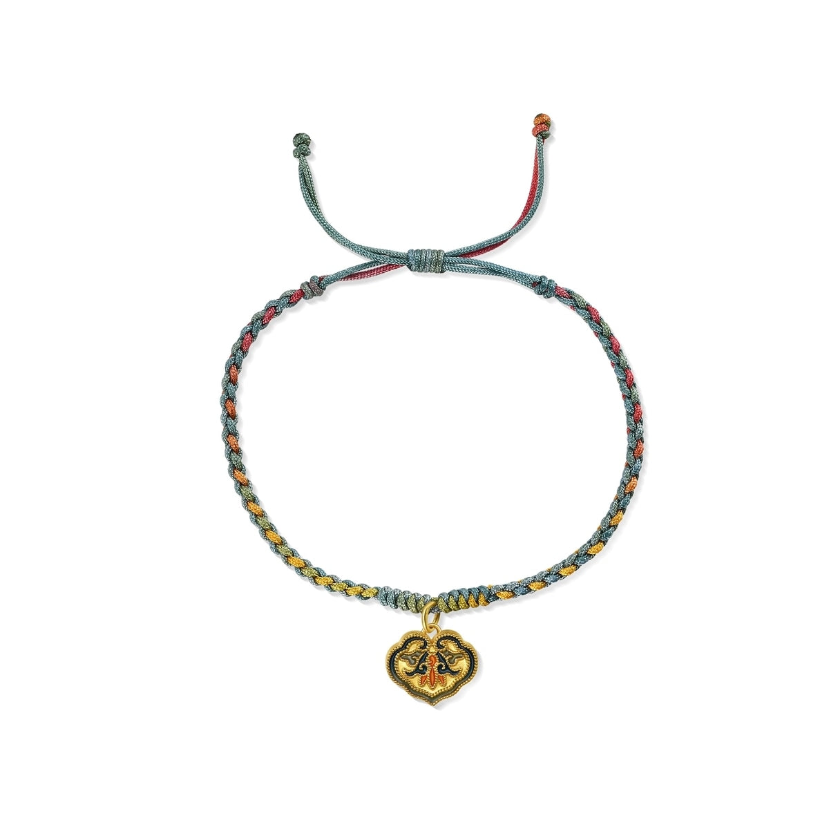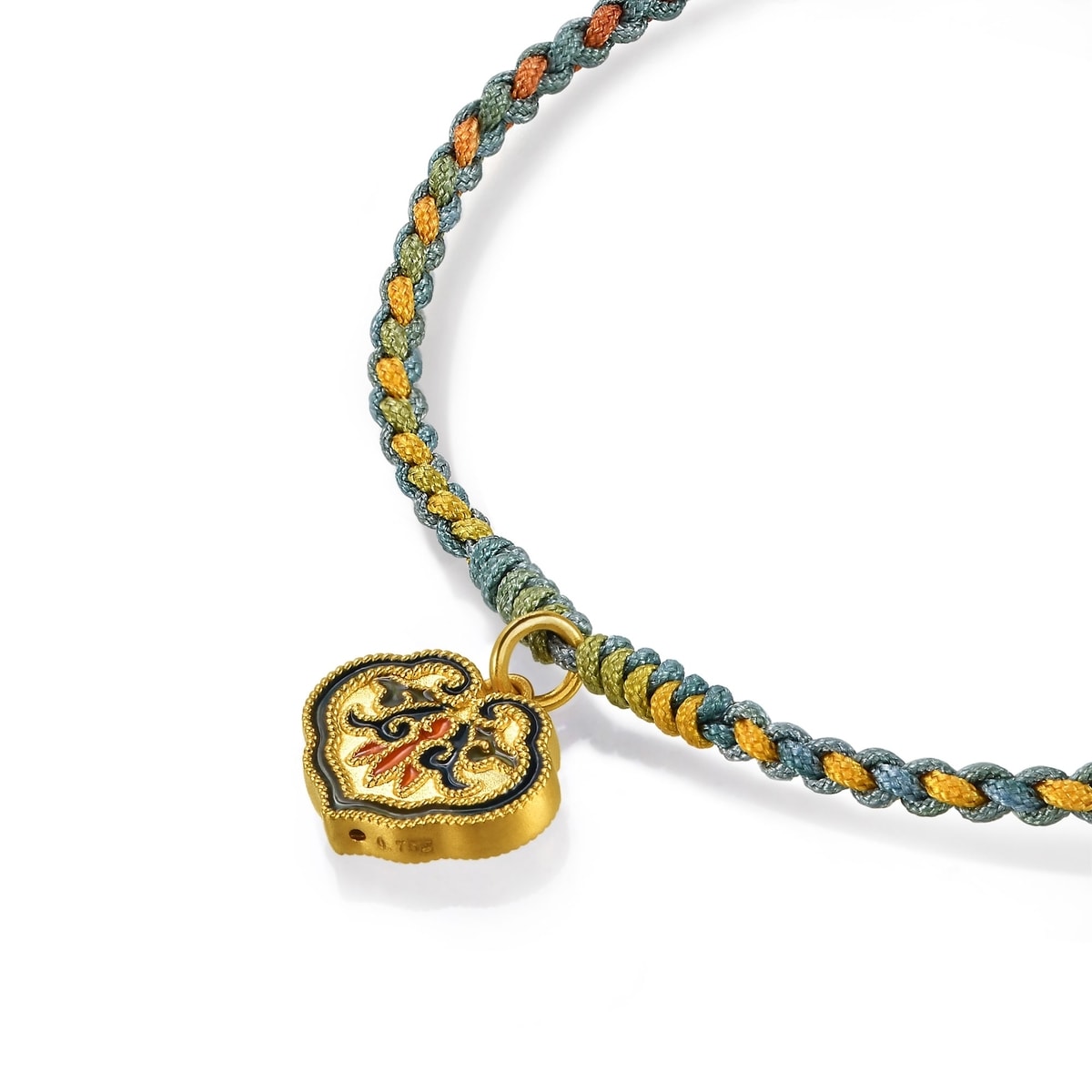 This 'Daily Bliss' 999 Gold Bracelet by Chow Sang Sang showcases the Chinese Ruyi lock design, reflecting a blend of tradition and contemporary style. Enhanced with a low-temperature enamel coating and bead-set edges, this piece offers a colorful charm and refined layering. The adjustable five-colored string represents auspicious meanings and brings good luck to the wearer.