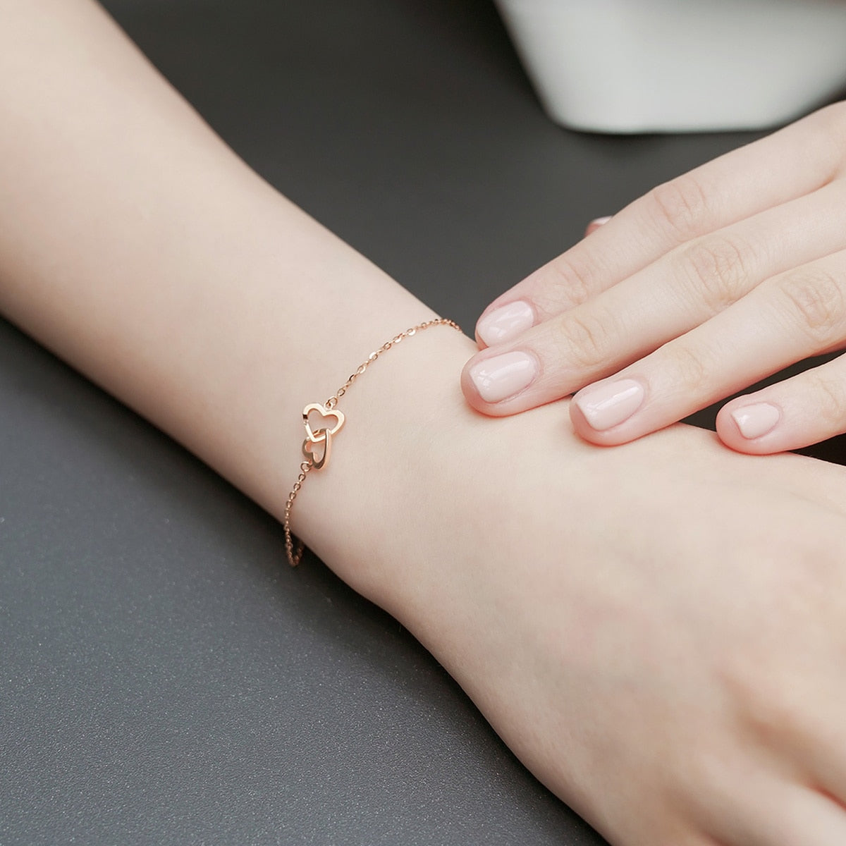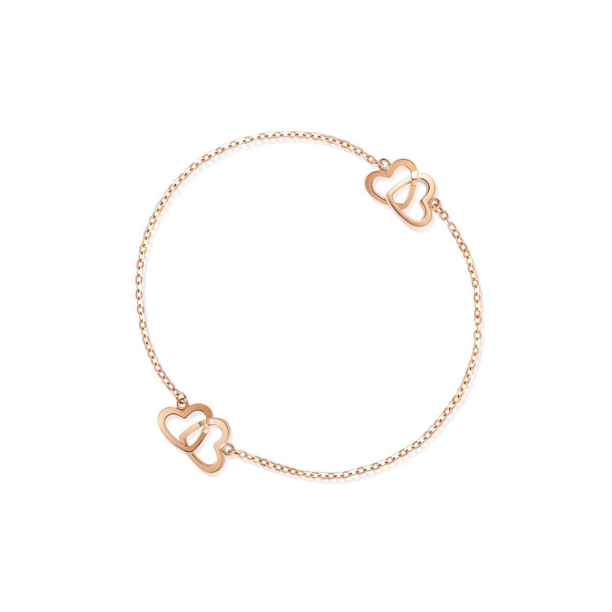 This 18K Rose Gold Bracelet by Chow Sang Sang features hollowed heart shapes, symbolizing the connection between two hearts. Its simple and romantic aesthetic makes it an ideal accessory for daily wear, complementing any look.