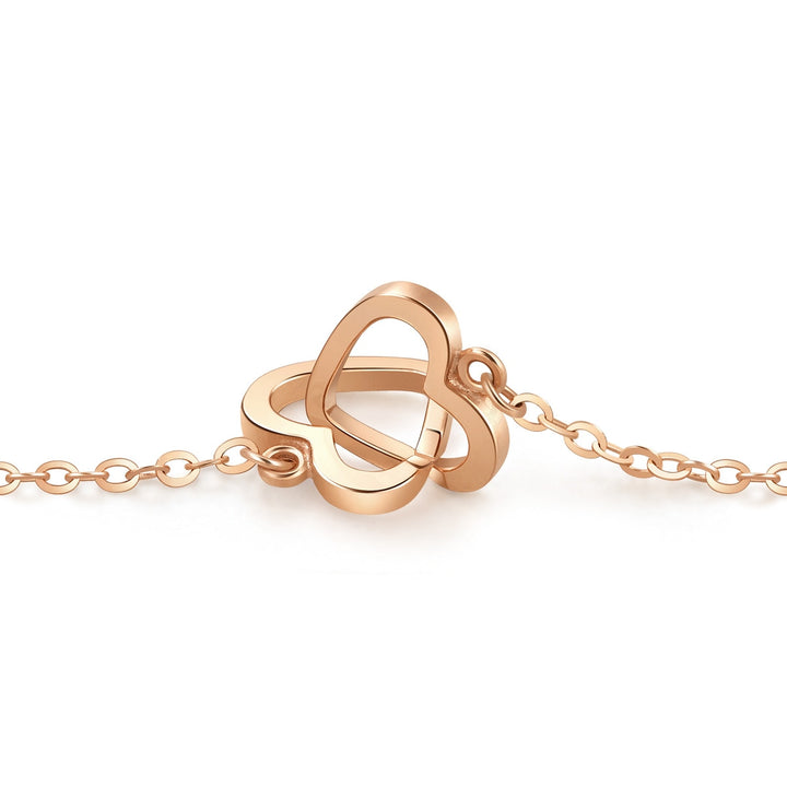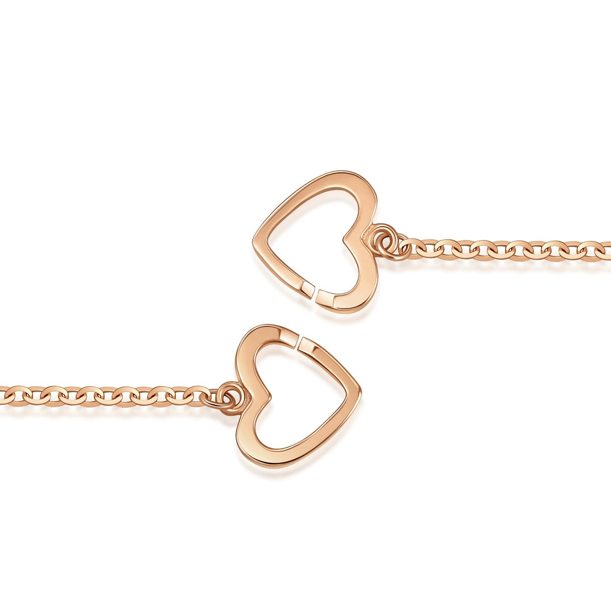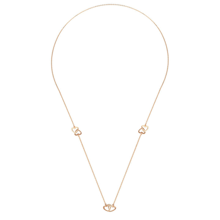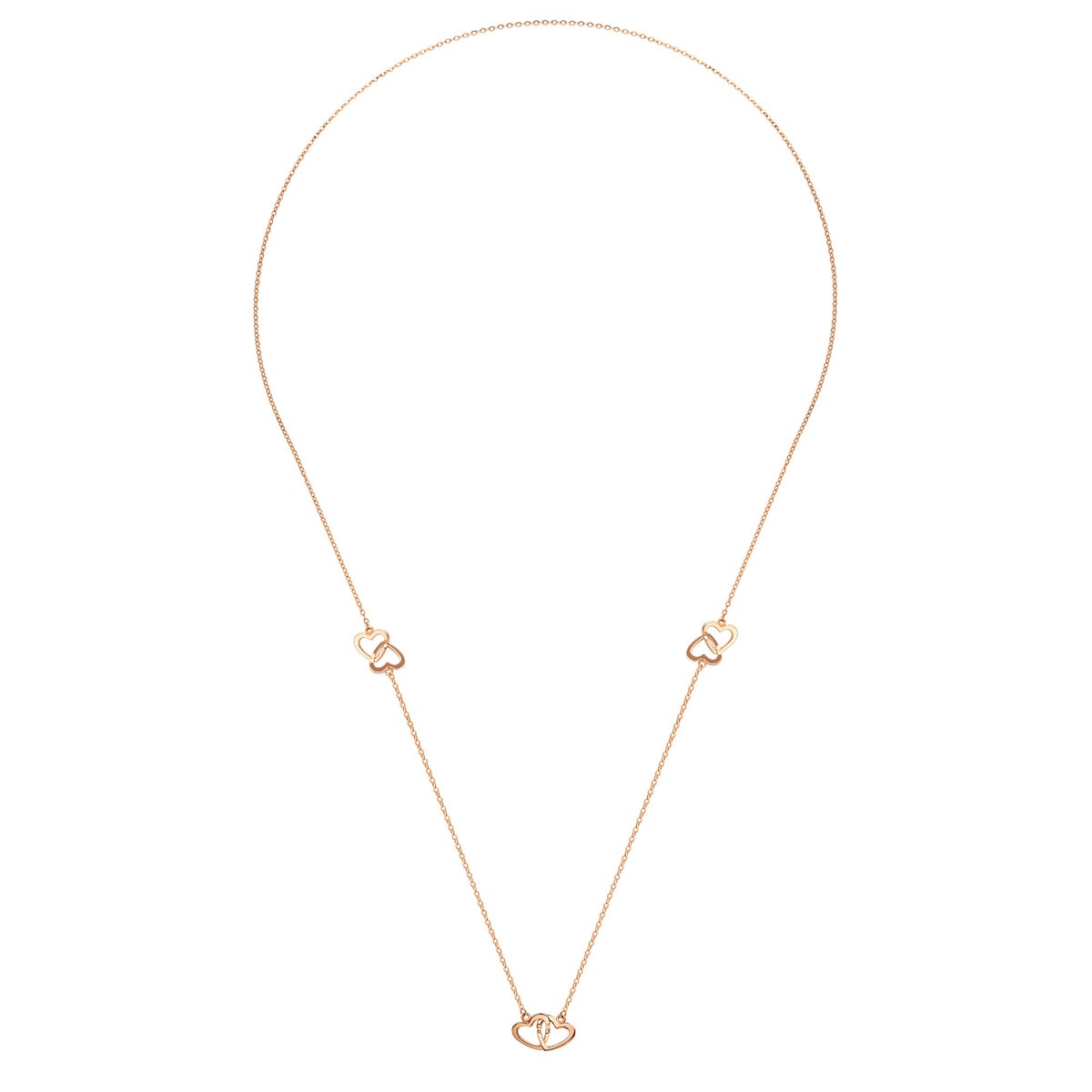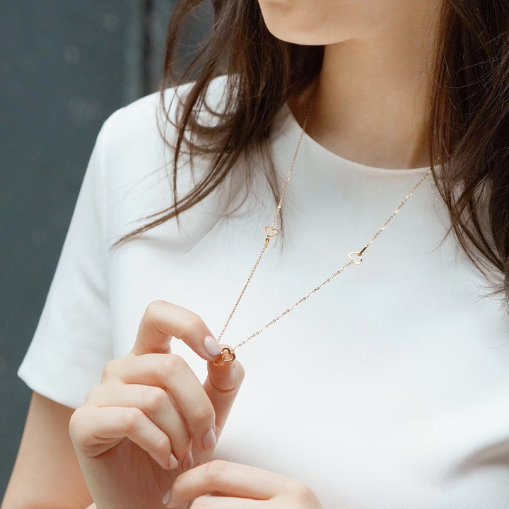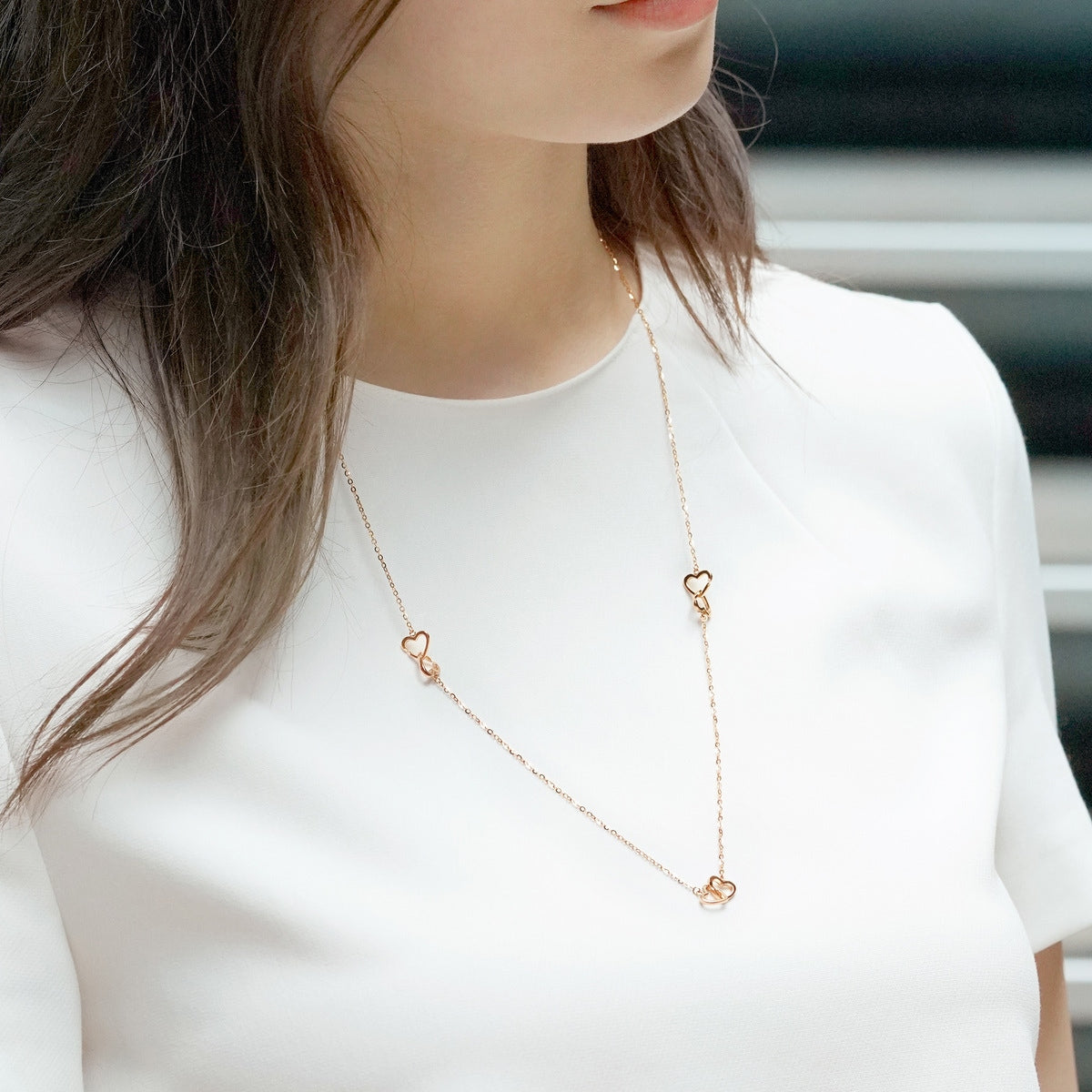 This 18K Rose Gold Necklace by Chow Sang Sang showcases three pairs of hollowed heart shapes, representing love and unity. The simple yet romantic design is perfect for everyday wear, adding a charming touch to your style.