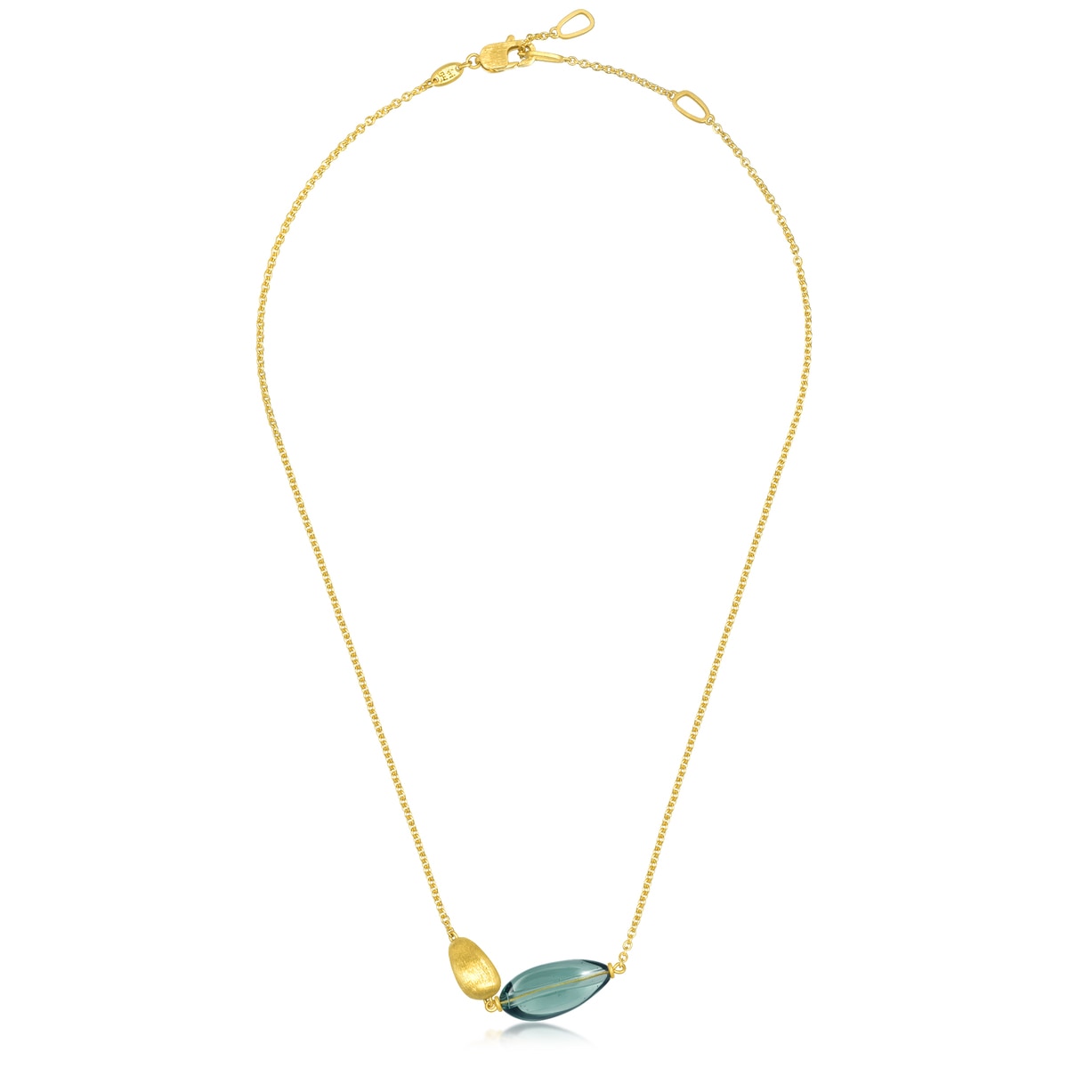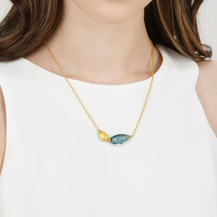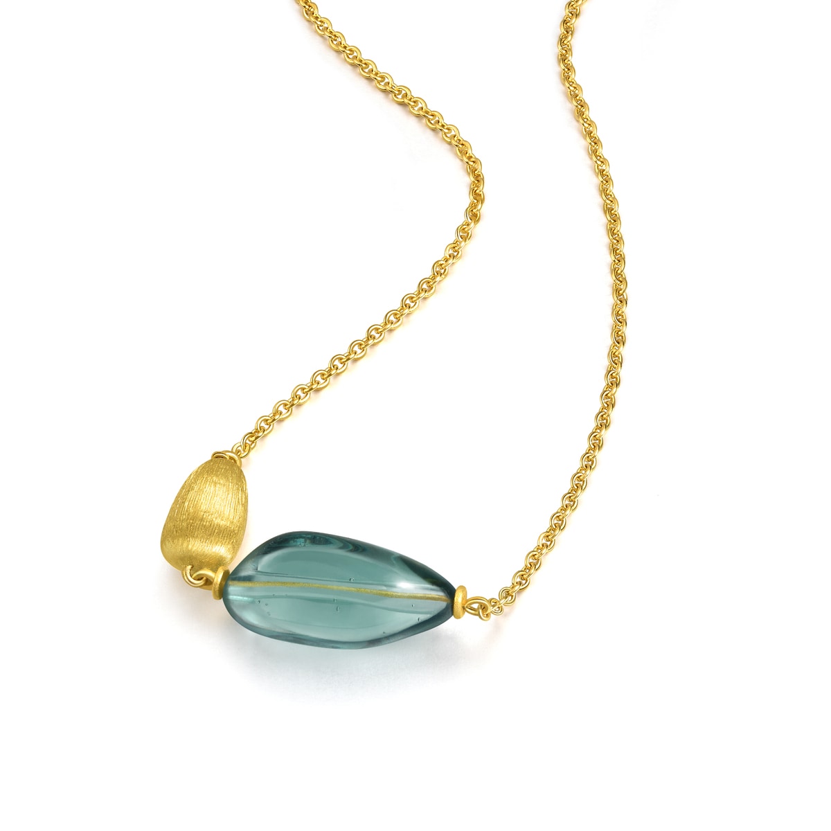 This 999 Gold Necklace by Chow Sang Sang features an unsymmetrical design adorned with gold and Murano glass decorations in various sizes and spontaneous styles. The stark color contrast against the smooth linear design creates a charming piece that complements the everyday fashion of the modern woman. The necklace is refined through electroforming and fine brushing techniques for durability and style. The Murano glass, imported from Italy, is highlighted by a subtle mint color, adding uniqueness to the piece.
