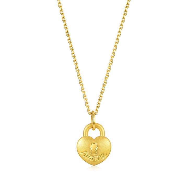 This 999 Gold Pendant by Chow Sang Sang features a charming love lock design, engraved with “Amore.” Symbolizing unbreakable love, this piece adds a sweet and romantic touch to any outfit, making it a perfect gift for a loved one.
