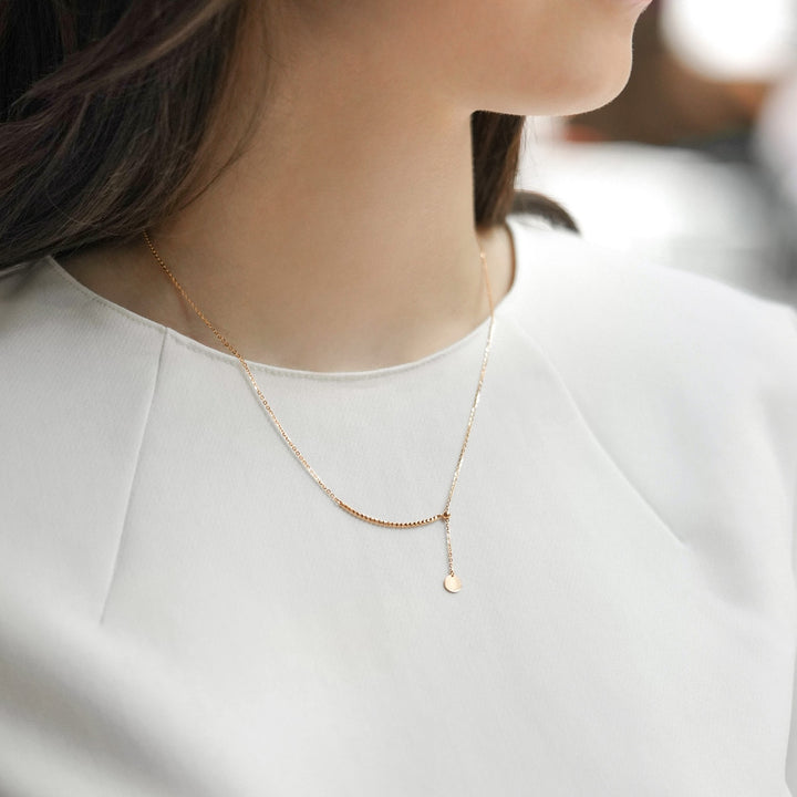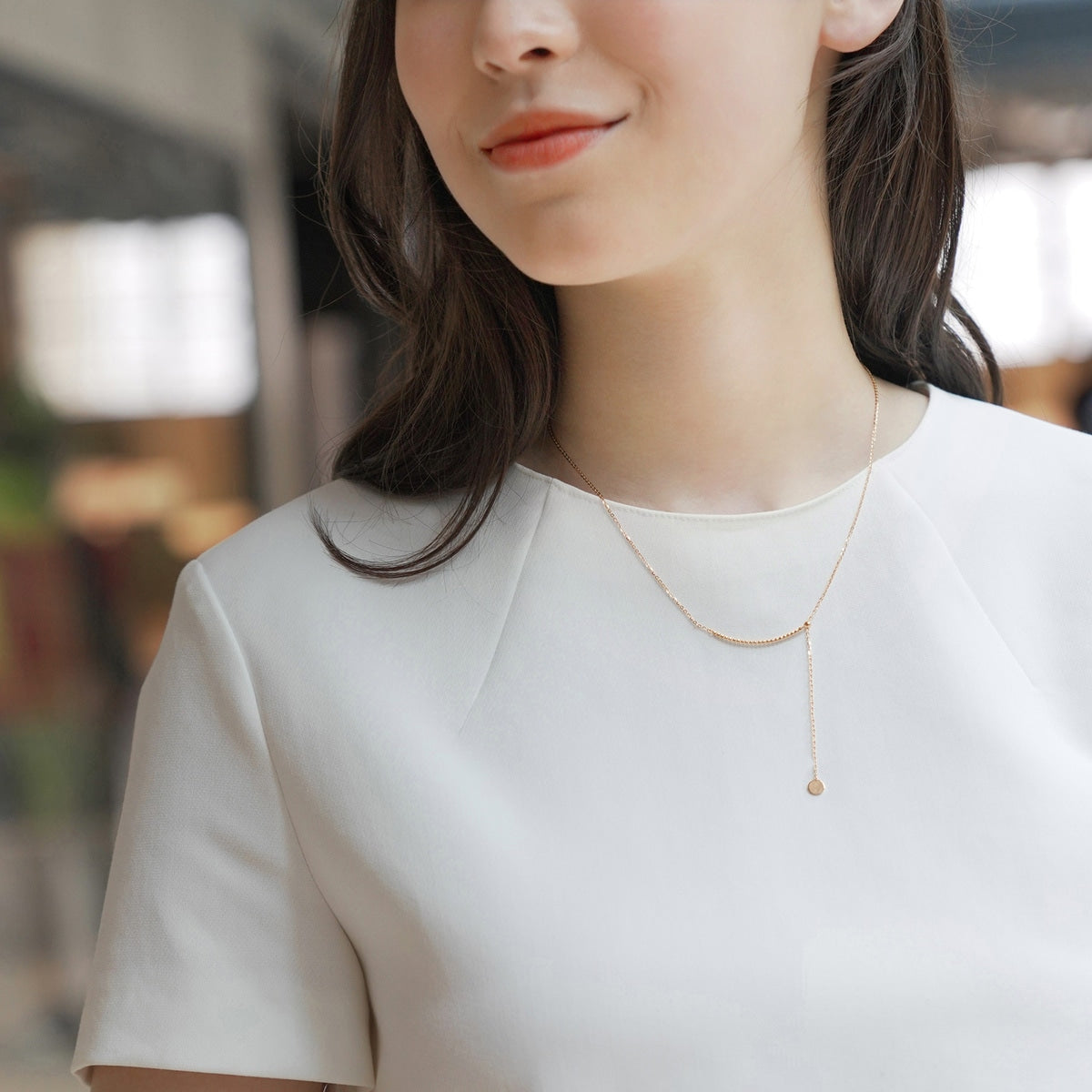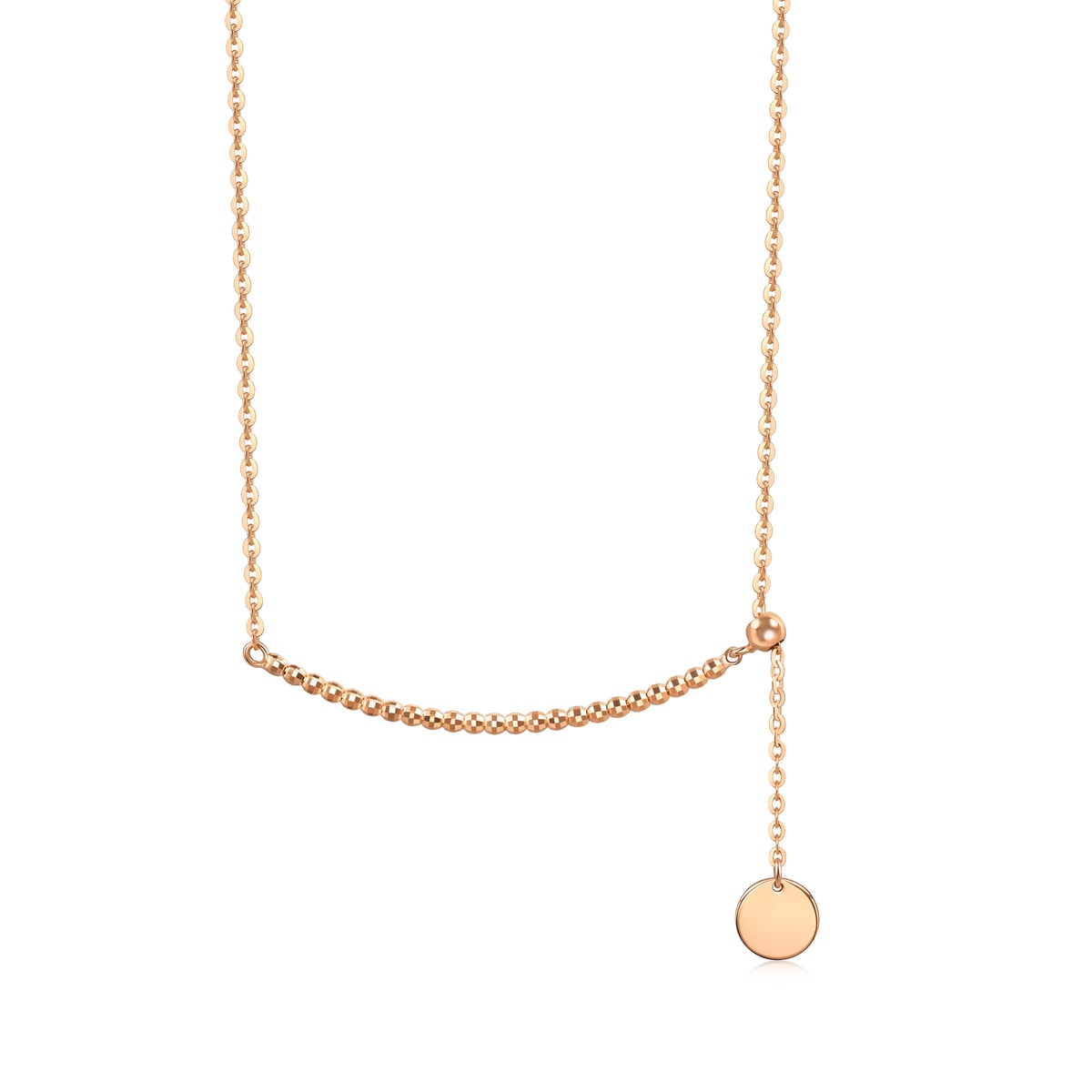 This 18K Rose Gold Necklace by Chow Sang Sang is simple and delicate, featuring a dangling round disc on a beaded chain that elegantly rests at the neck. This refined design offers a sense of graceful empowerment, making it a versatile accessory for any occasion.