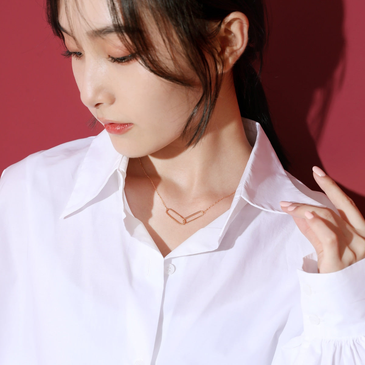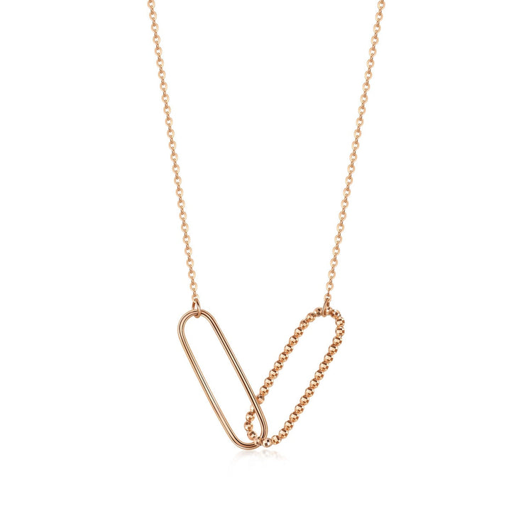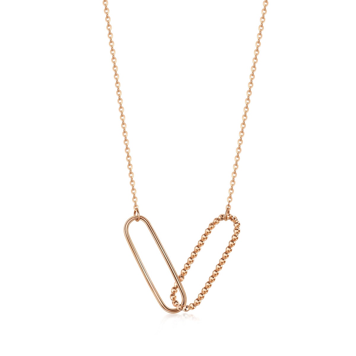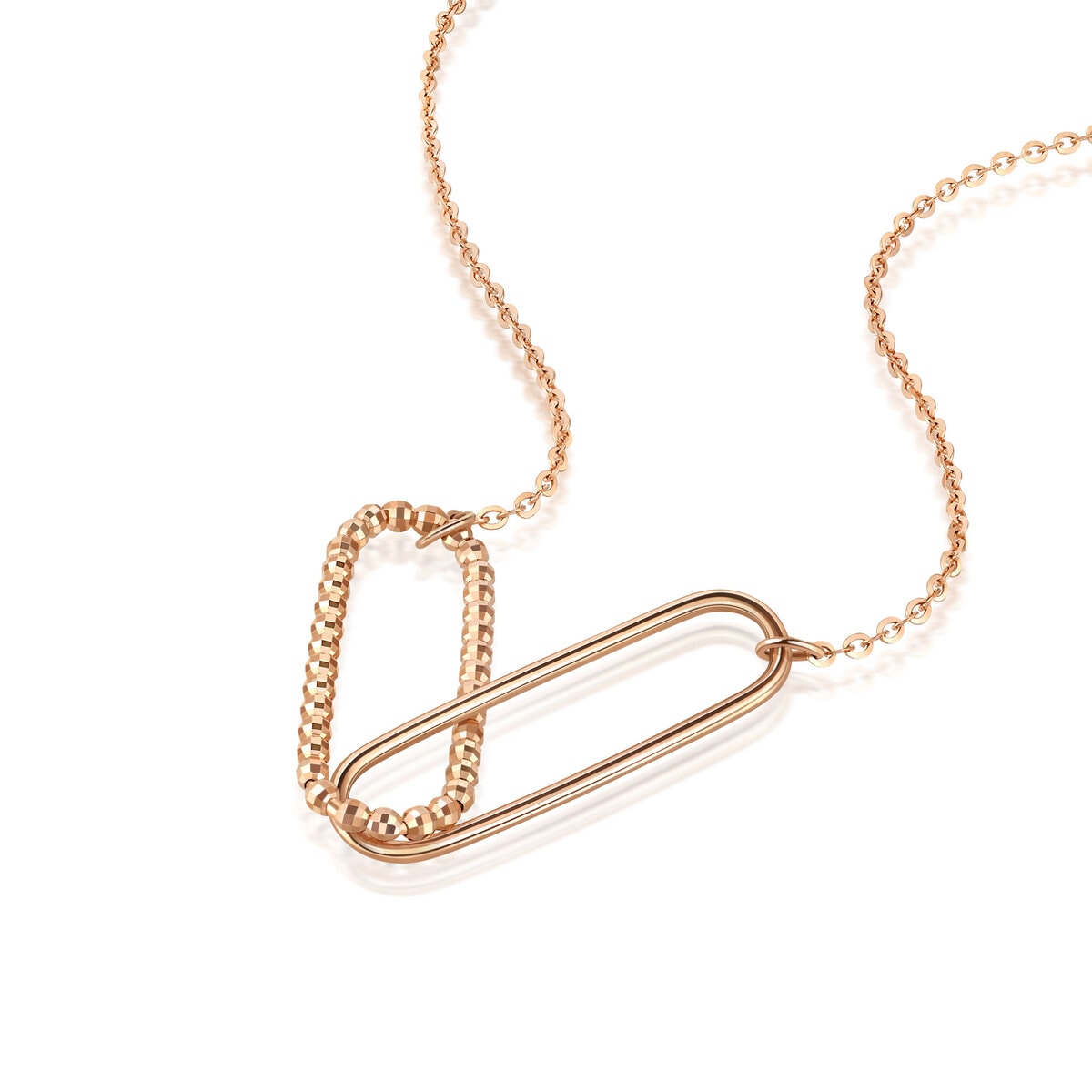 This 18K Rose Gold Necklace by Chow Sang Sang features two interlocking long oval shapes, one decorated with a beaded surface and the other polished. This simple design enhances modern aesthetics and adds refined layering to any wardrobe.