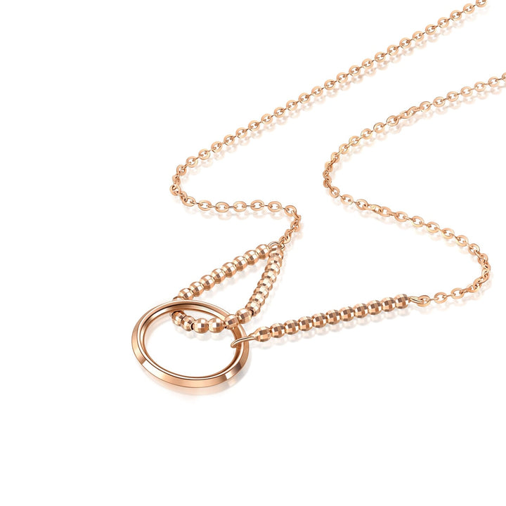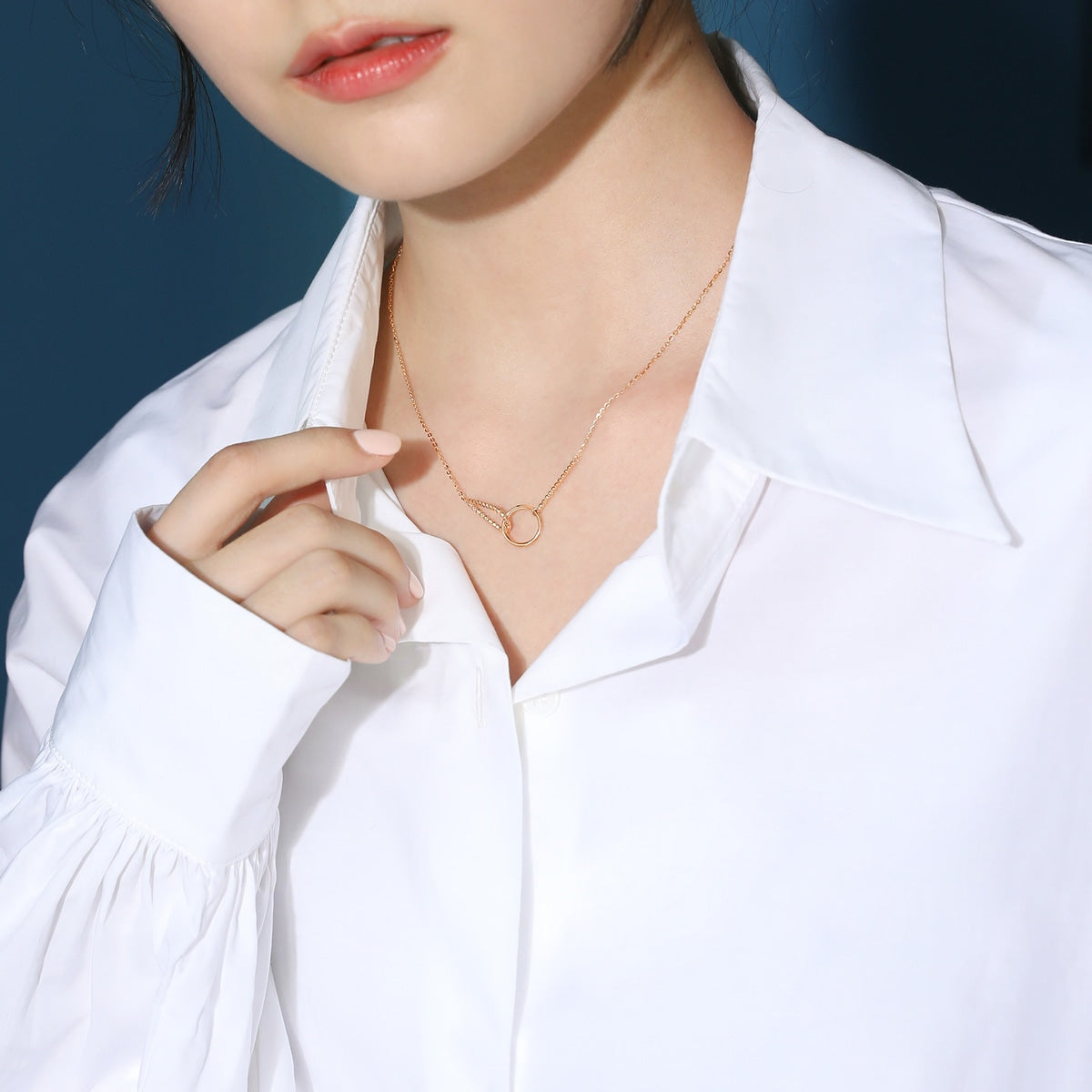 This 18K Rose Gold Necklace by Chow Sang Sang features an interlocking beaded waterdrop-shaped hoop alongside a polished band with a row of shiny beads. This simple yet elegant design adds a modern aesthetic and fine layering to any outfit.