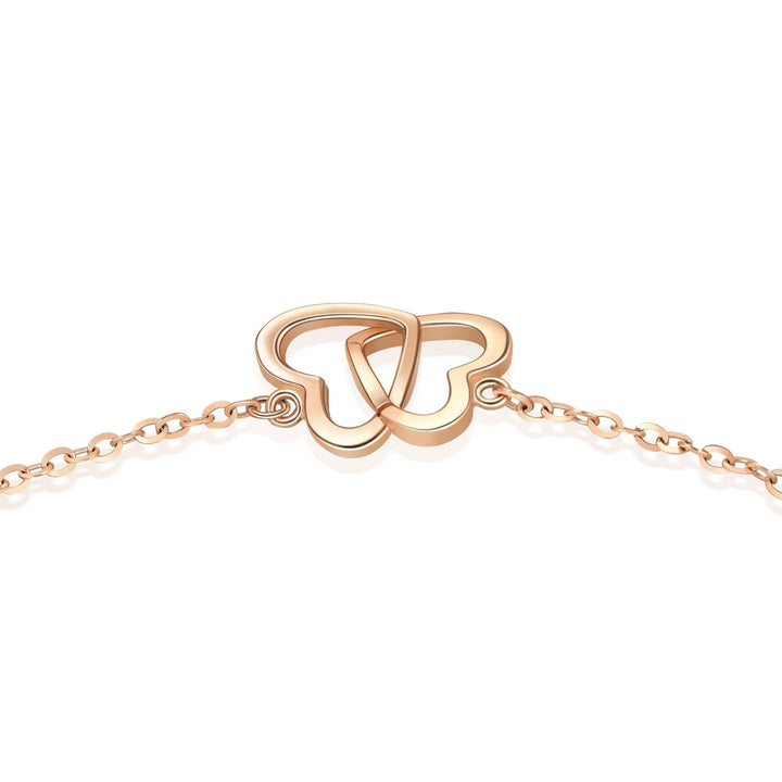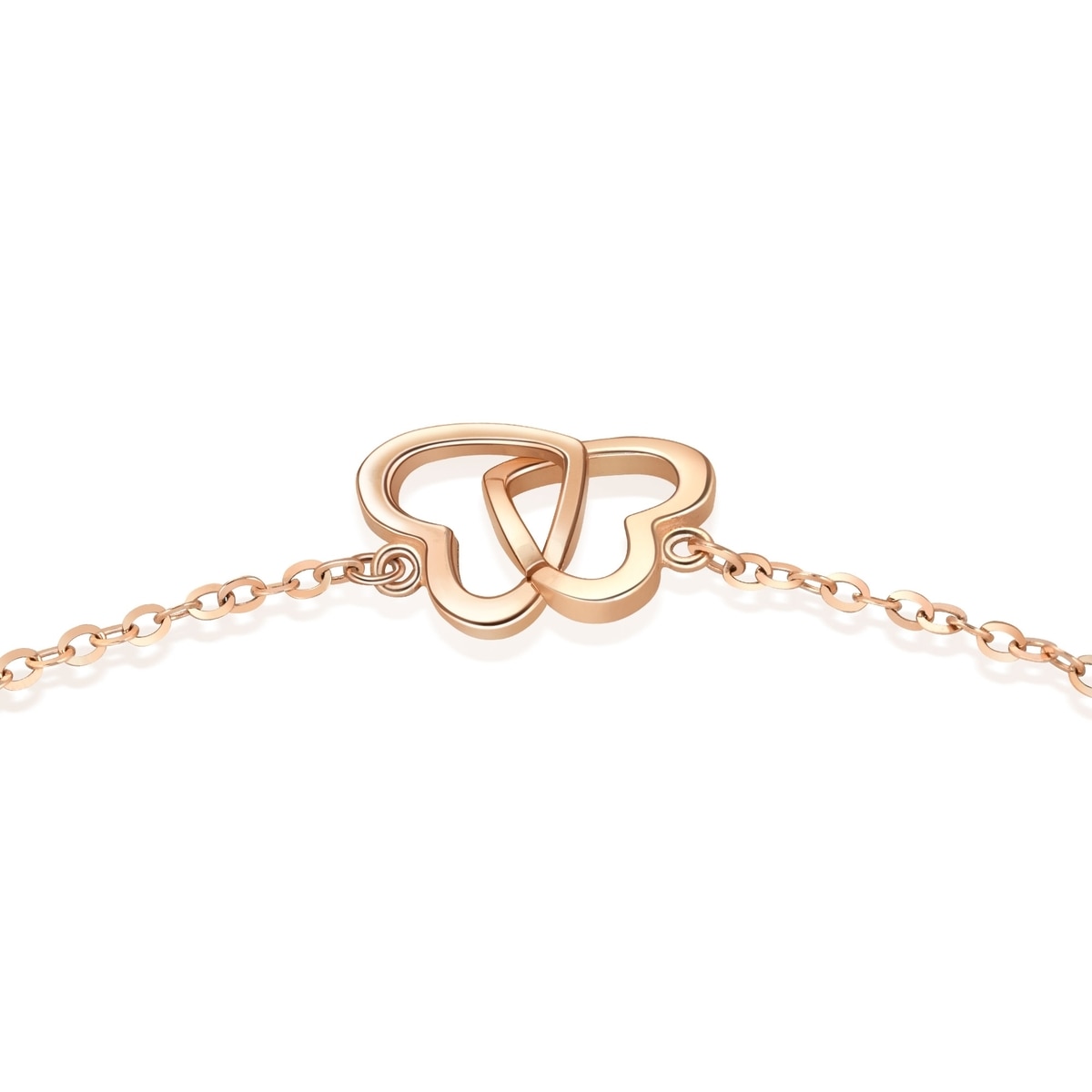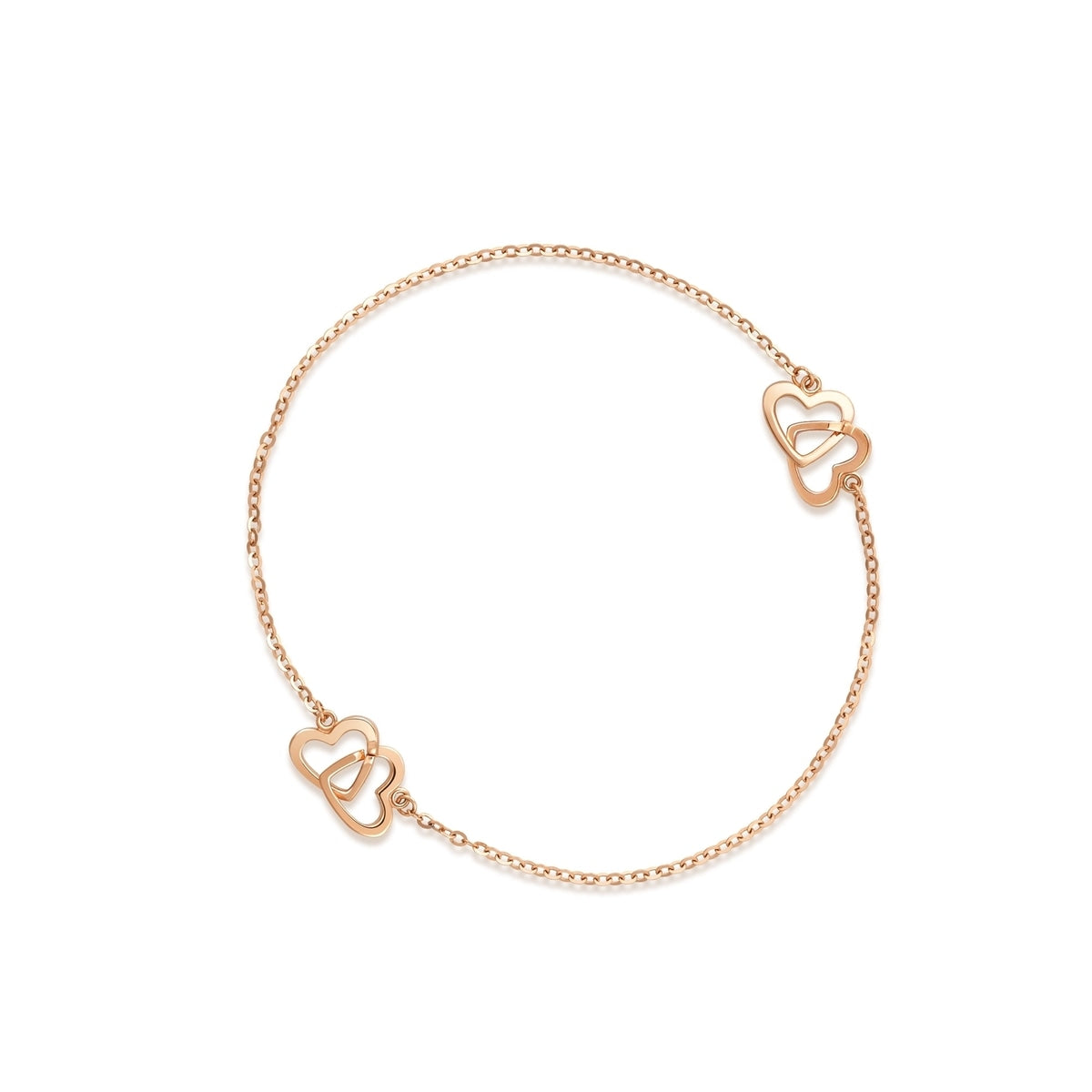 This 18K Rose Gold Bracelet by Chow Sang Sang is simple yet romantic, featuring two interlocking heart-shaped hoops that symbolize the beautiful love story of two hearts staying together. Its elegant design makes it a perfect accessory for any occasion.