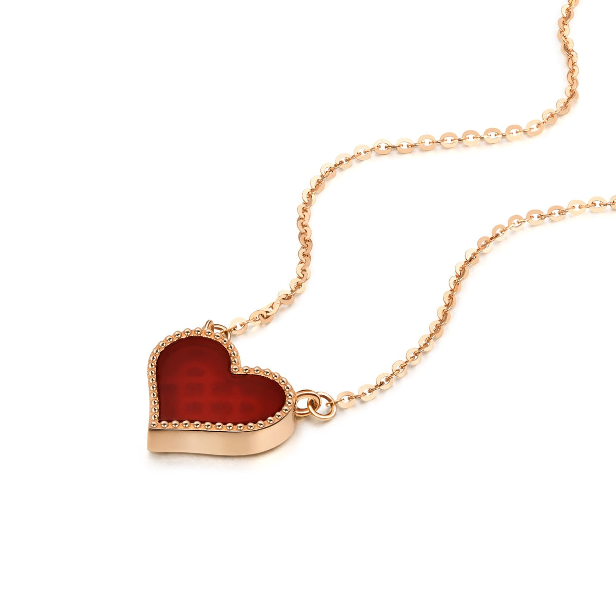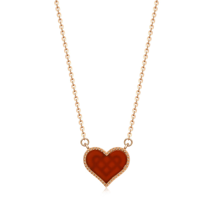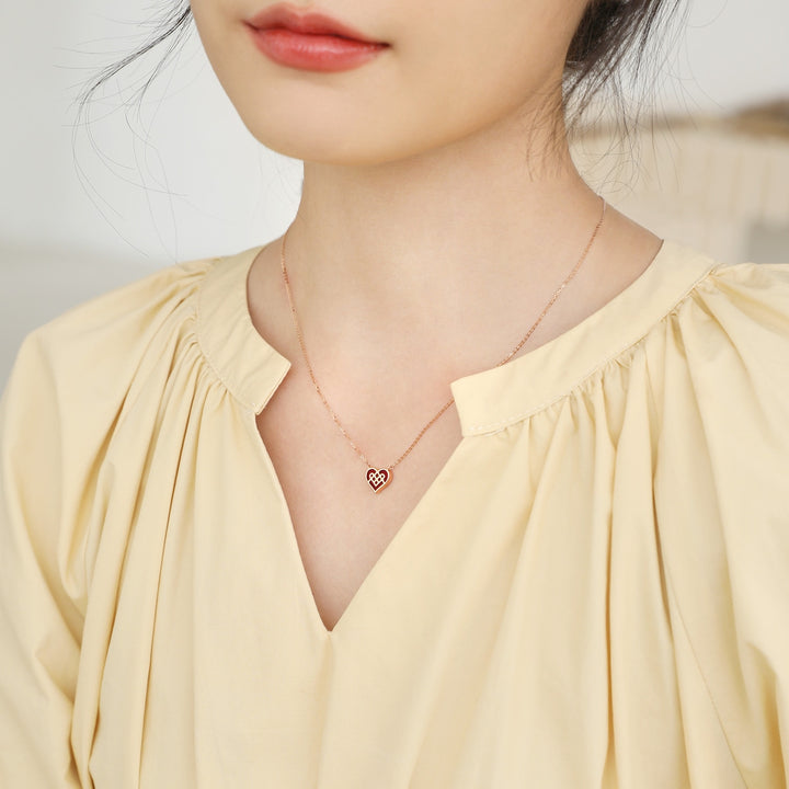 This 18K Rose Gold Necklace by Chow Sang Sang features a heart-shaped pendant made of translucent chalcedony over a love knot. Outlined with milgraining, this sophisticated piece embodies the utmost blessings for a romantic relationship, making it a meaningful gift.