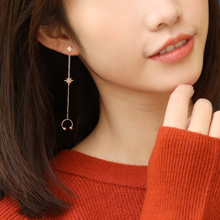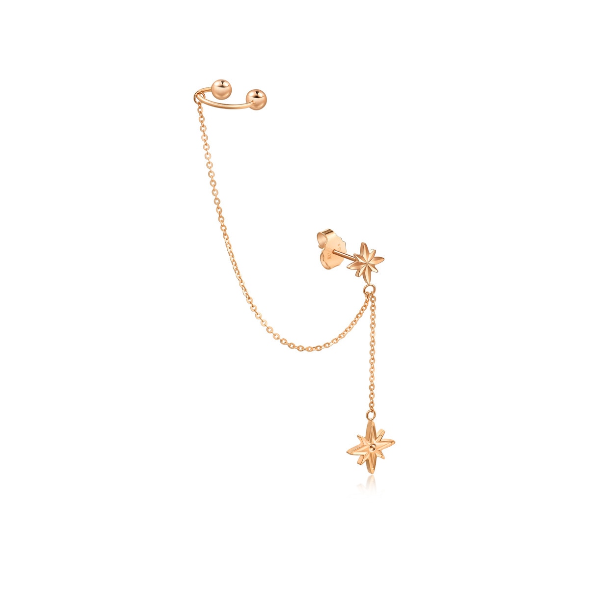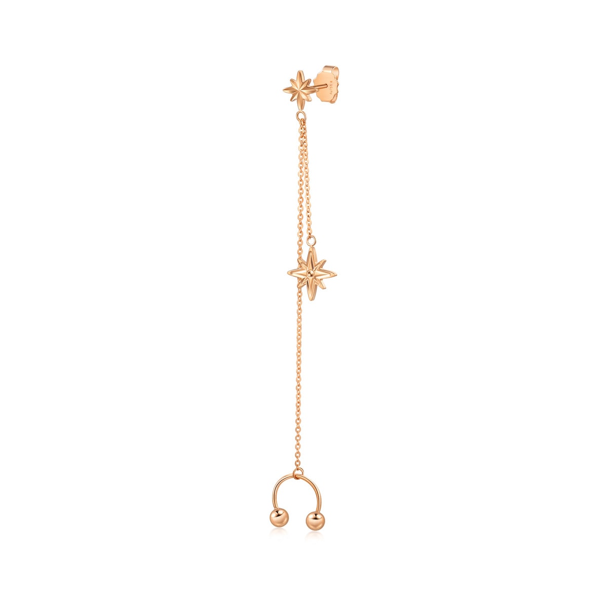 This 18K Rose Gold Single Earring by Chow Sang Sang features an eye-catching ear cuff design adorned with chains, tipped by an eight-pointed star. This fashionable style makes it a striking addition to any jewelry collection.