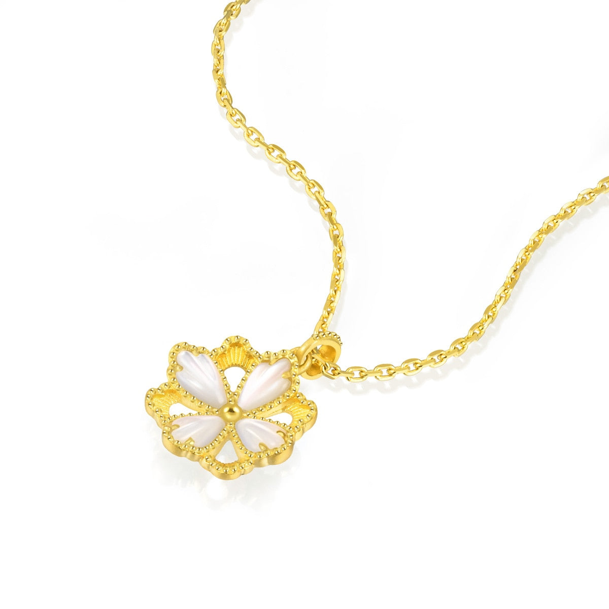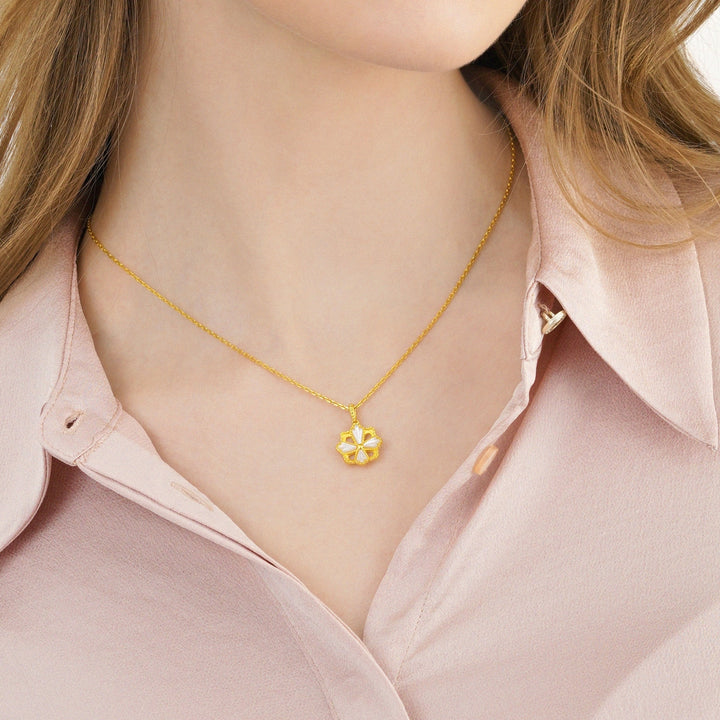 This 'Blossom' 999.9 Gold Pendant by Chow Sang Sang shares the same symbolism of hope and luck as the single earring, inspired by the gesar flower. With a graceful design and mother of pearl, this pendant adds a chic touch to your daily style, embodying auspicious wishes for the wearer.