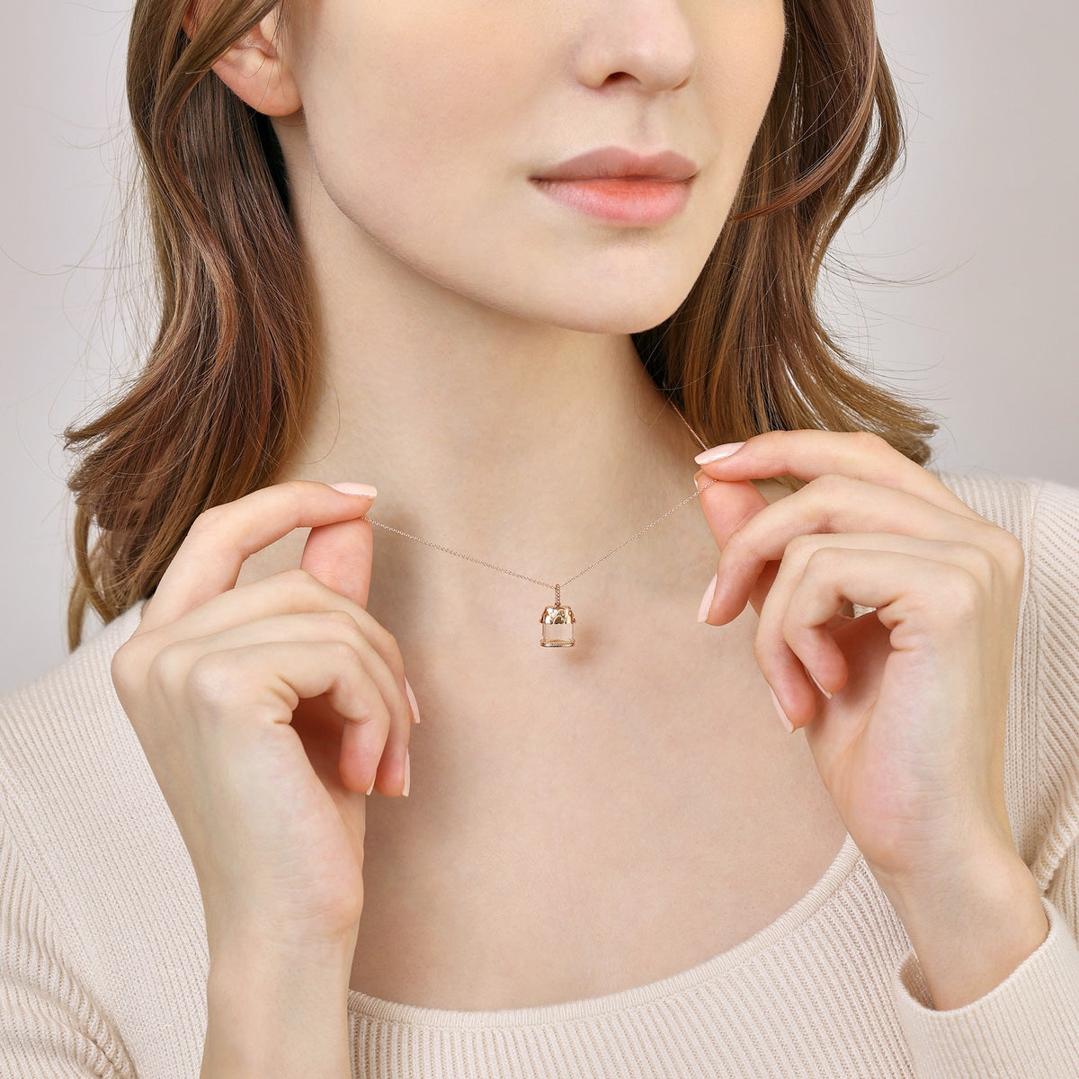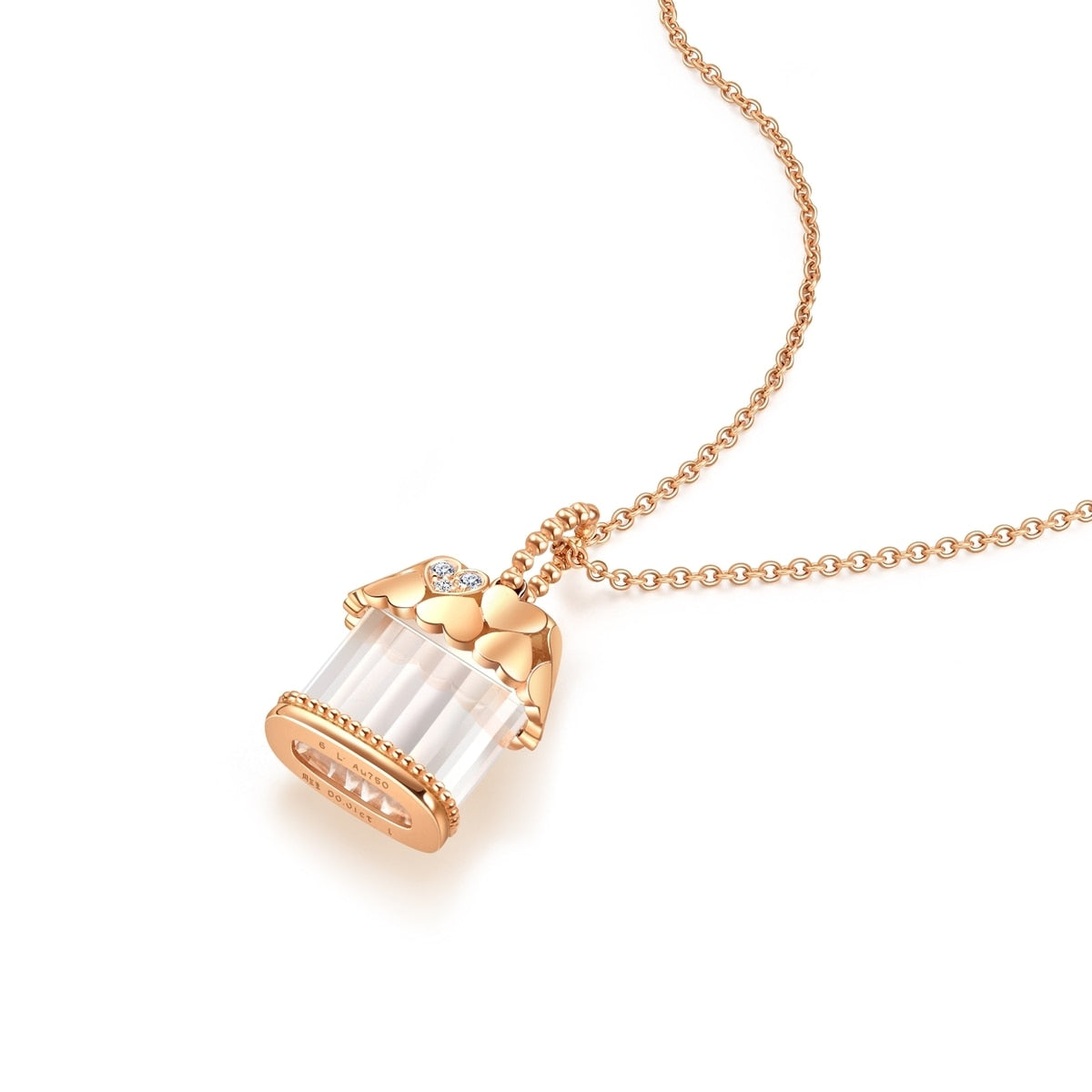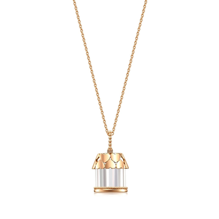 This '18K Rose Gold Diamond Necklace by Chow Sang Sang features a unique house-shaped design, crafted from 18K red gold and adorned with dazzling diamonds at the roof, complemented by a translucent crystal that reflects gentle light. A perfect gift to symbolize the everlasting commitment of building a home filled with love and protection.