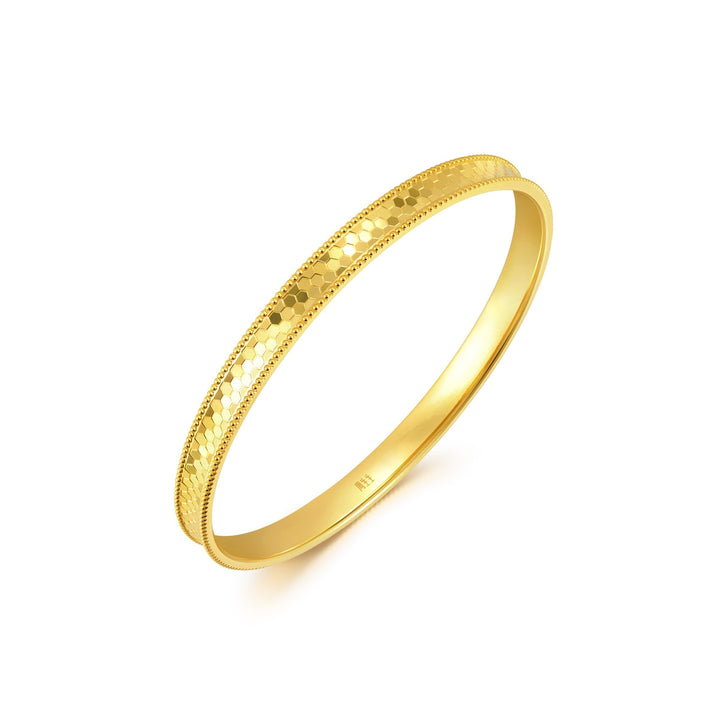 This 999 Gold Bangle by Chow Sang Sang features a modern concave design adorned with hexagonal honeycomb patterns. The innovative gold technique provides a mirror-like effect that reflects glimmering light, making this bangle a sophisticated yet stylish piece for daily wear.