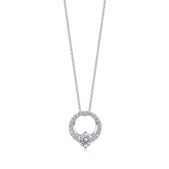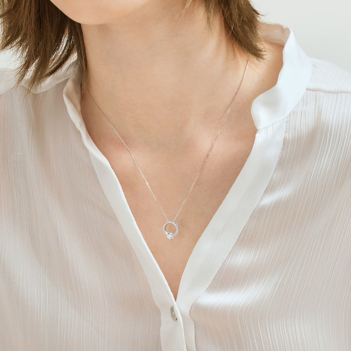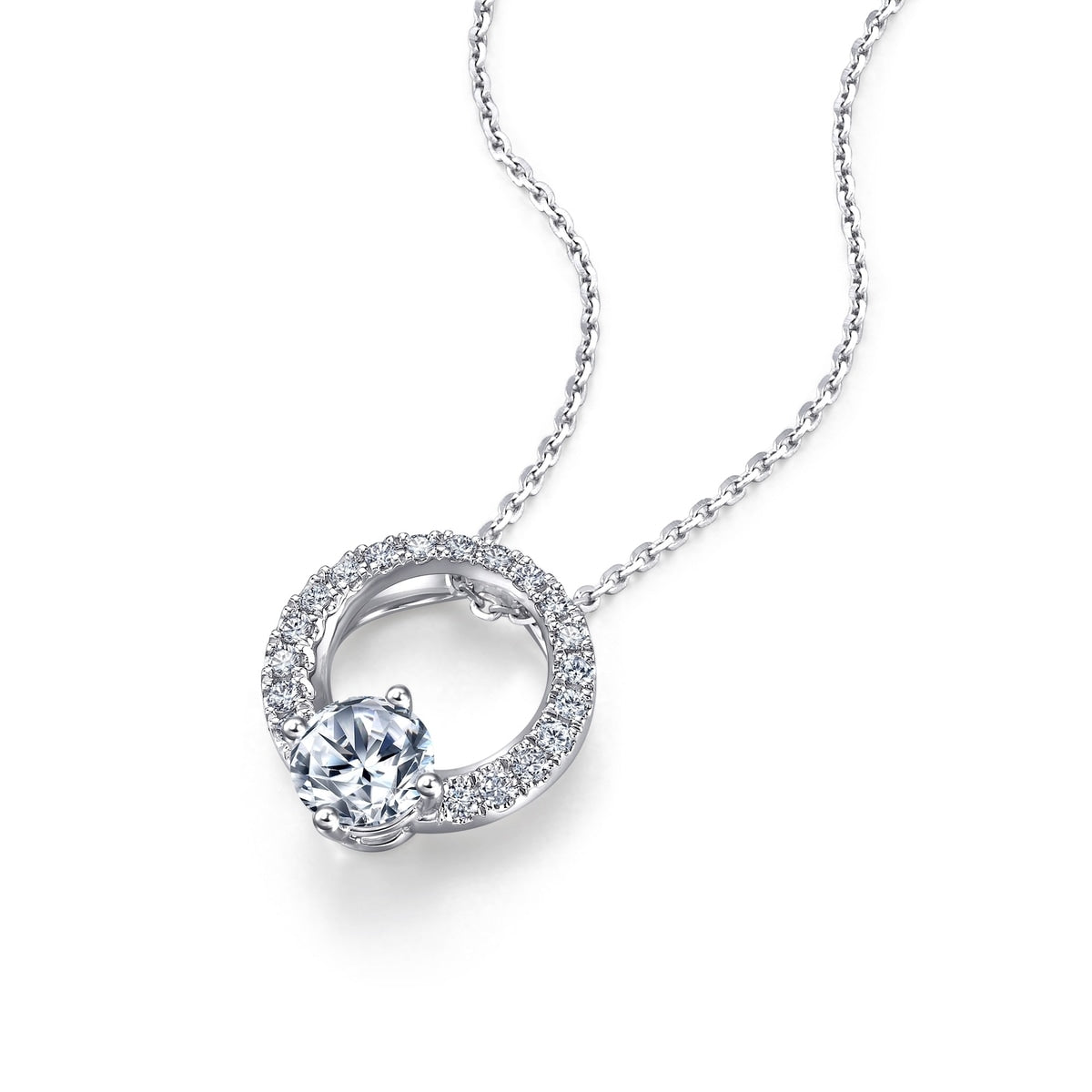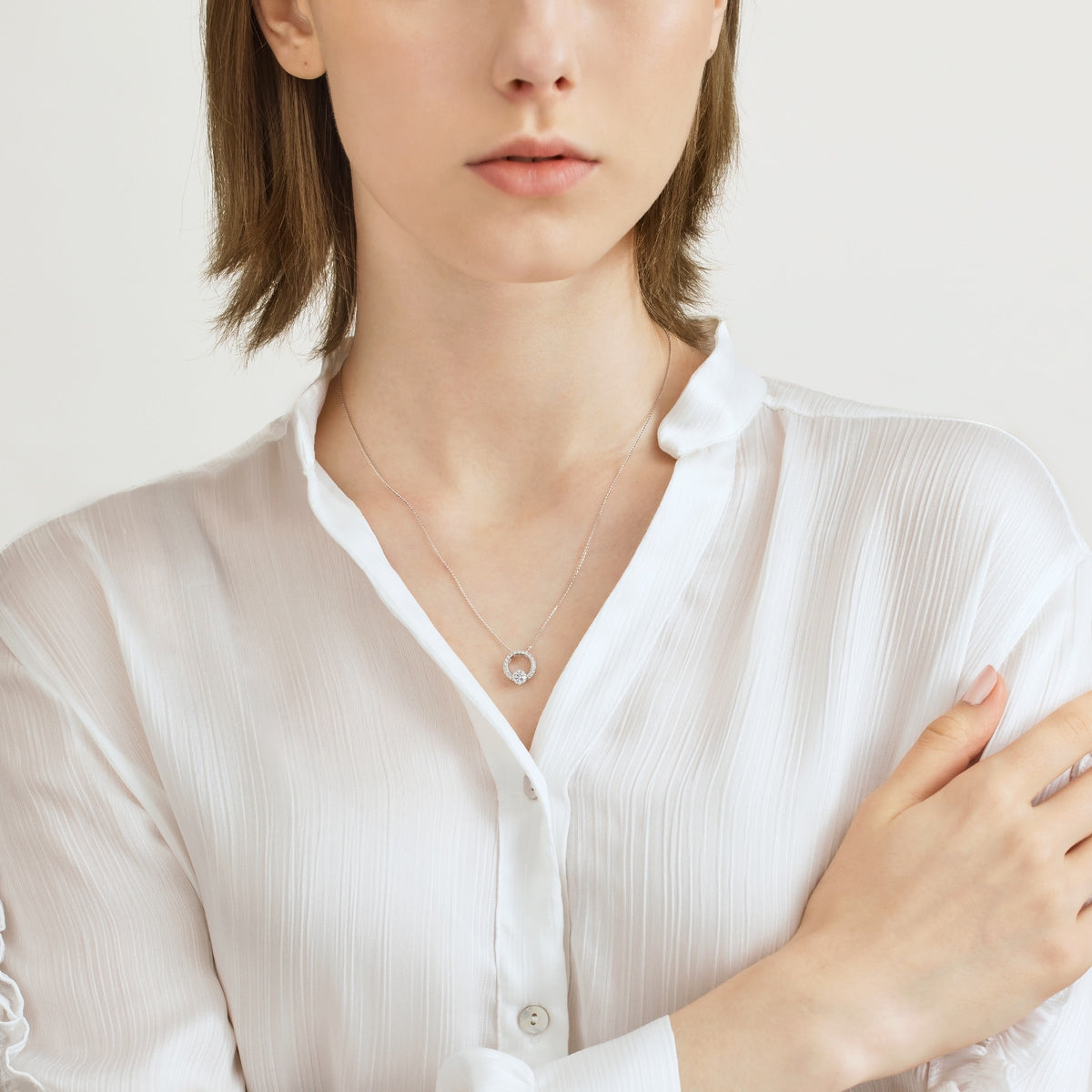 This ‘Sculpt’ 18K White Gold Diamond Necklace by Chow Sang Sang showcases a center diamond encircled by pavé diamonds, with beveled edges that allow light to enhance the brilliance of the piece. The simple design is a perfect accent for daily wear, adding a timeless elegance to any outfit.