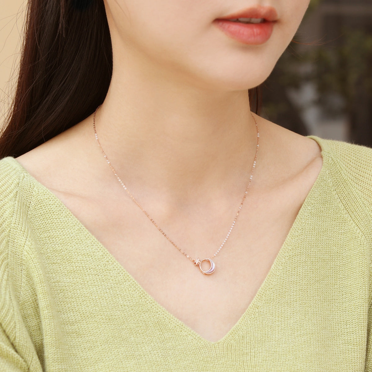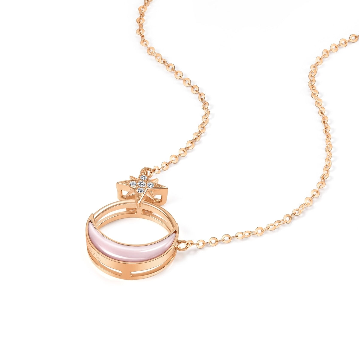 This 18K Rose Gold Necklace by Chow Sang Sang reflects the beauty of a starry midnight sky. The mother of pearl centerpiece radiates natural iridescence, and the octagonal star, romantically decorated with diamonds, adds a touch of elegance to your daily style.
