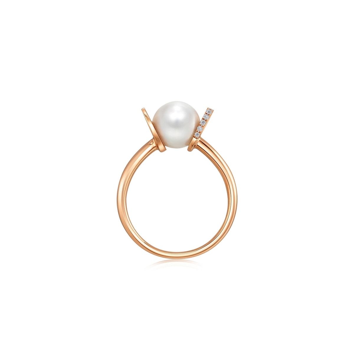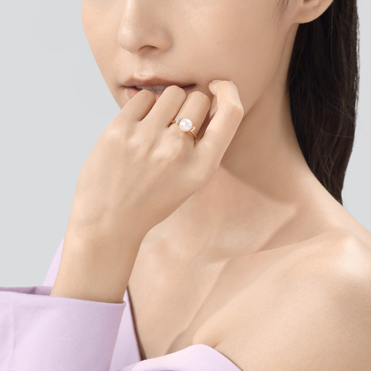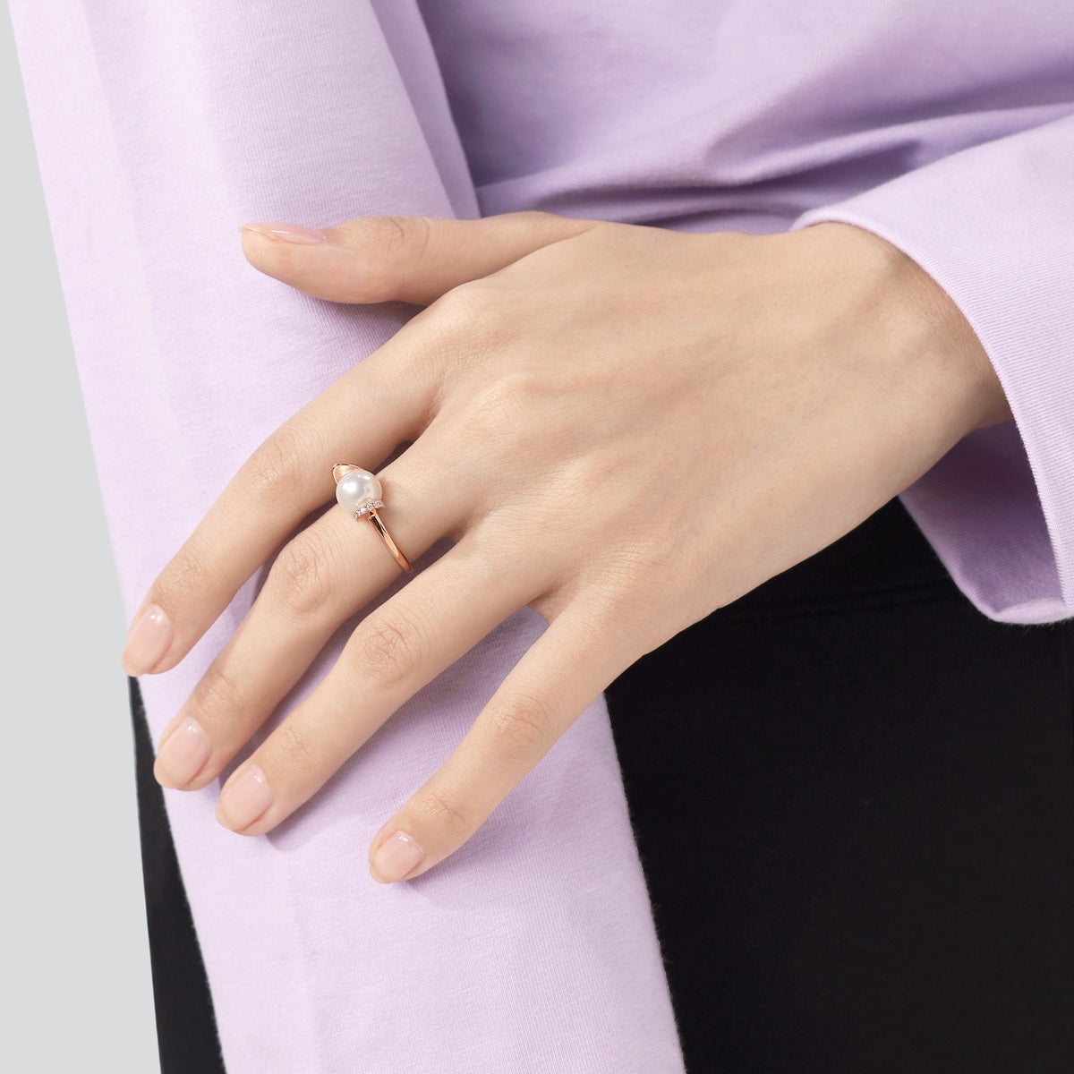 This 18K Rose Gold Akoya Pearl Ring by Chow Sang Sang exemplifies modern elegance with its simple yet stylish design. Featuring Japanese Akoya pearls adorned with diamond-set round discs, the ring offers a layered, sophisticated look, perfect for everyday wear.