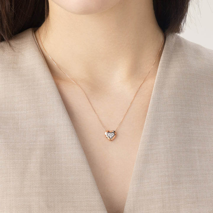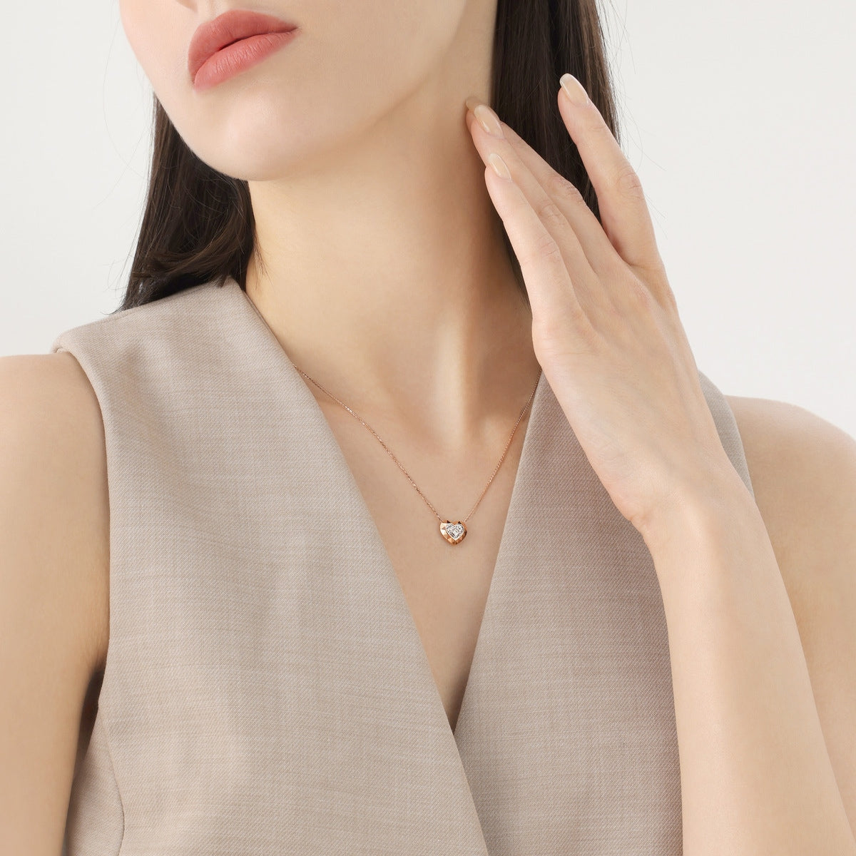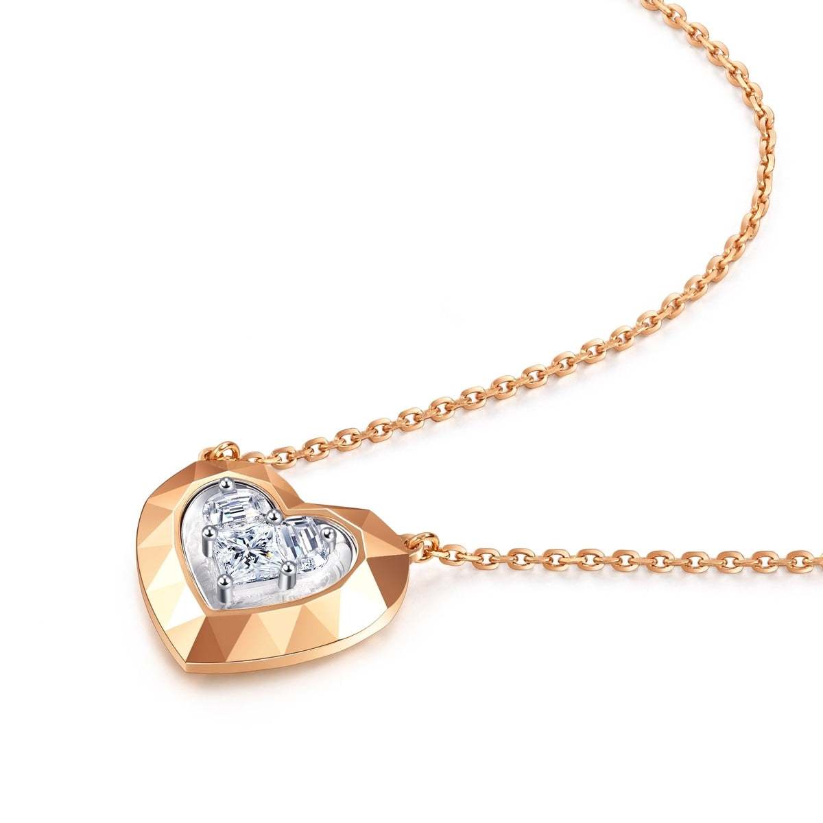 This 18K White & Red Gold Diamond Necklace by Chow Sang Sang embodies elegance with its exclusive Lady Heart design, crafted with two half-moon diamonds and one princess-cut diamond. The design reflects the multifaceted nature of a woman, offering versatility and style in one timeless piece.