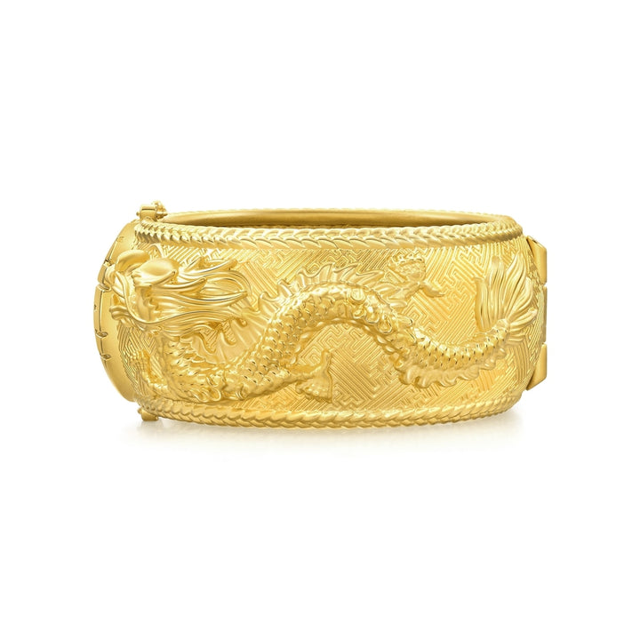 This ‘Dragon & Phoenix’ 999.9 Gold Bangle by Chow Sang Sang showcases a traditional design featuring the iconic dragon and phoenix motif, symbolizing harmony and prosperity. The intricate detailing makes this bangle a meaningful and elegant piece, perfect for special occasions.