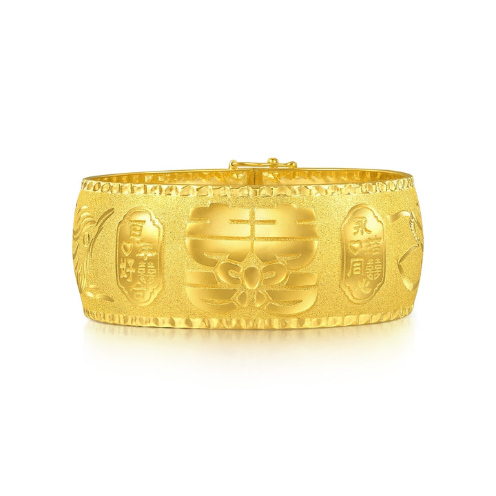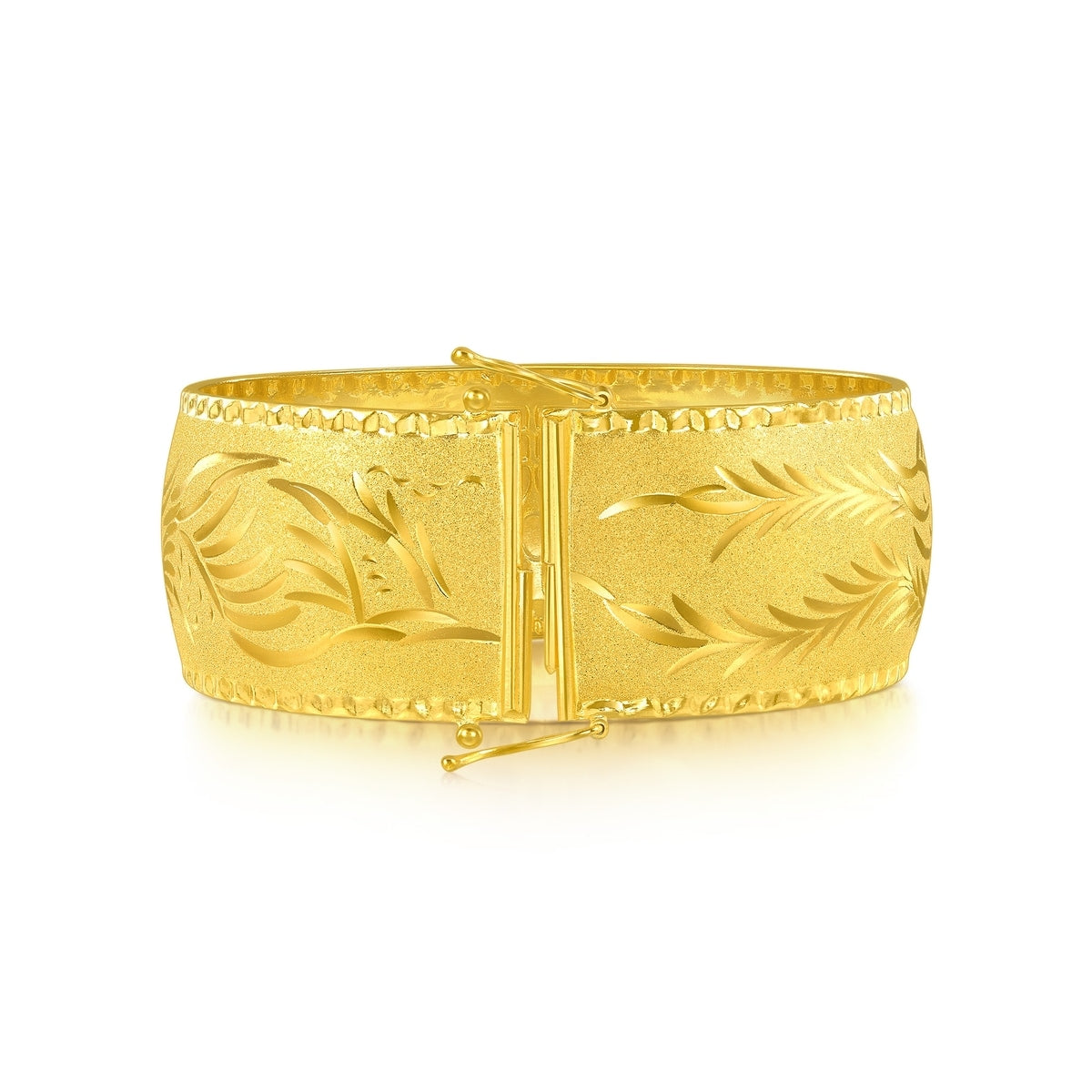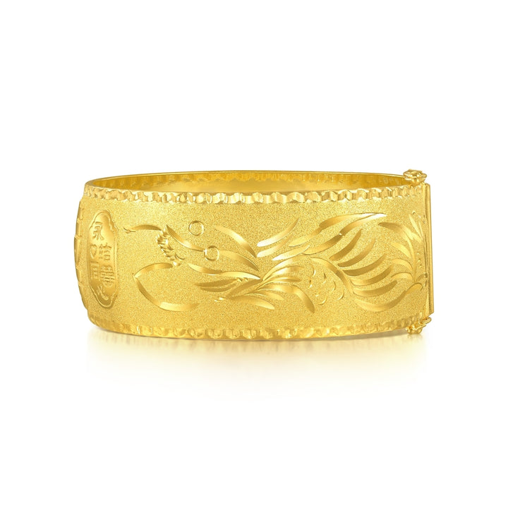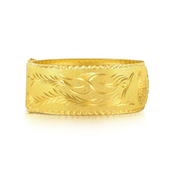 This ‘Dragon & Phoenix’ 999.9 Gold Bangle by Chow Sang Sang offers a beautifully detailed design with the dragon and phoenix, representing balance and blessings. The timeless symbol, combined with the luxurious gold craftsmanship, makes this bangle a standout addition to any jewelry collection.
