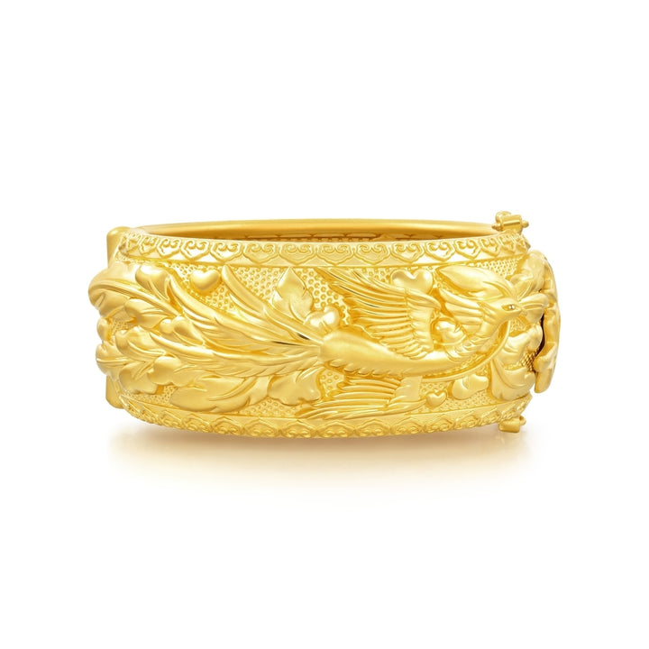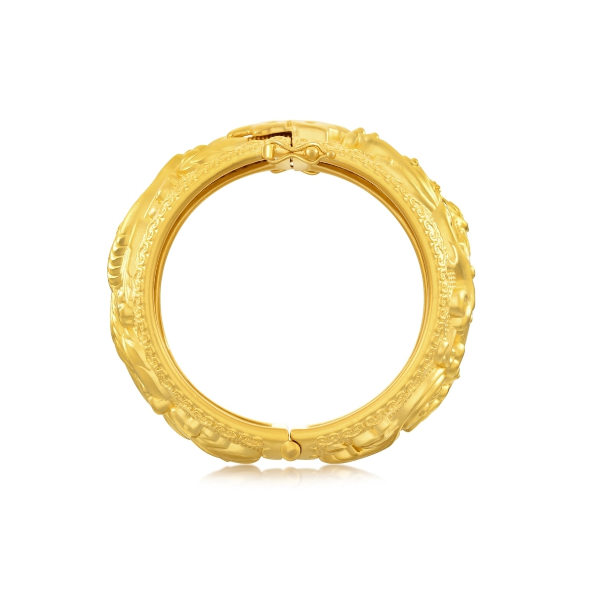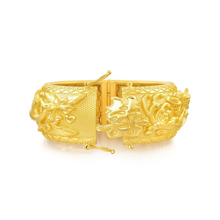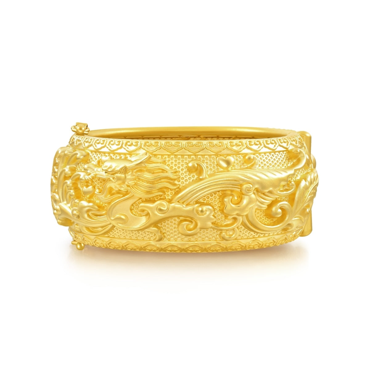 This ‘Dragon & Phoenix’ 999.9 Gold Bangle by Chow Sang Sang features intricate designs of the dragon and phoenix, symbols of harmony and prosperity. The bangle’s bold, traditional design makes it a meaningful and elegant piece for special occasions.
