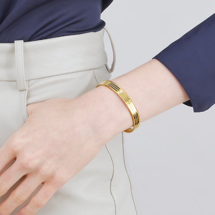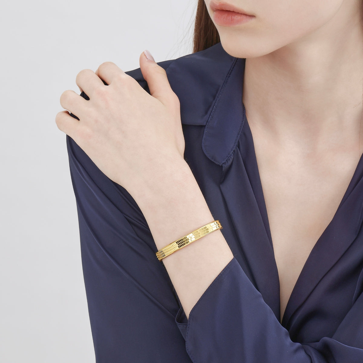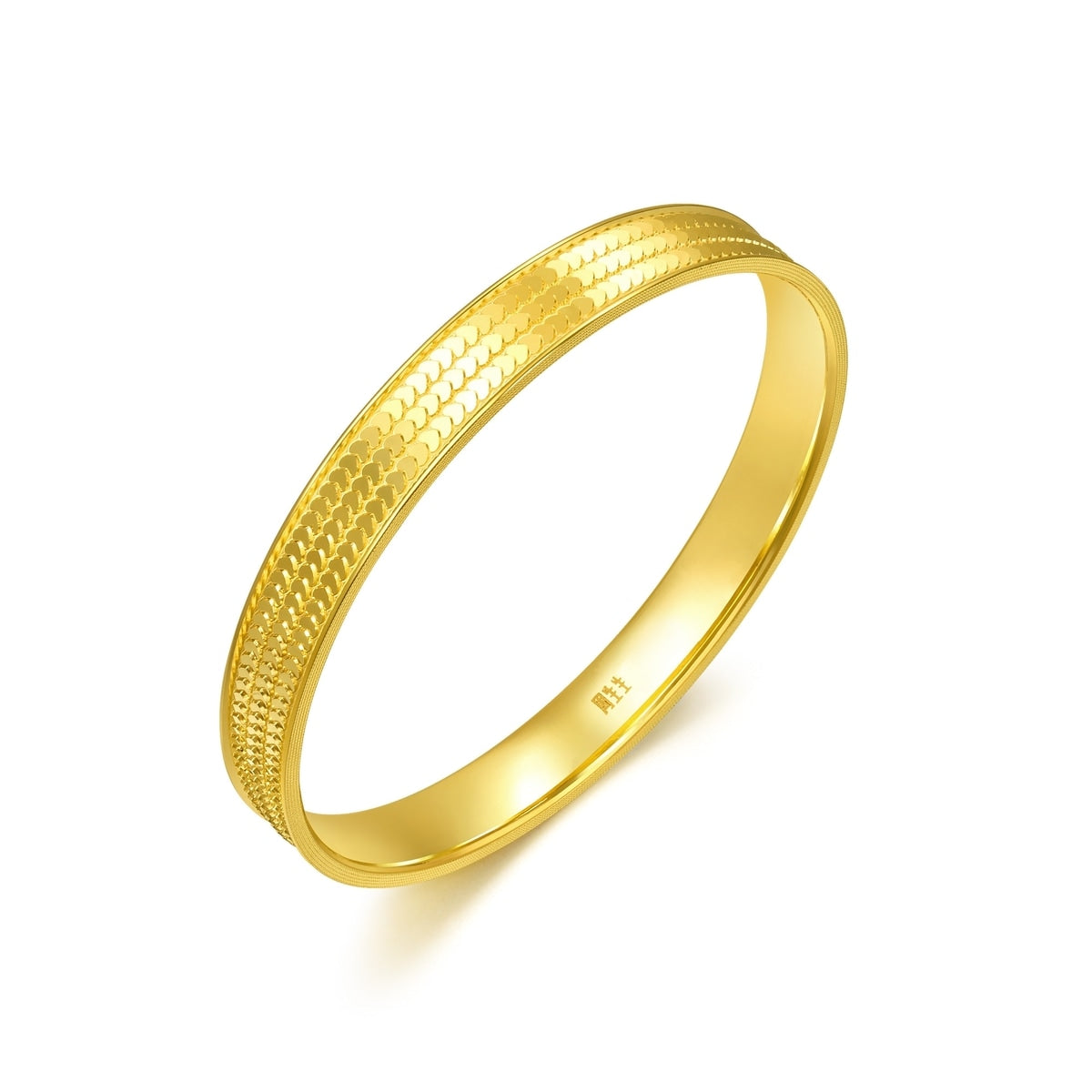This 999 Gold Bangle by Chow Sang Sang is a versatile staple, featuring the 5G smelting technique for doubled hardness. The heart shapes are crafted with fish scale patterns, creating a 3D effect, while the mirror-like surface reflects shimmering light, adding a bold touch to your outfit.