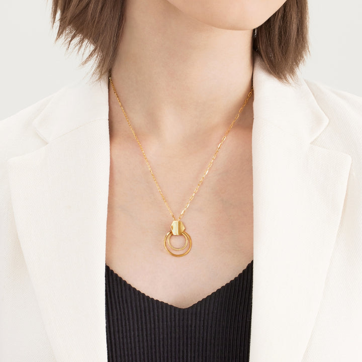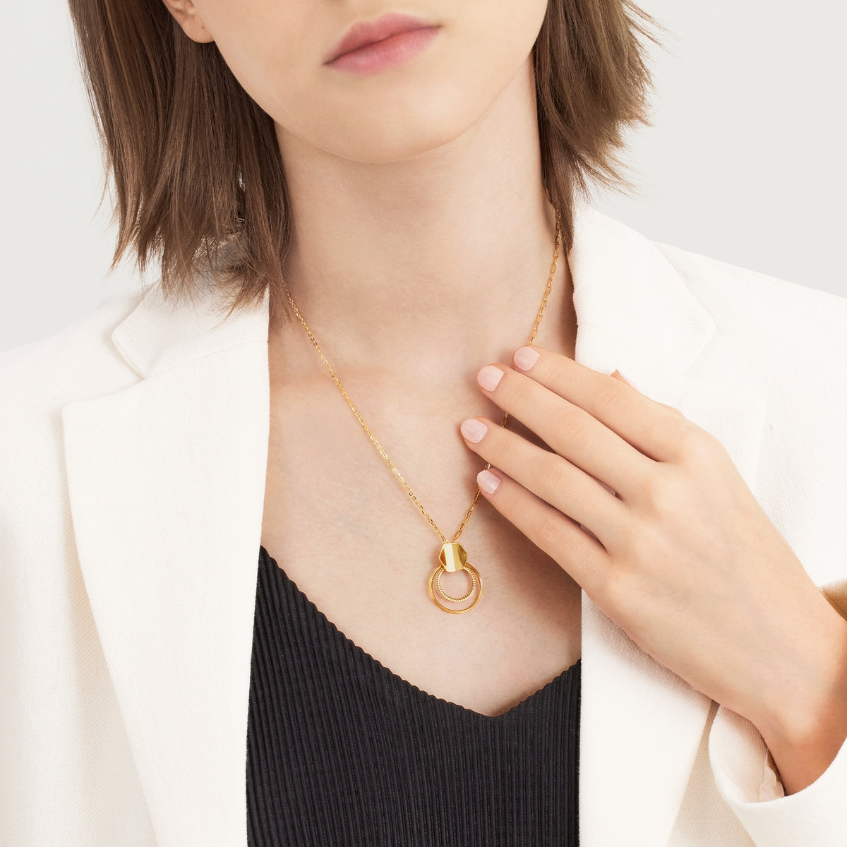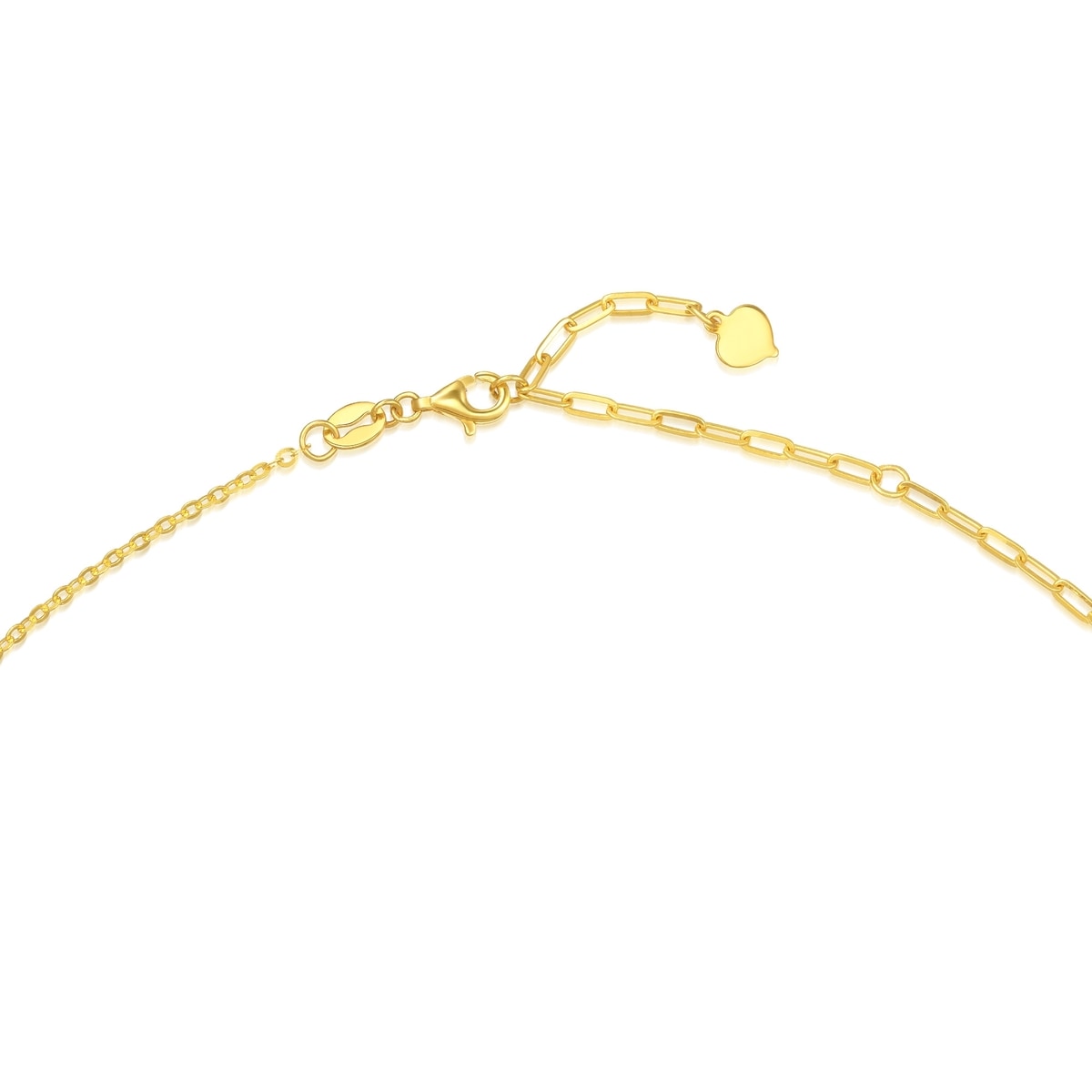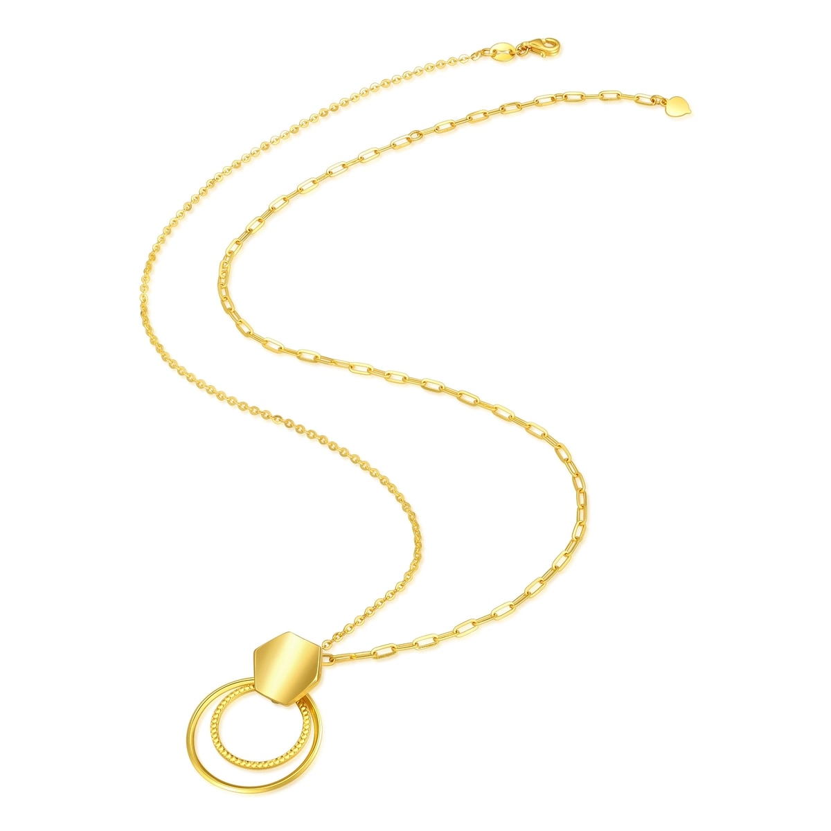 This '999 Gold Necklace' by Chow Sang Sang draws inspiration from geometric shapes, with two bands refined by different textures to create a layered effect. Decorated with two-styled chains, this fashionable piece adds sophistication and elegance to everyday wear. The 5G smelting hard solid gold technique ensures both durability and style.