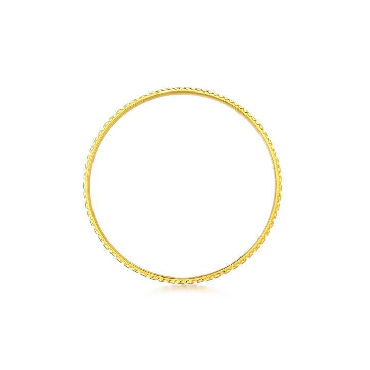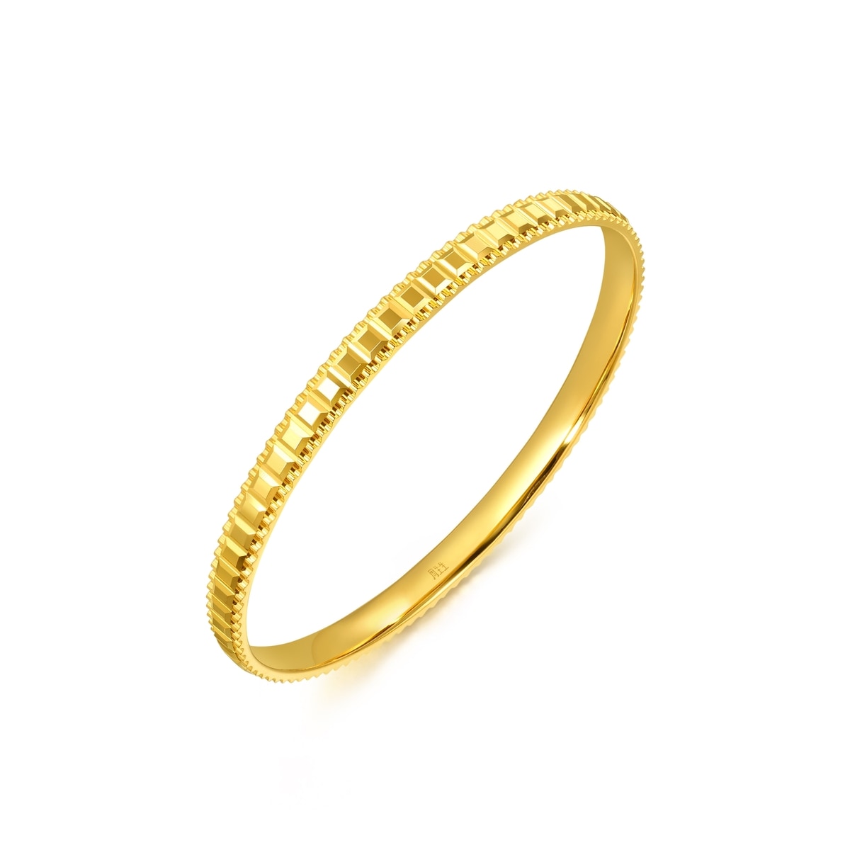 This '999 Gold Bangle' by Chow Sang Sang features a checkered outline with beaded edges, adding a stylish touch to this mirror-like bangle. Crafted with the 5G smelting hard solid gold technique for enhanced hardness, this bangle is perfect for everyday elegance.