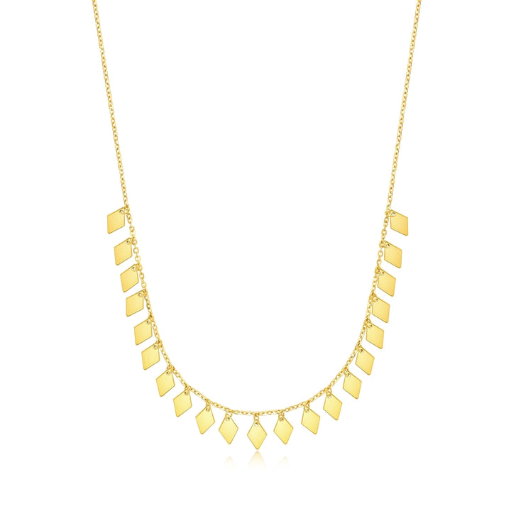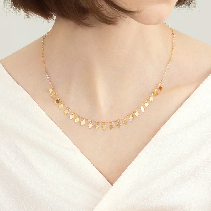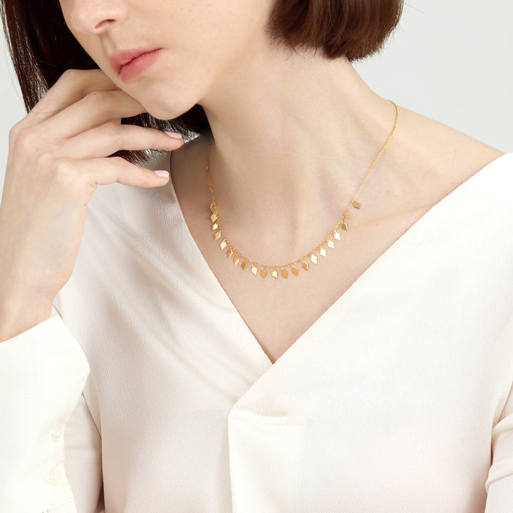 This '999 Gold Necklace' by Chow Sang Sang features rhombus-shaped pieces that reveal a golden sparkle, creating a subtle yet stylish look. With its enhanced hardness due to the 5G smelting hard solid gold technique, this piece is perfect for those seeking a balance of elegance and resilience.