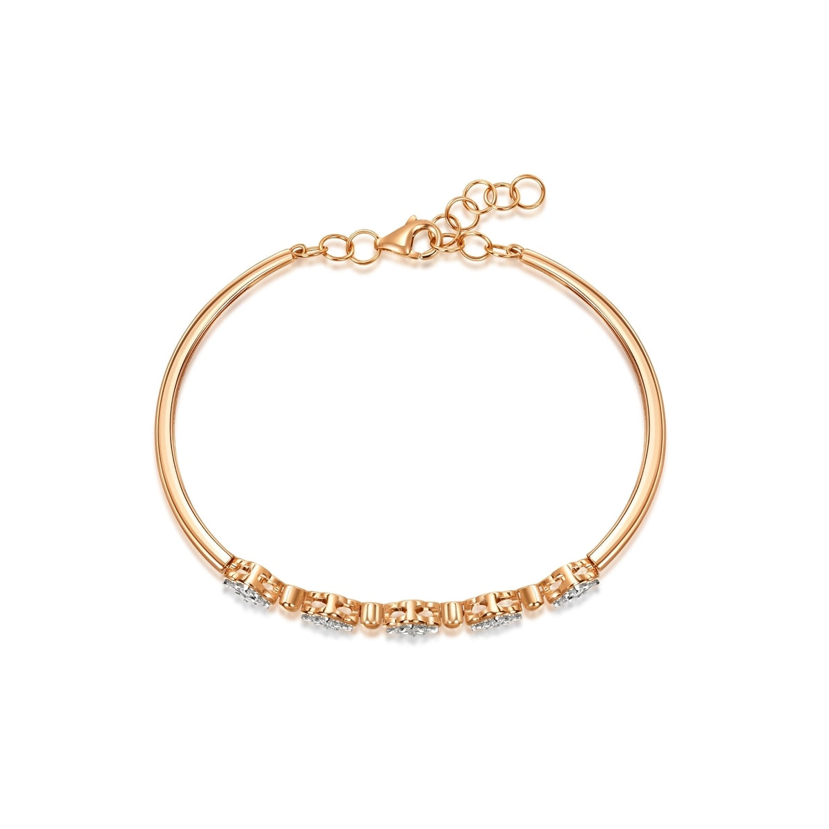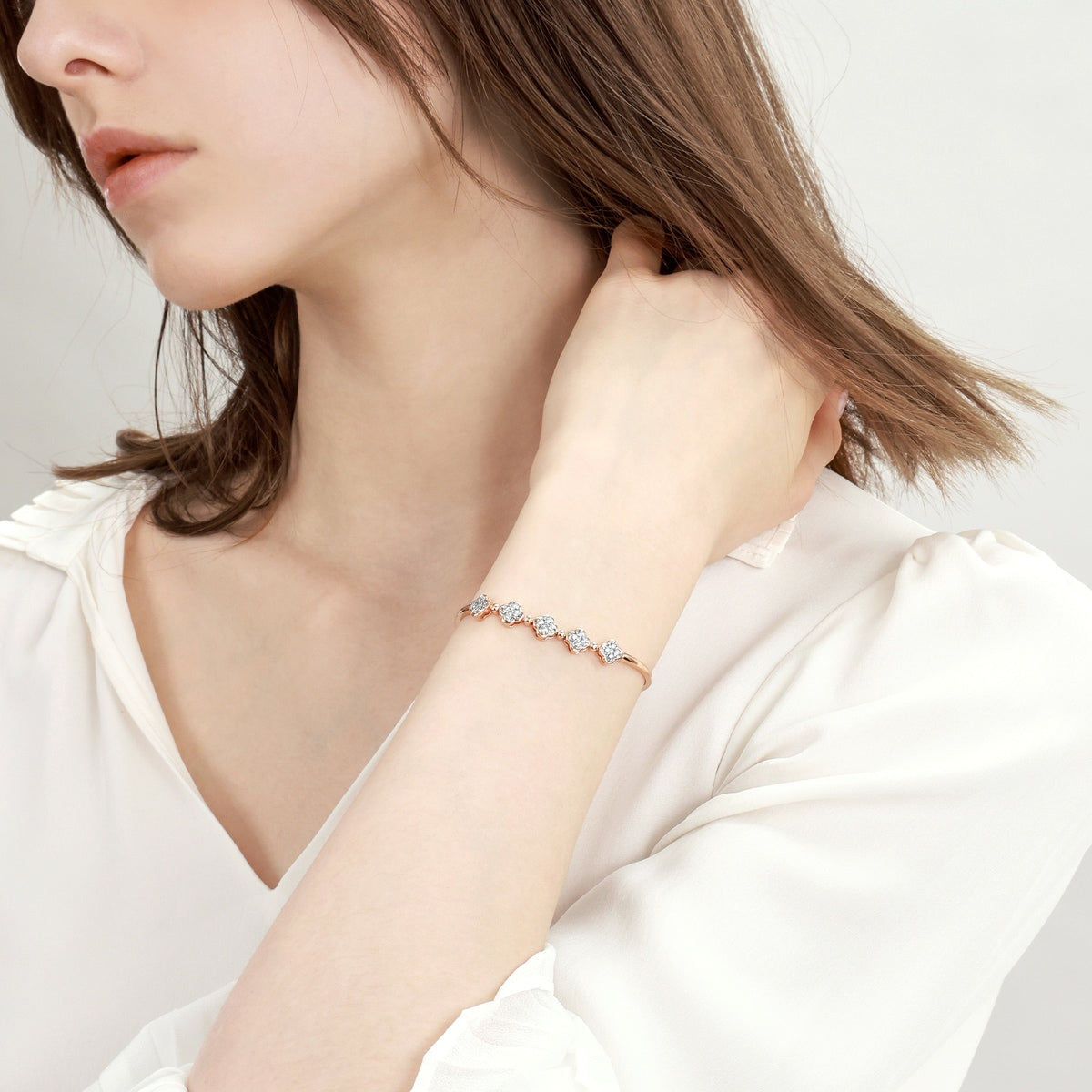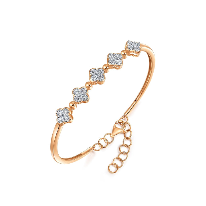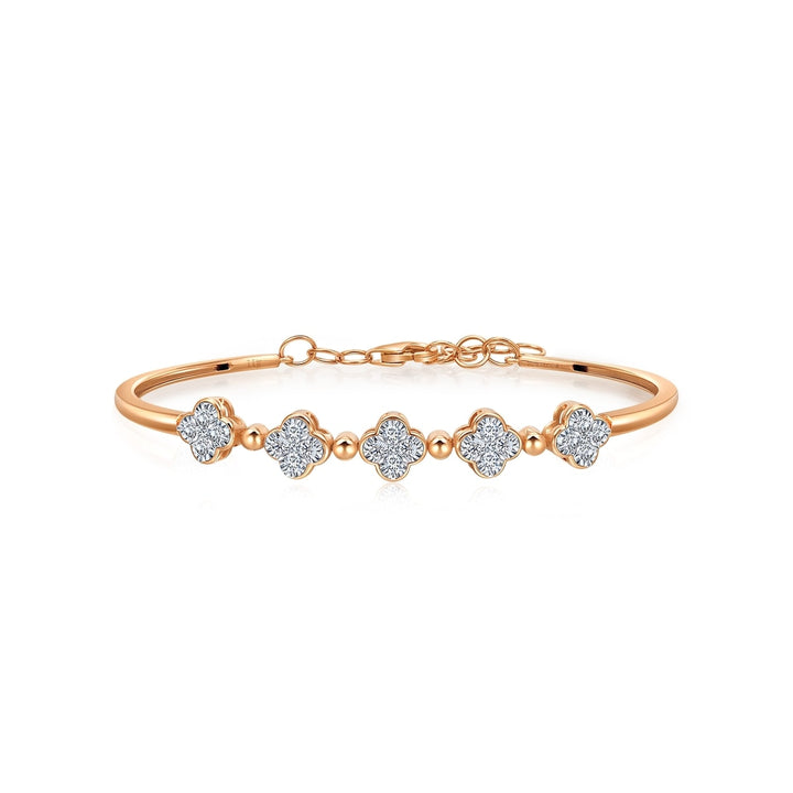 This Fantasy 18K White & Red Gold Diamond Bangle by Chow Sang Sang showcases exquisite craftsmanship, combining engraving and embedding techniques to link the die-cut piece and diamond seamlessly. The diamond-framed four-leaf clover is detachable, offering two ways to wear this elegant piece, reflecting identical brilliance.