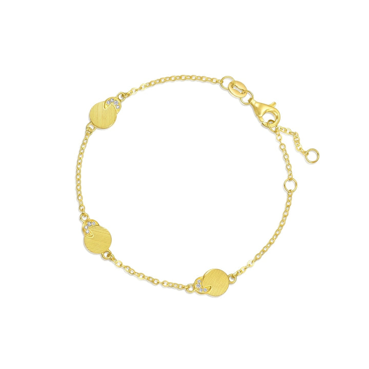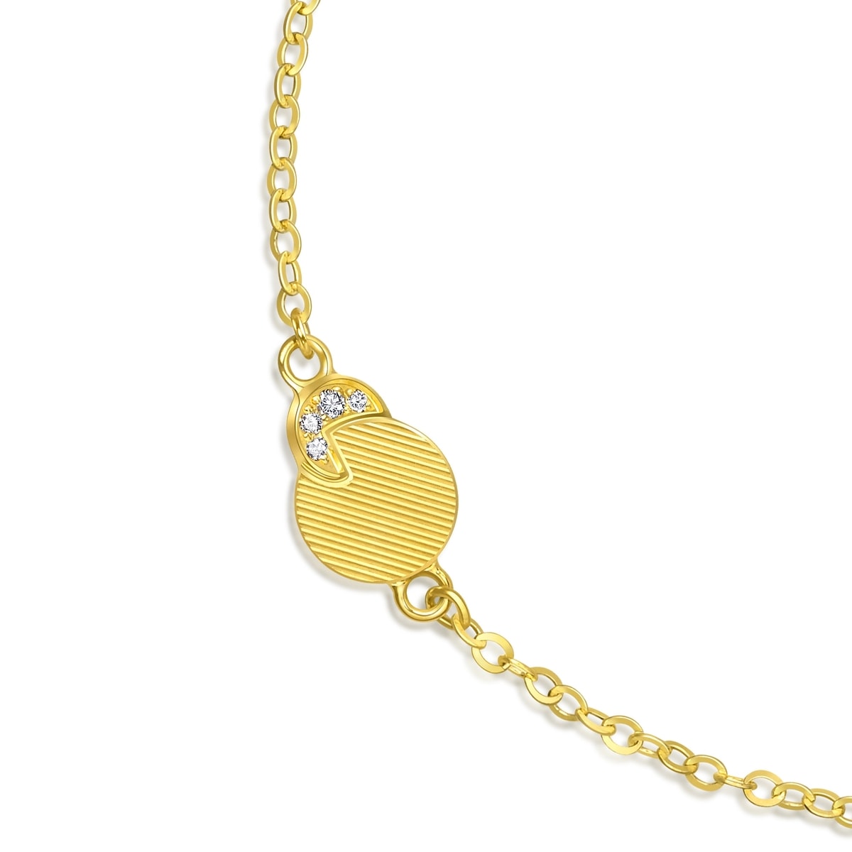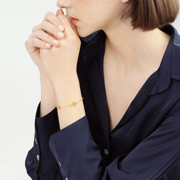 This 999 Gold Bracelet by Chow Sang Sang combines the innovative 5G gold technique for enhanced durability, with two differently textured discs—one with micro diamond settings and the other with a refined pattern—adding an understated elegance to everyday style.