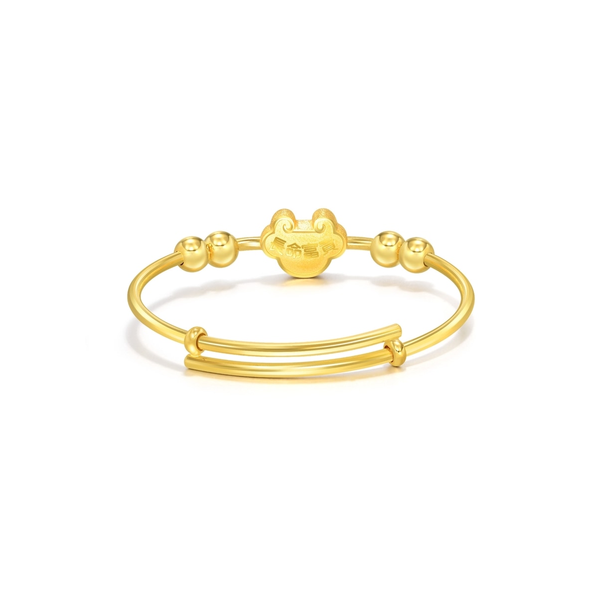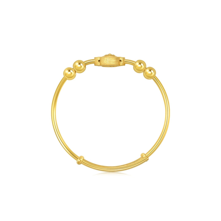 This New Born 999.9 Gold Bangle by Chow Sang Sang showcases the baby dragon and Chinese Ruyi lock design, crafted using mold casting technique. It symbolizes wishes for a newborn's good health, wealth, and prosperity. The intricate baby dragon is on the front, while the back features an engraved auspicious phrase.