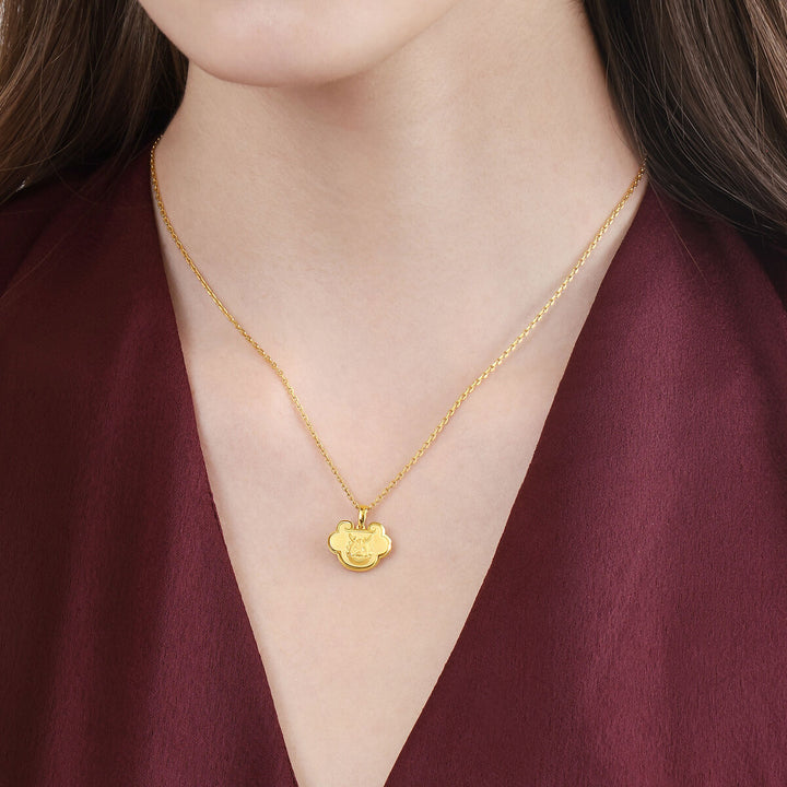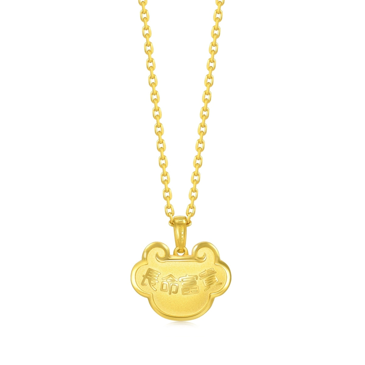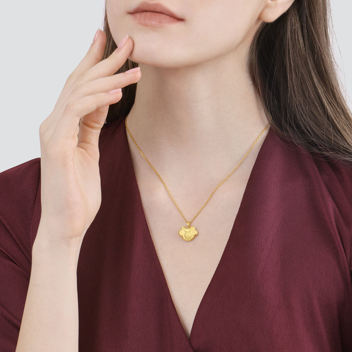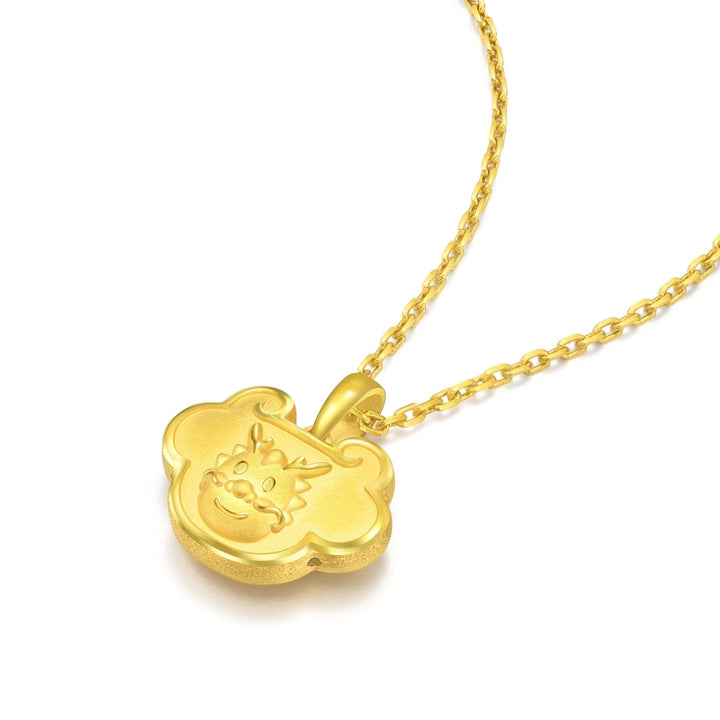This New Born 999.9 Gold Pendant by Chow Sang Sang features the Chinese Ruyi lock and baby dragon, crafted with precision using mold casting technique. The front showcases a baby dragon, while the back is engraved with an auspicious phrase, symbolizing blessings for the newborn's health and prosperity.