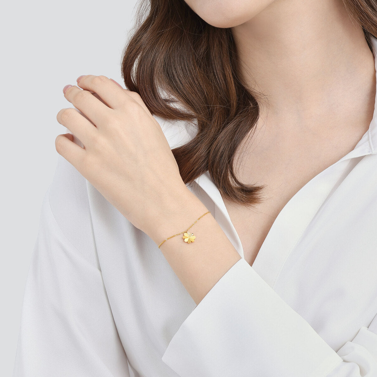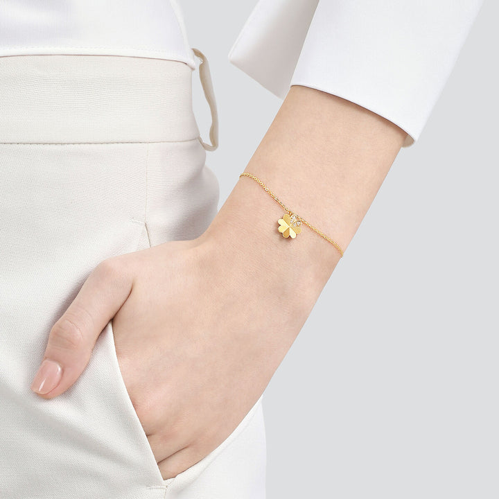 This 999 Gold Bracelet by Chow Sang Sang showcases a four-leaf clover design with micro diamond settings, symbolizing enduring good luck. The hard solid gold technique enhances the material’s hardness, making this bracelet both charming and durable.