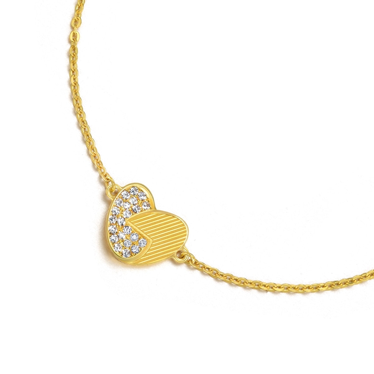 This 999 Gold Diamond Bracelet by Chow Sang Sang features a heart-shaped puzzle design. One half of the heart is adorned with micro pavé diamond settings, while the other half features intricate patterns. Crafted with the hard solid gold technique, this romantic bracelet adds a stylish touch to any look.