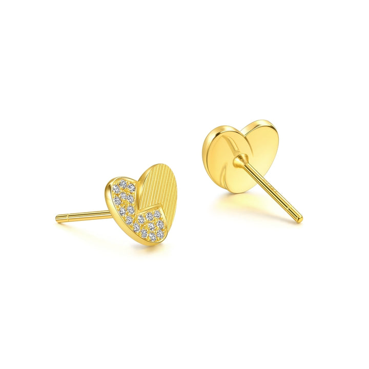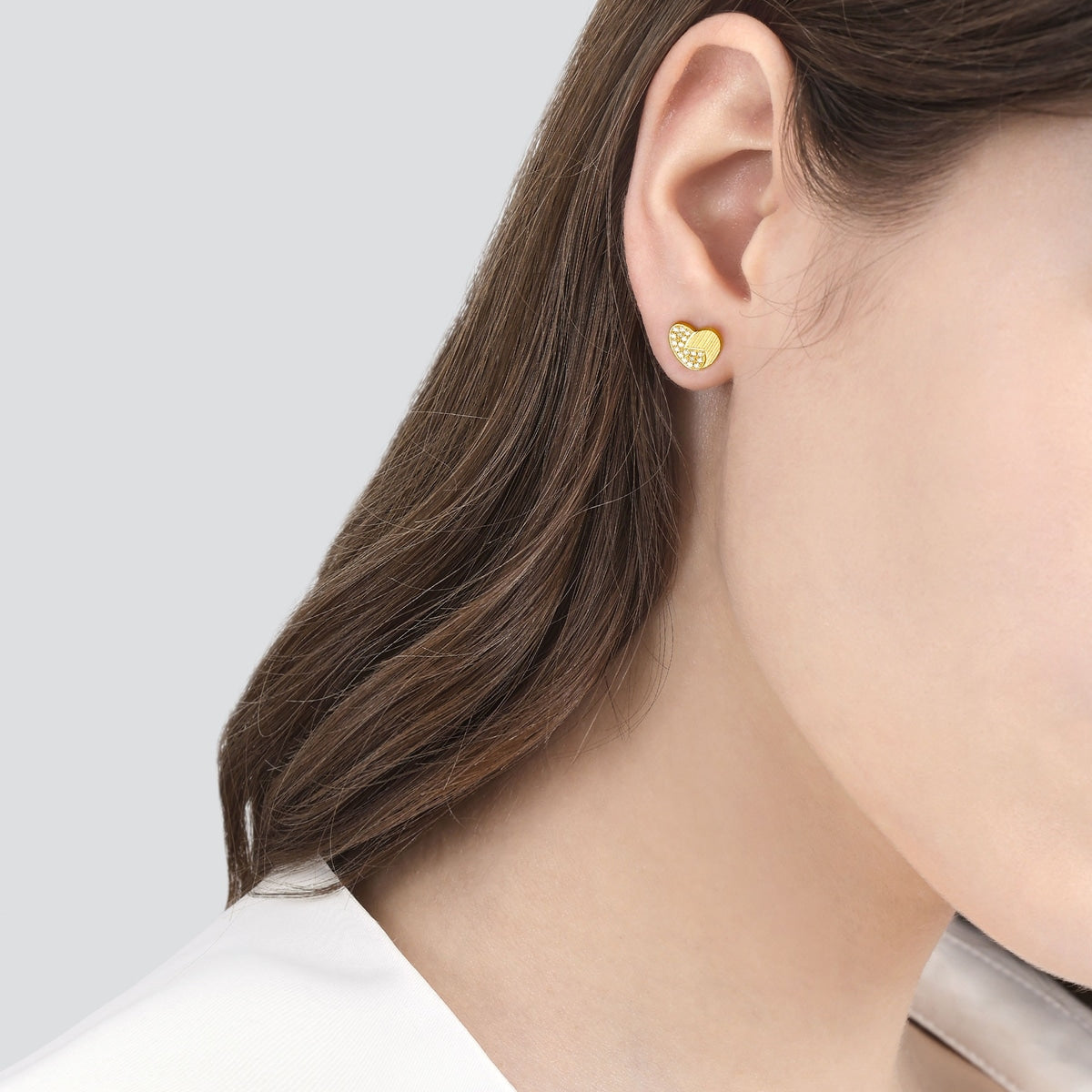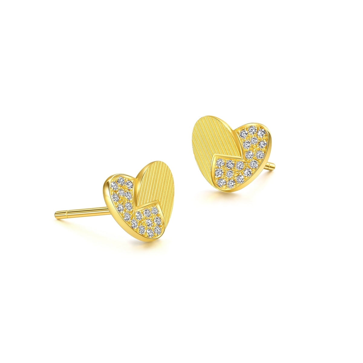 These 999 Gold Diamond Earrings by Chow Sang Sang feature a heart-shaped puzzle design. One half is set with micro pavé diamonds, while the other half showcases intricate patterns, creating a romantic and stylish piece for everyday wear.