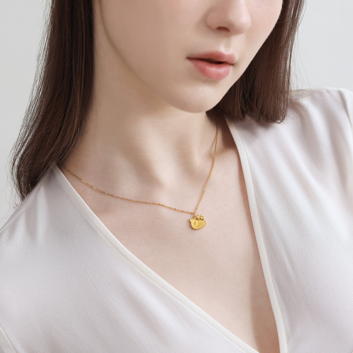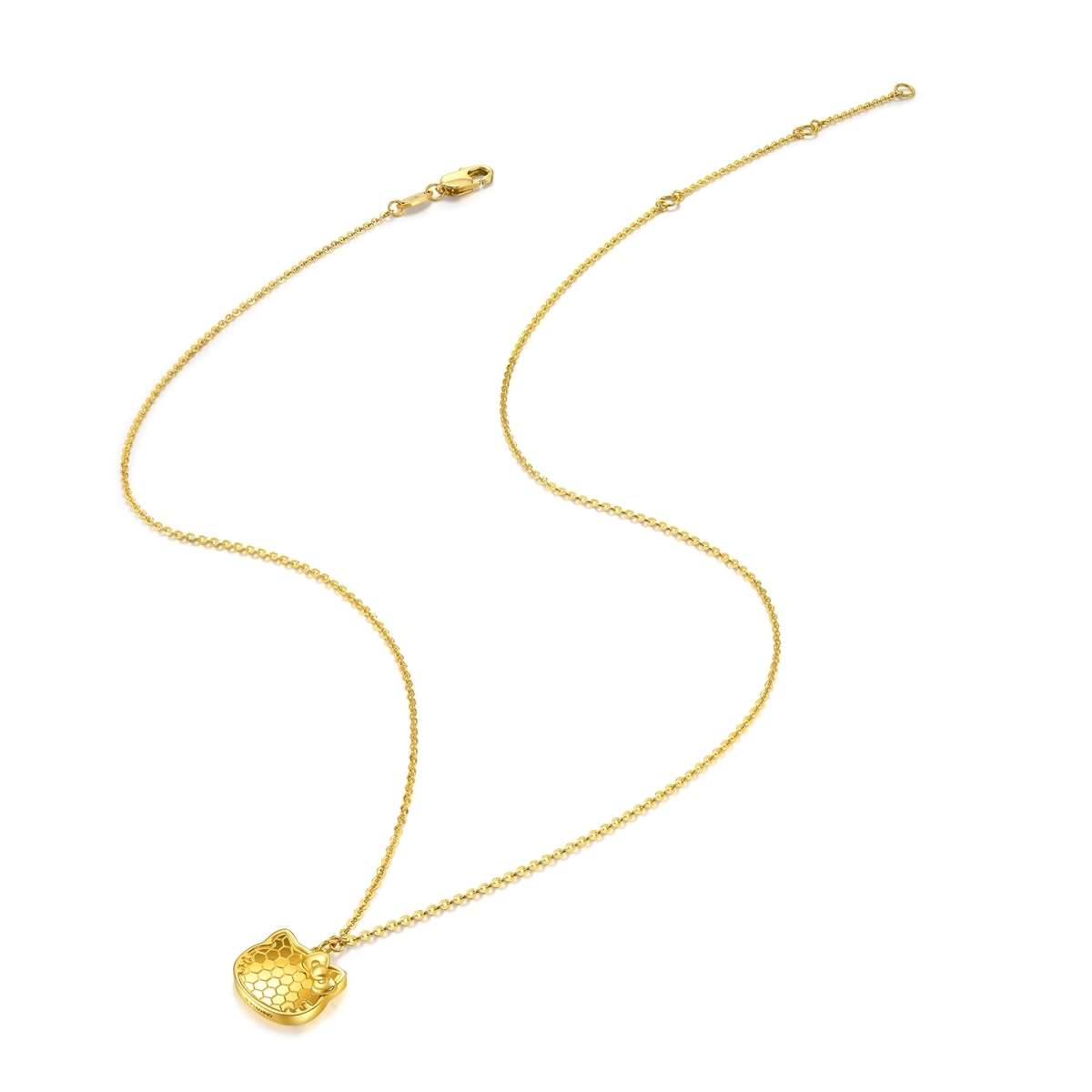 This Hello Kitty 999 Gold Necklace by Chow Sang Sang showcases the iconic character, crafted using the 5G gold technique to enhance gold's hardness. The honeycomb faceted surface creates a high-gloss mirror effect, making this necklace a dazzling and stylish piece, perfect for everyday wear.