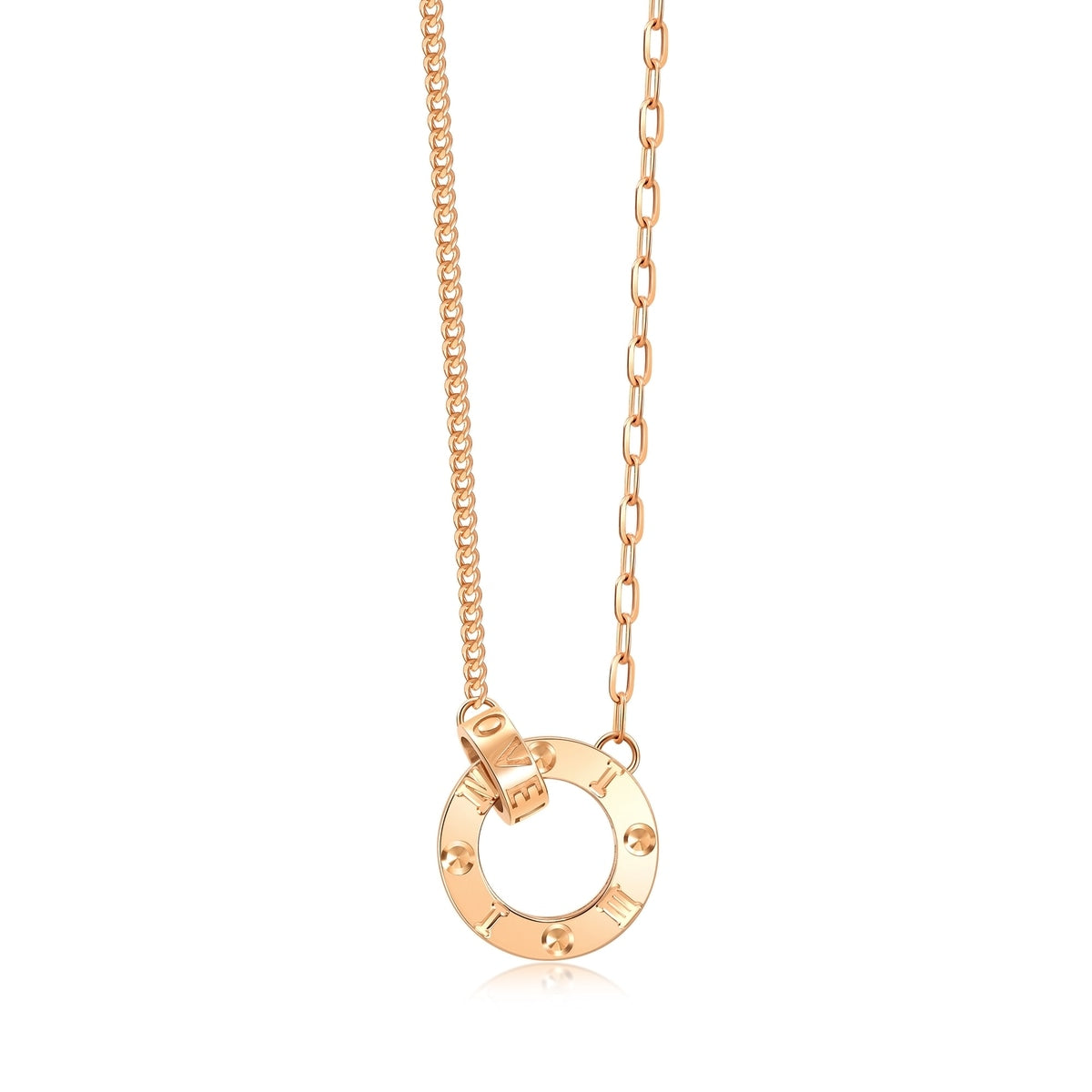 This 18K Rose Gold Necklace by Chow Sang Sang features a circular pendant with geometric facets. The asymmetrical chain with a 'LOVE' clasp adds a dazzling touch of fashion, making it a chic and modern accessory.