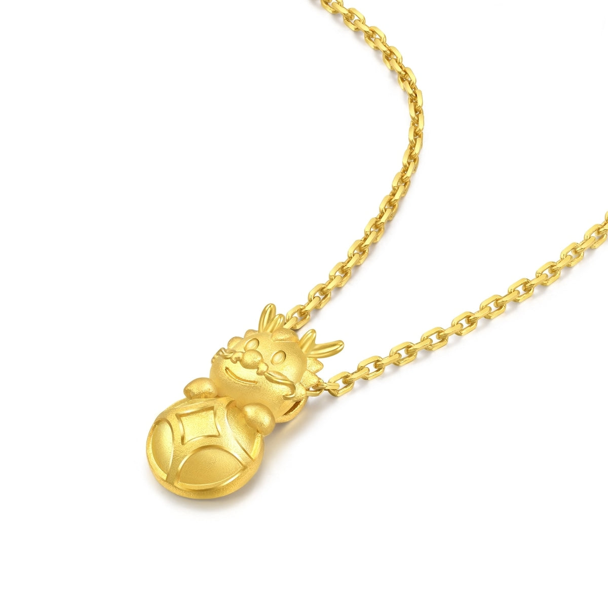 This New Year & Chinese Zodiac 999.9 Gold Pendant by Chow Sang Sang showcases an adorable dragon crafted with mold casting, incorporating coin elements that symbolize wealth and luck, making it a charming piece.