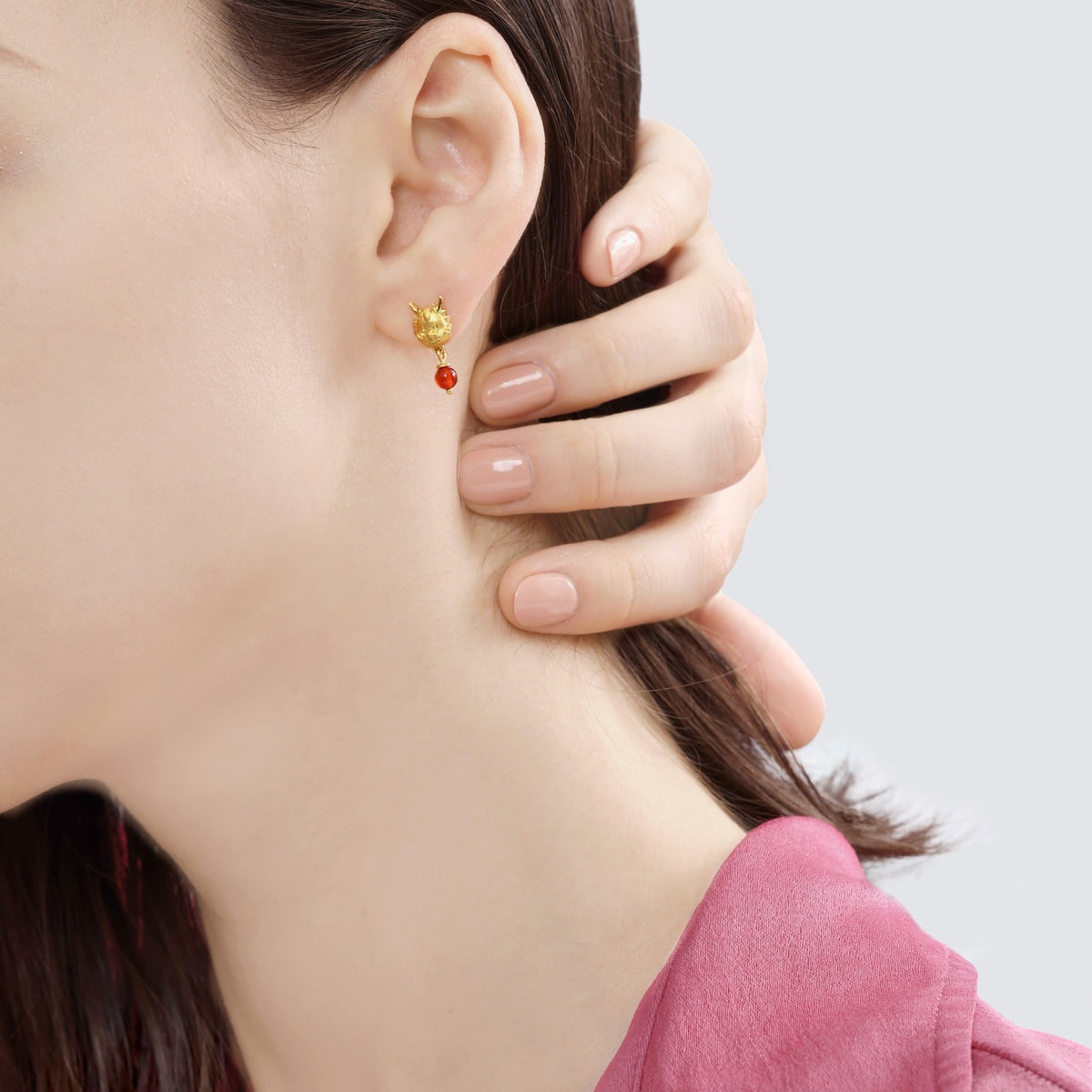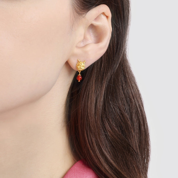 This New Year & Chinese Zodiac 999.9 Gold Single Earring by Chow Sang Sang features a three-dimensional baby dragon design, crafted with mold casting. The addition of natural red agate beads enhances its elegance, symbolizing wealth and luck.